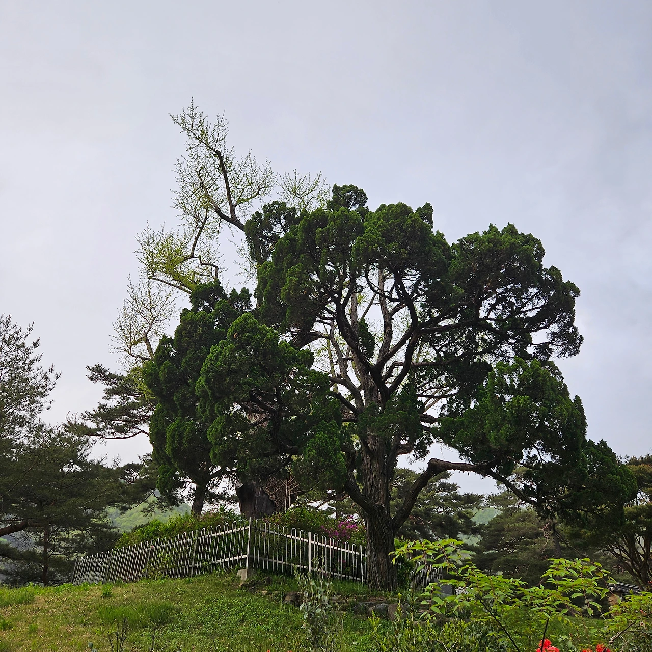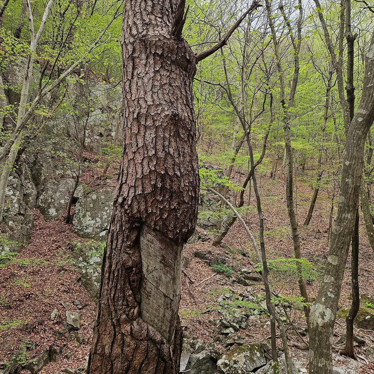 주봉을 바로 앞에 두고 힘차게 오르면서 비가 가까이 왔다는 것을 바람으로 느끼면서 걸었다. 주봉정상에서 인증샷을 남기는데 바람이 휘몰아치고 있다. J가 "우리가 너무 늦게 와서 산신이 노 한 것 같다"라고 하였다. 어쩌면 그런 것인지 모르겠다. 하지만, 비구름이 몰려오고 있다는 증거다. 그래서 서둘러 내려간다. 후리메기 삼거리로 방향을 잡고 내려간다. 이동하면서 가메봉을 가는 길은 산불조심기간이라 입산통제라고 안내되어 있어 지나친다. 사람들이 많이 다닌 흔적이 있다. 소나무에는 1960년대에 송진을 채취한 흔적이 그대로 있다. 그 흔적을 보면서 일제 강점기 시절도 아닌 1960년대에 소나무에서 송진을 채취한 흔적이라고 하니 그래도 그 나무가 60년 이상의 나이를 가진 고목이라고 한다.