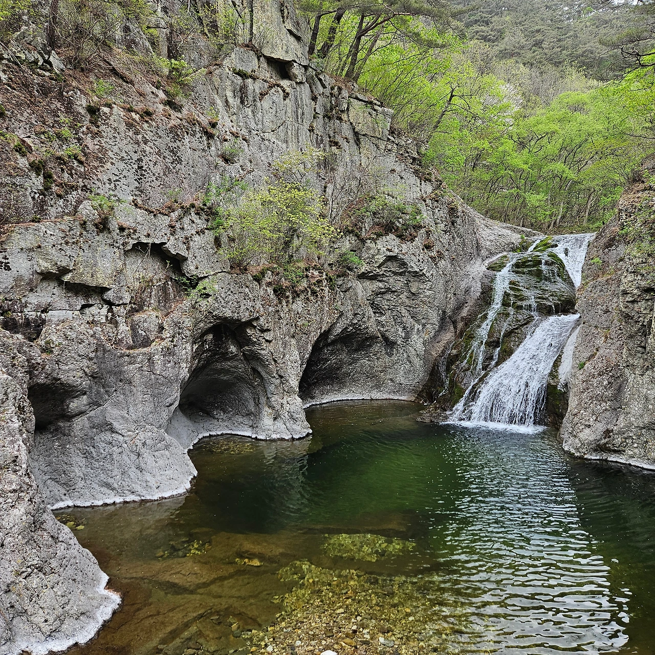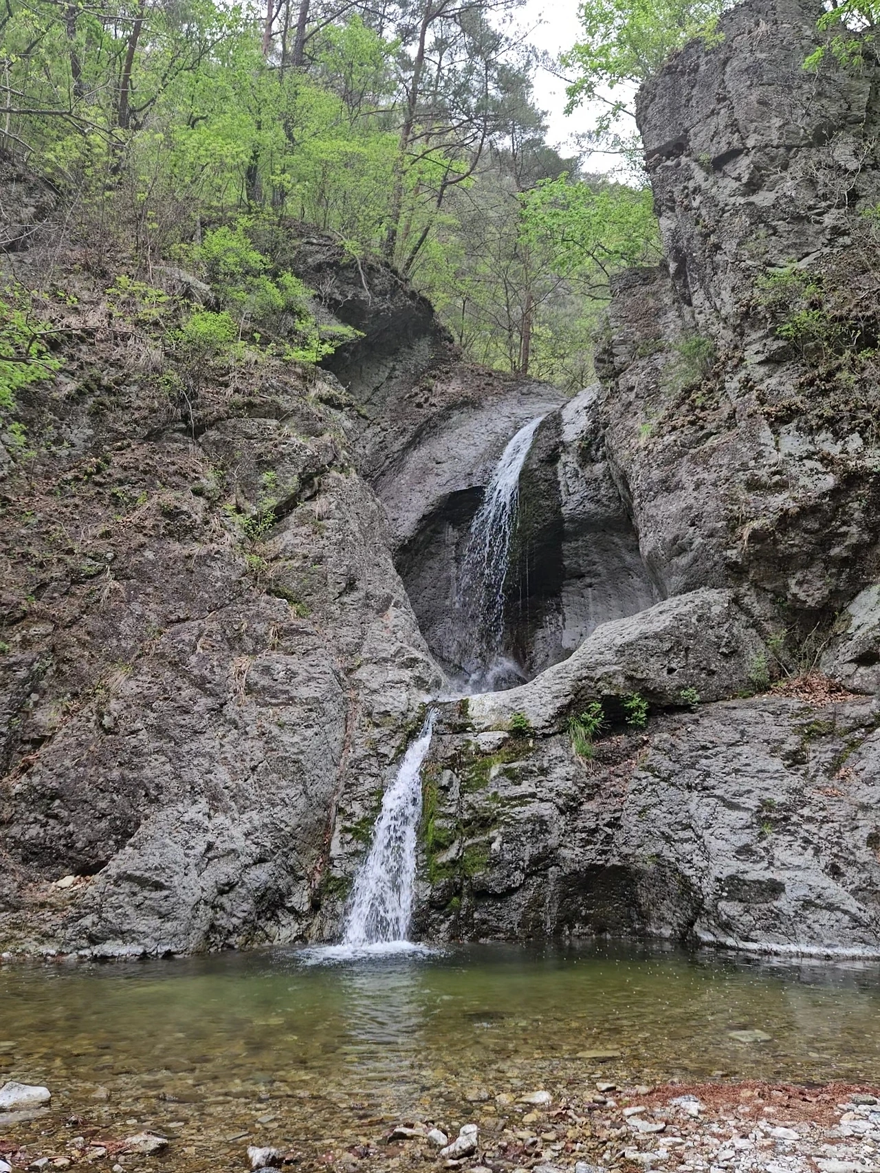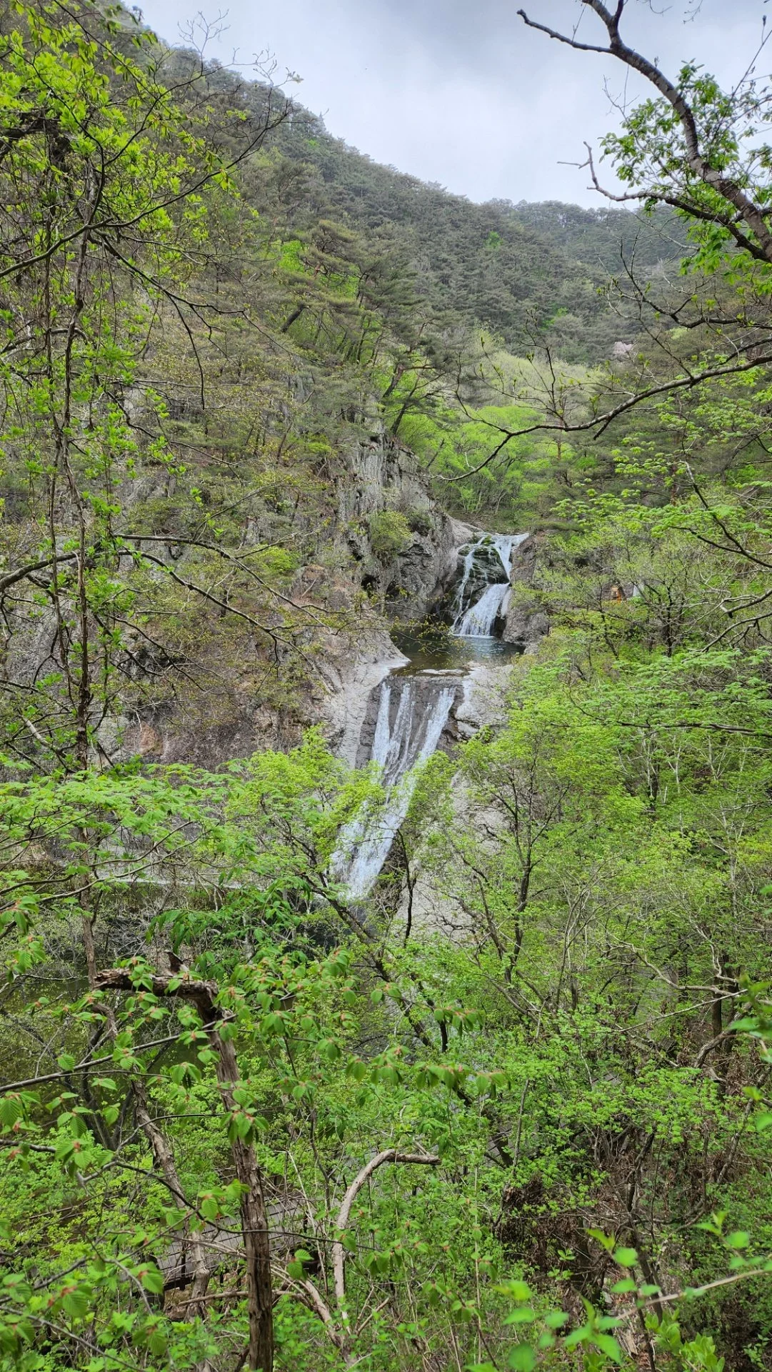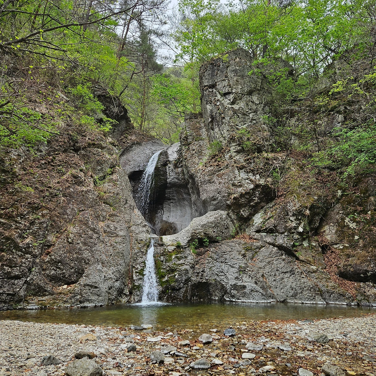 이어서 절구폭포다. 대전사로 내려가는 길에서 왼쪽으로 이어진 계곡 깊숙한 곳에 자리를 잡고 있다. 응회암이 녹아서 만들어졌으며 이곳도 이중폭포다. 절구폭포의 폭호가 절구통처럼 만들어져 있다고 하여 절구폭포다. 여름철 이 계곡에 들어오면 시원함의 극치다. 비가 오지만 그 비를 맞으면서 이곳에 온 사람들이 인증을 남기고 떠난다. 우리는 동영상까지 남긴다. 그 우람한 소리가 좋다.