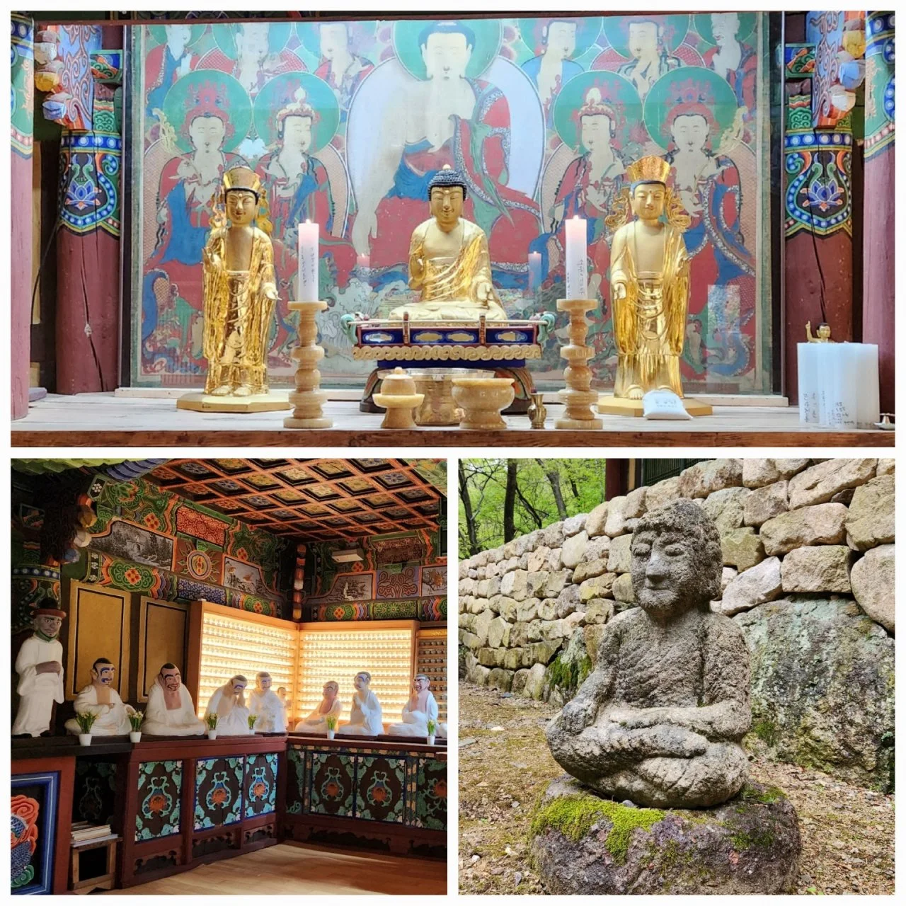 연화봉, 병풍바위, 급수대 등이 전망대 앞을 지키고 있다. 그 바위들이 지키고 있는 산세는 가히 우리나라에 3대 암릉산이라고 할 수 있을 것이다. 설악산과 같이 릿지하는 사람들도 오를 수 없는 산이 주왕산이라고 할 수 있을 것이다. 급수대에 물이 흐른 흔적이 역력하다. 주왕암보다는 주왕굴이 유명하니 주왕굴로 가면서 주왕암을 본다고 할 것이다. 주왕굴은 주왕암의 산신각으로 활용이 된다. 주왕암에는 산신각이 두 곳이다. 절문을 통과하면 칠성각과 함께 산식각이 산 위에 보인다. 내가 처음에 왔을 때 주왕굴이 산신각이라고 하여 그곳에 간 기억이 있다. 이웃한 나한전의 탱화는 1800년경의 회화의 모습을 그대로 보여준다고 하였다. 친구들은 그 나한전 앞의 불상을 담고 그 탱화도 담았다.