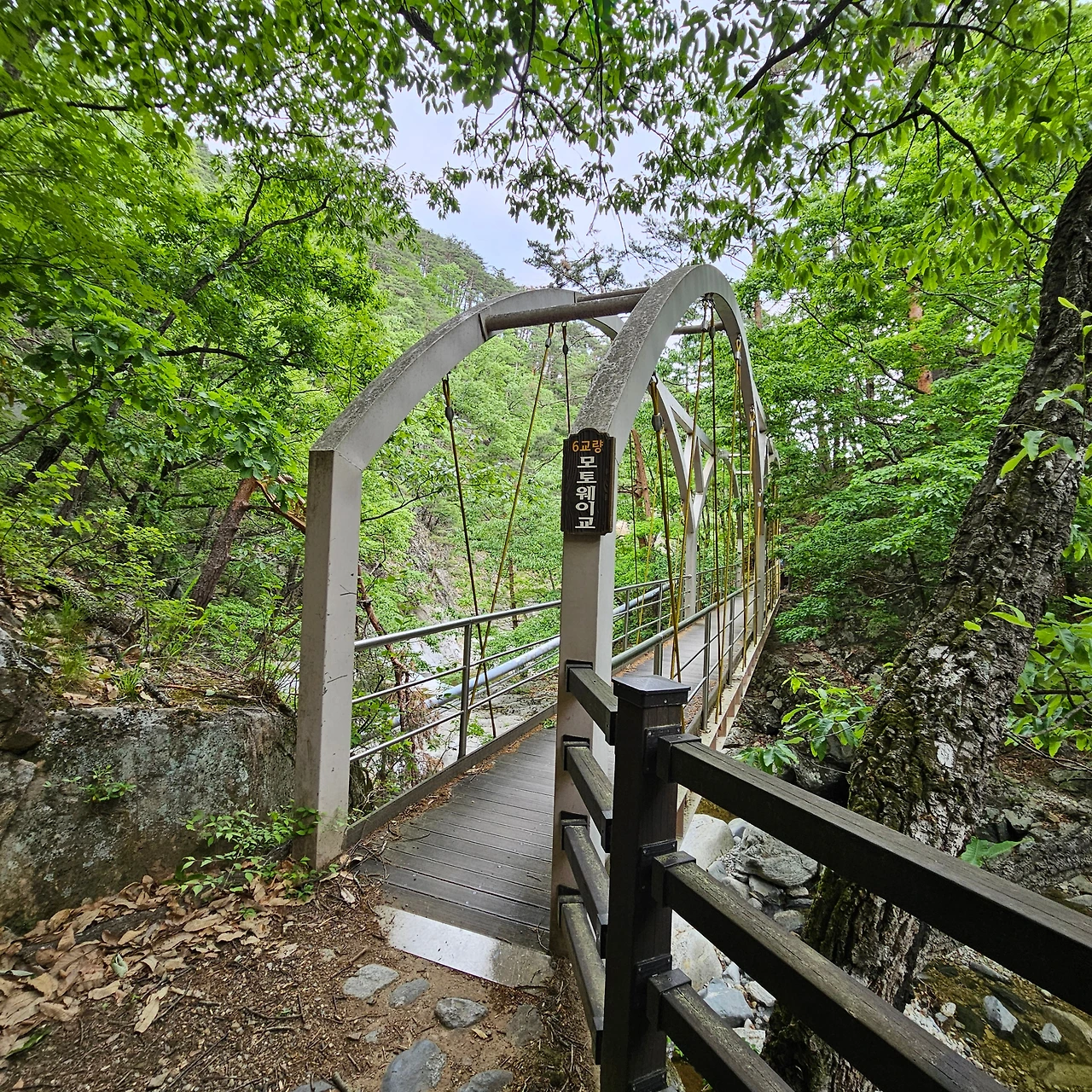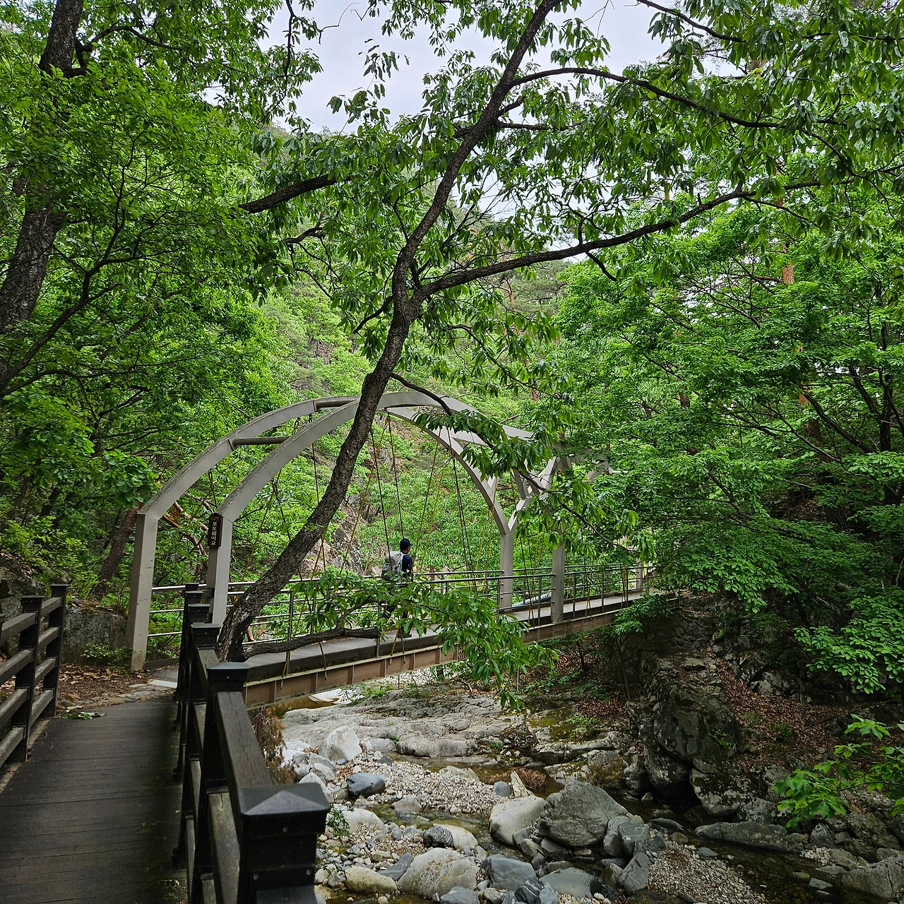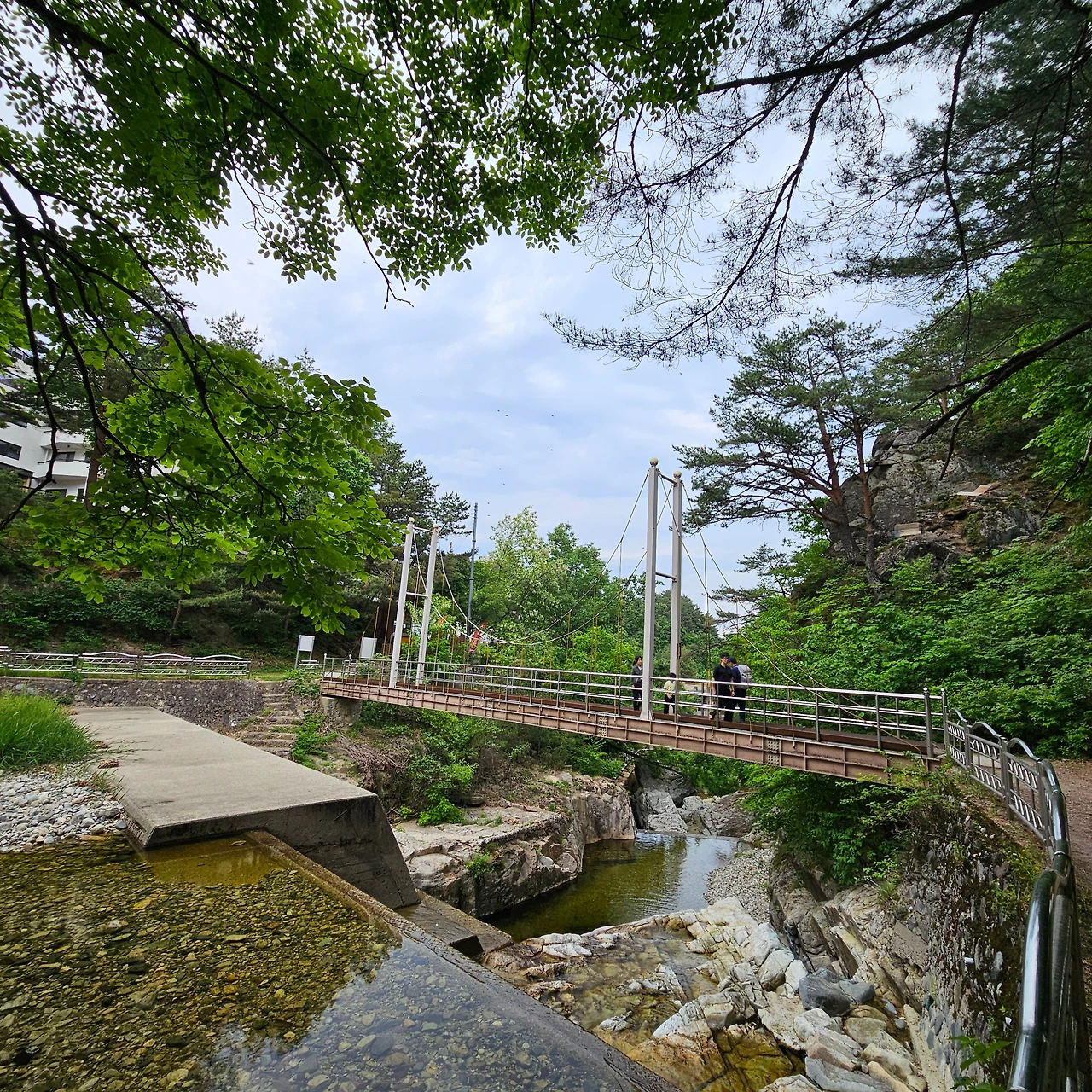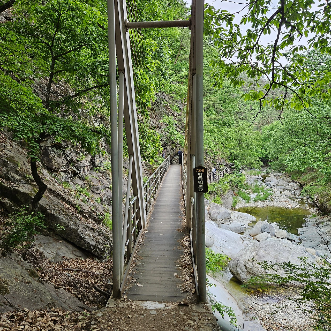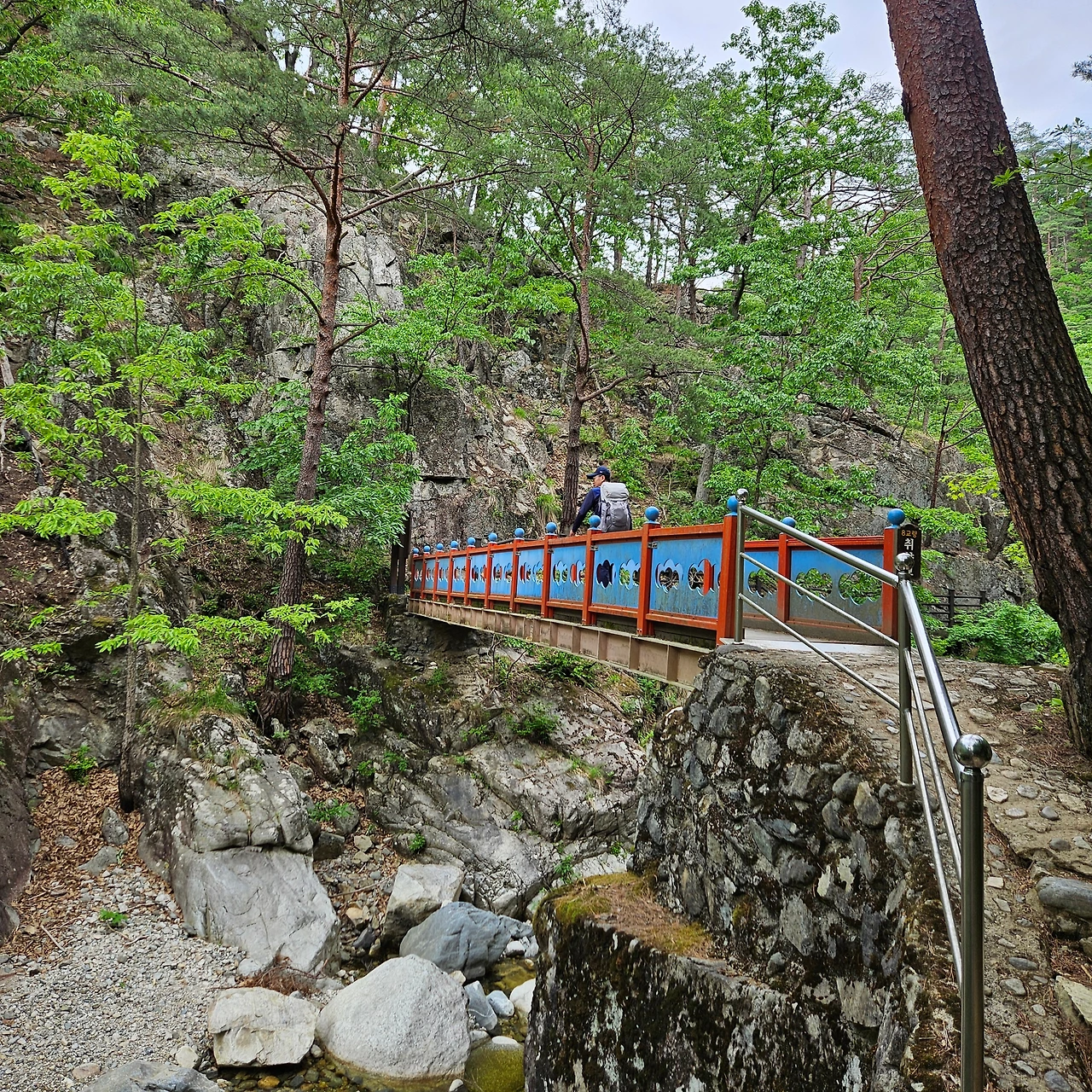 계곡에 도착하였다. 이 계곡에는 특이한 것이 있다. 다리가 13개 있다. 울진군에서 세계에 알려진 다리 13개를 축소하여서 계곡을 넘나드는 곳에 설치한 것이다. 우리에게 알려진 다리도 있지만 알려지지 않은 다리도 있어 그것을 감상하면서 내려가는 재미가 있다. 그리고 협곡을 지나면서 그 협곡을 즐기면서 지나가는 것이다. 위에서 내려가면서 13번째 다리는 포스교이다. 영국에 있는 다리 포스교이다. 포스교는 최초의 강철 소재 교량이라고 한다. 이 다리는 그 당시 티교가 붕괴 후 건설되어서 무척이나 튼튼하게 건설되었다고 한다. 이곳의 모습도 그대로다. 12번째 다리는 중국의 장제이교, 11번째는 일본의 도모에가와교, 10번째는 영국의 트리니티교, 9번째는 우리나라 불국사에 있는 청운교·백운교, 8번째는 우리나라 경복궁에 있는 취향교, 7번째는 스페인의 알라밀로교, 6번째는 스위스의 모토웨이교, 5번째는 독일의 크세이교, 4번째는 호주의 하버브릿지, 3번째는 프랑스의 노르망딩교, 2번째는 우리나라의 서강대교, 1번째는 미국의 금문교였다. J가 원래의 다리를 정리한 사진을 잘 찾아주면서 이야기를 한다. 우리는 그것을 듣는다. 준비성이 뛰어나다고 해야 할 것이다.