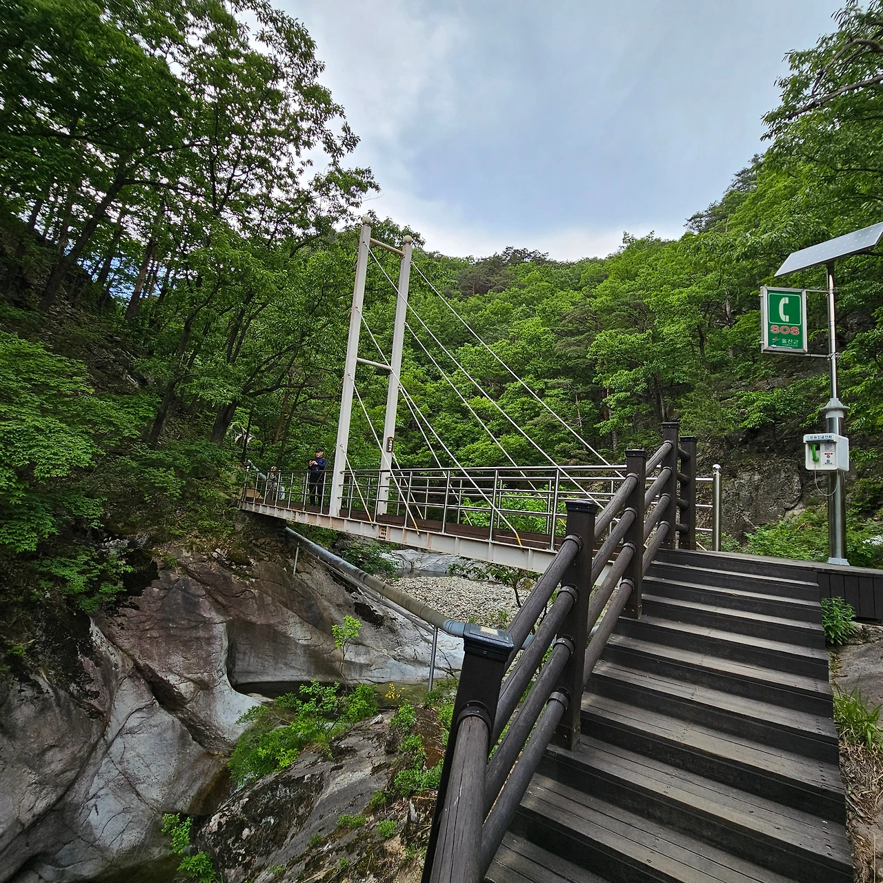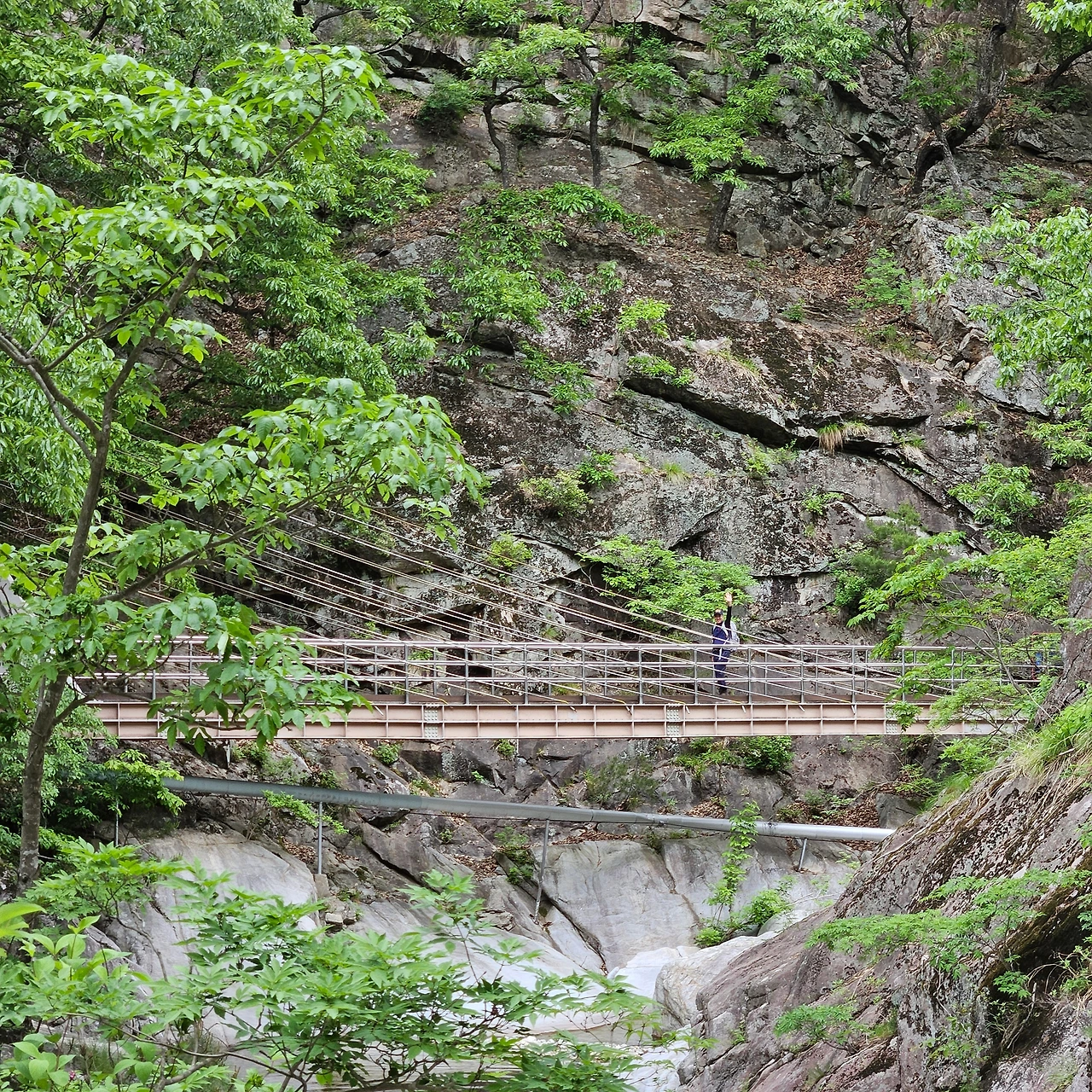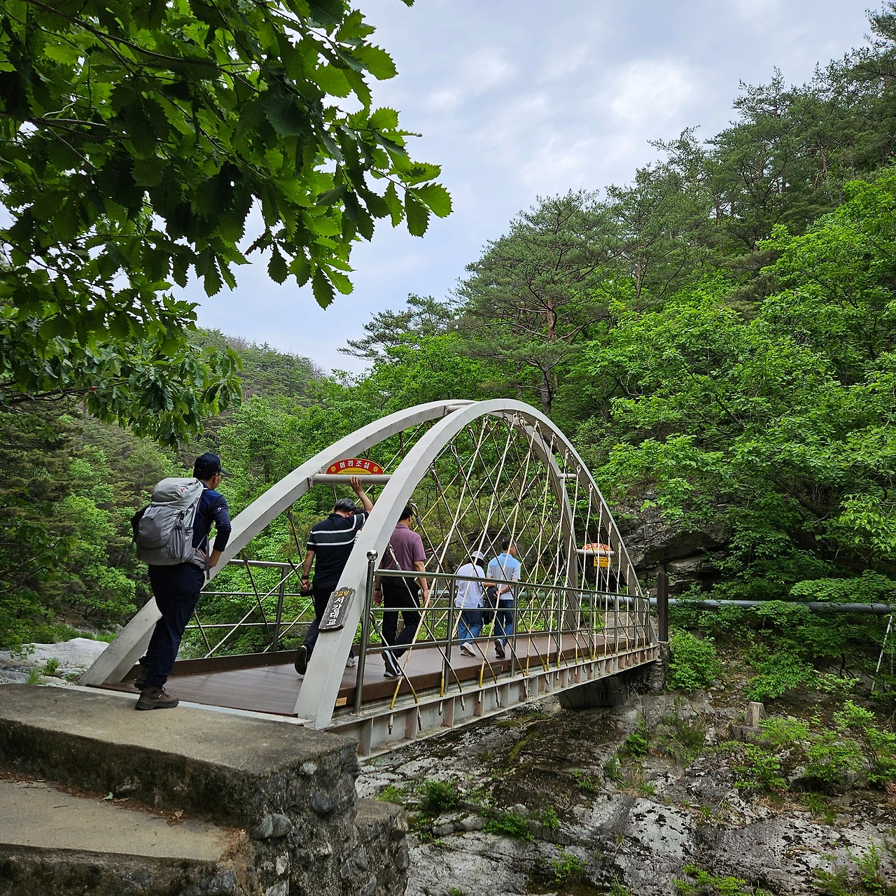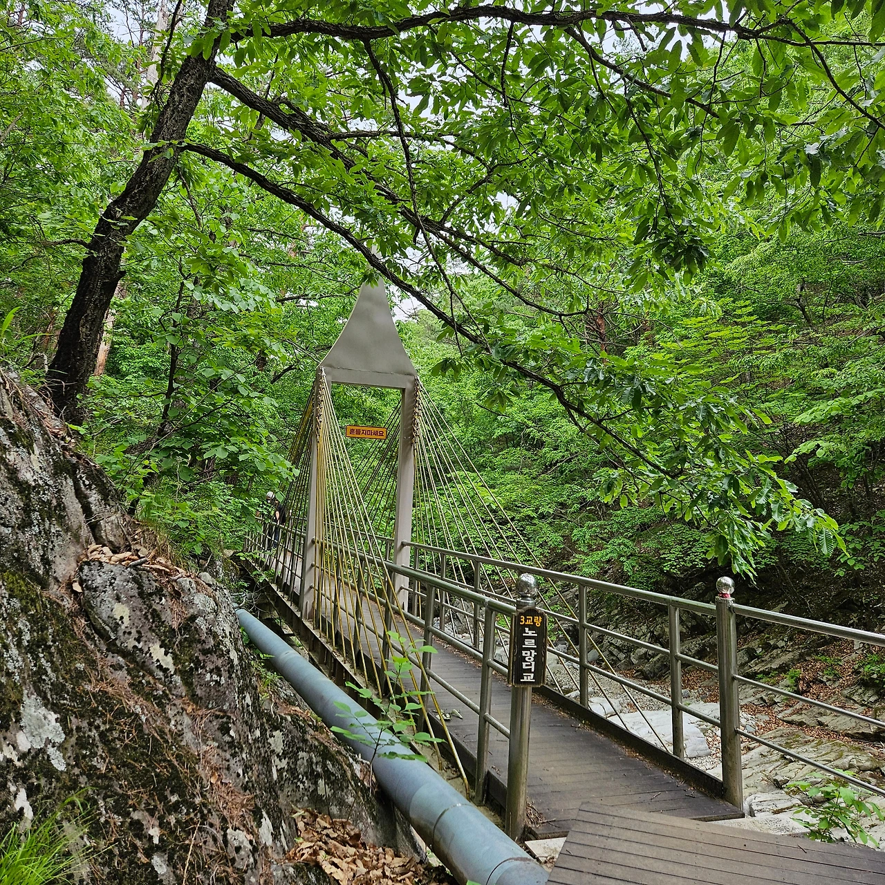 계곡에 도착하였다. 이 계곡에는 특이한 것이 있다. 다리가 13개 있다. 울진군에서 세계에 알려진 다리 13개를 축소하여서 계곡을 넘나드는 곳에 설치한 것이다. 우리에게 알려진 다리도 있지만 알려지지 않은 다리도 있어 그것을 감상하면서 내려가는 재미가 있다. 그리고 협곡을 지나면서 그 협곡을 즐기면서 지나가는 것이다. 위에서 내려가면서 13번째 다리는 포스교이다. 영국에 있는 다리 포스교이다. 포스교는 최초의 강철 소재 교량이라고 한다. 이 다리는 그 당시 티교가 붕괴 후 건설되어서 무척이나 튼튼하게 건설되었다고 한다. 이곳의 모습도 그대로다. 12번째 다리는 중국의 장제이교, 11번째는 일본의 도모에가와교, 10번째는 영국의 트리니티교, 9번째는 우리나라 불국사에 있는 청운교·백운교, 8번째는 우리나라 경복궁에 있는 취향교, 7번째는 스페인의 알라밀로교, 6번째는 스위스의 모토웨이교, 5번째는 독일의 크세이교, 4번째는 호주의 하버브릿지, 3번째는 프랑스의 노르망딩교, 2번째는 우리나라의 서강대교, 1번째는 미국의 금문교였다. J가 원래의 다리를 정리한 사진을 잘 찾아주면서 이야기를 한다. 우리는 그것을 듣는다. 준비성이 뛰어나다고 해야 할 것이다.