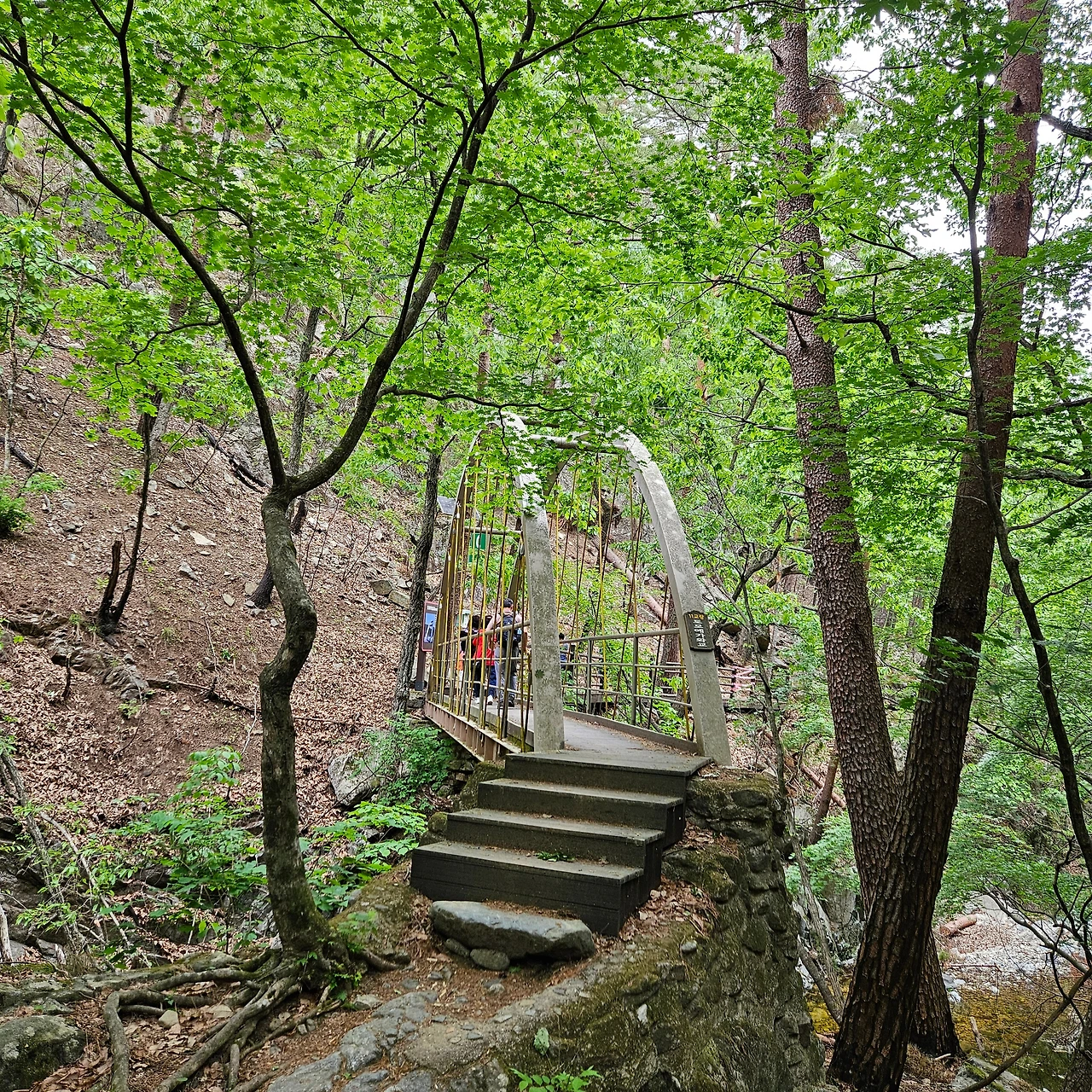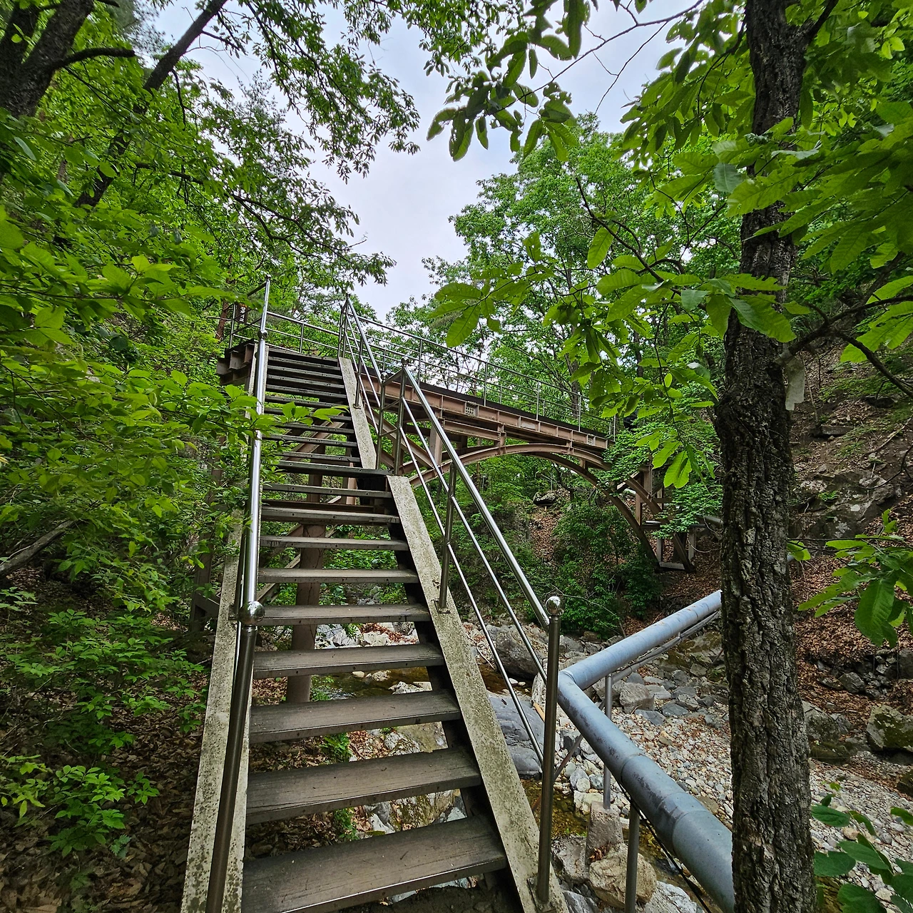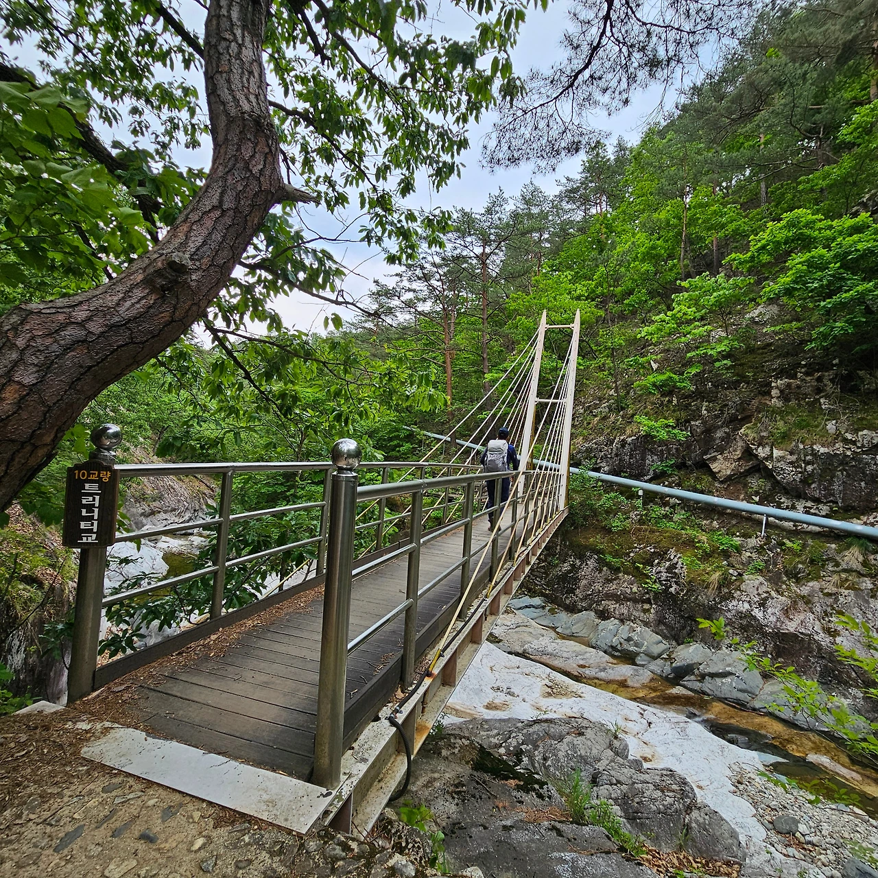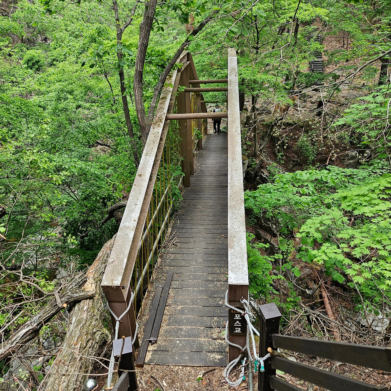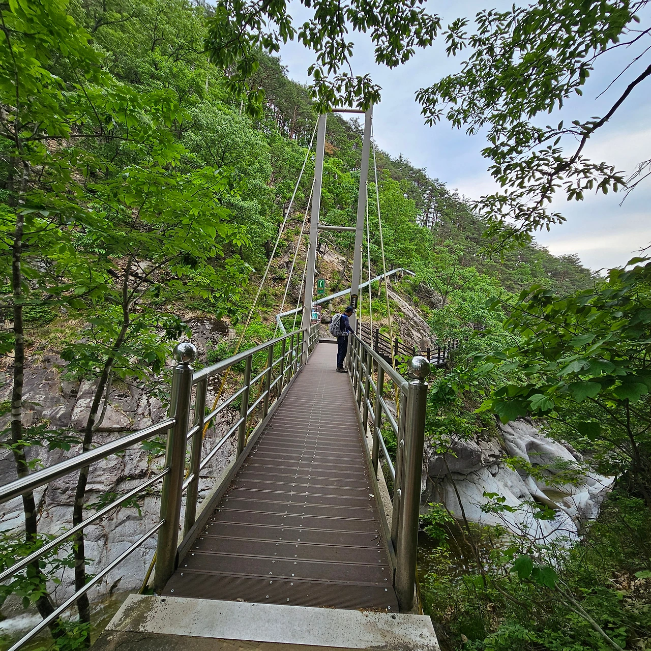 계곡에 도착하였다. 이 계곡에는 특이한 것이 있다. 다리가 13개 있다. 울진군에서 세계에 알려진 다리 13개를 축소하여서 계곡을 넘나드는 곳에 설치한 것이다. 우리에게 알려진 다리도 있지만 알려지지 않은 다리도 있어 그것을 감상하면서 내려가는 재미가 있다. 그리고 협곡을 지나면서 그 협곡을 즐기면서 지나가는 것이다. 위에서 내려가면서 13번째 다리는 포스교이다. 영국에 있는 다리 포스교이다. 포스교는 최초의 강철 소재 교량이라고 한다. 이 다리는 그 당시 티교가 붕괴 후 건설되어서 무척이나 튼튼하게 건설되었다고 한다. 이곳의 모습도 그대로다. 12번째 다리는 중국의 장제이교, 11번째는 일본의 도모에가와교, 10번째는 영국의 트리니티교, 9번째는 우리나라 불국사에 있는 청운교·백운교, 8번째는 우리나라 경복궁에 있는 취향교, 7번째는 스페인의 알라밀로교, 6번째는 스위스의 모토웨이교, 5번째는 독일의 크세이교, 4번째는 호주의 하버브릿지, 3번째는 프랑스의 노르망딩교, 2번째는 우리나라의 서강대교, 1번째는 미국의 금문교였다. J가 원래의 다리를 정리한 사진을 잘 찾아주면서 이야기를 한다. 우리는 그것을 듣는다. 준비성이 뛰어나다고 해야 할 것이다.