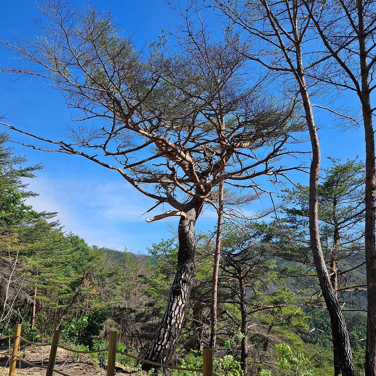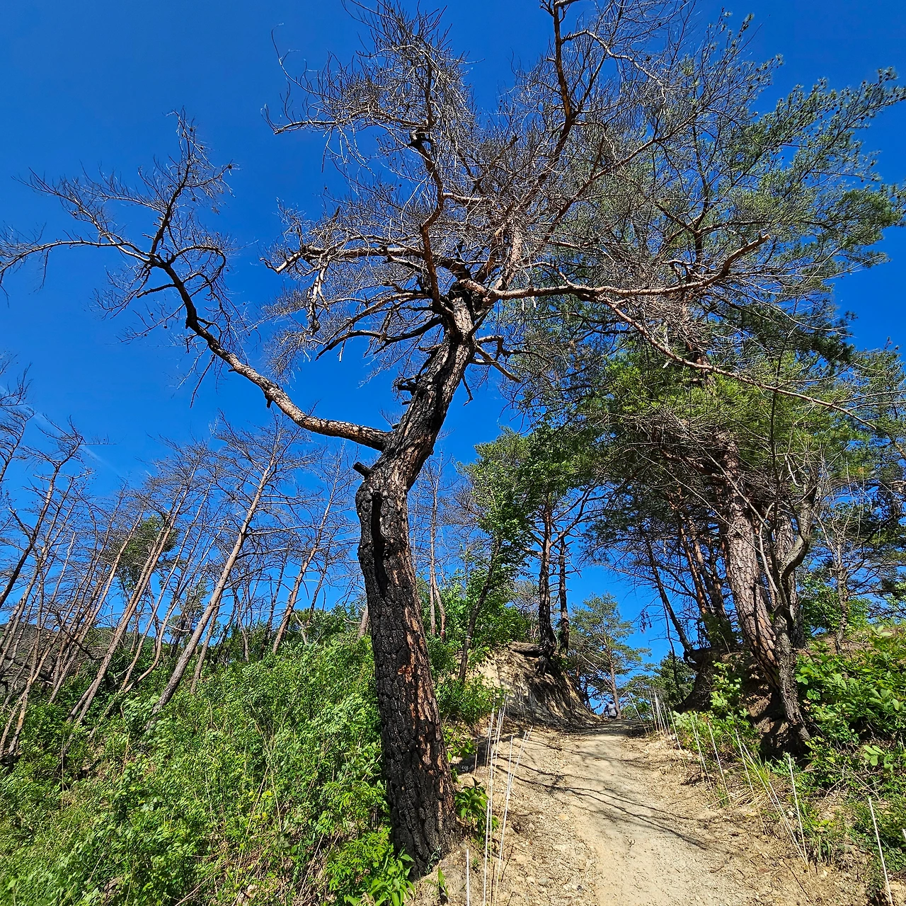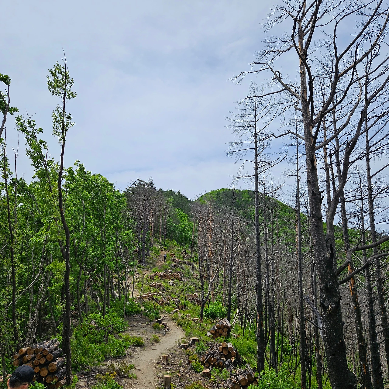 산불의 영향이 마을의 집 바로 뒤까지 온 모습도 볼 수 있고 이산 저산에 죽은 고사목이 그 흔적을 남기면서 그대로 서 있는 모습을 볼 수 있었다. 덕구온천으로 가는 내내 그러한 모습이 계속이다. 산불의 흔적 중앙을 가로질러가는 것이다. 응봉산을 오르는 내내 그러한 모습을 계속 볼 수 있었다. 자연이 치유하고 인간이 약간 보태는 모습이 있다. 그래도 살아남은 나무들이 우리들에게 유구한 역사를 보여줄 것이다.