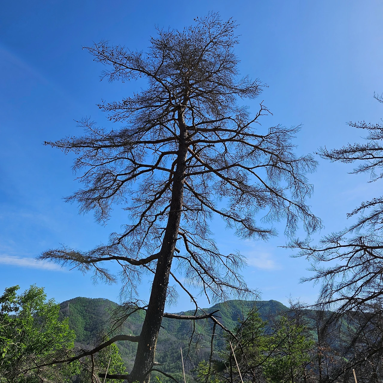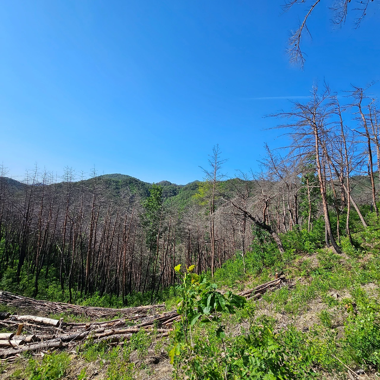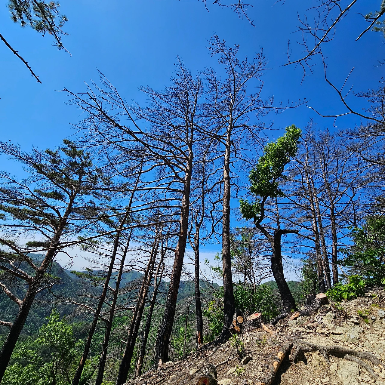 산불의 영향이 마을의 집 바로 뒤까지 온 모습도 볼 수 있고 이산 저산에 죽은 고사목이 그 흔적을 남기면서 그대로 서 있는 모습을 볼 수 있었다. 덕구온천으로 가는 내내 그러한 모습이 계속이다. 산불의 흔적 중앙을 가로질러가는 것이다. 응봉산을 오르는 내내 그러한 모습을 계속 볼 수 있었다. 자연이 치유하고 인간이 약간 보태는 모습이 있다. 그래도 살아남은 나무들이 우리들에게 유구한 역사를 보여줄 것이다.