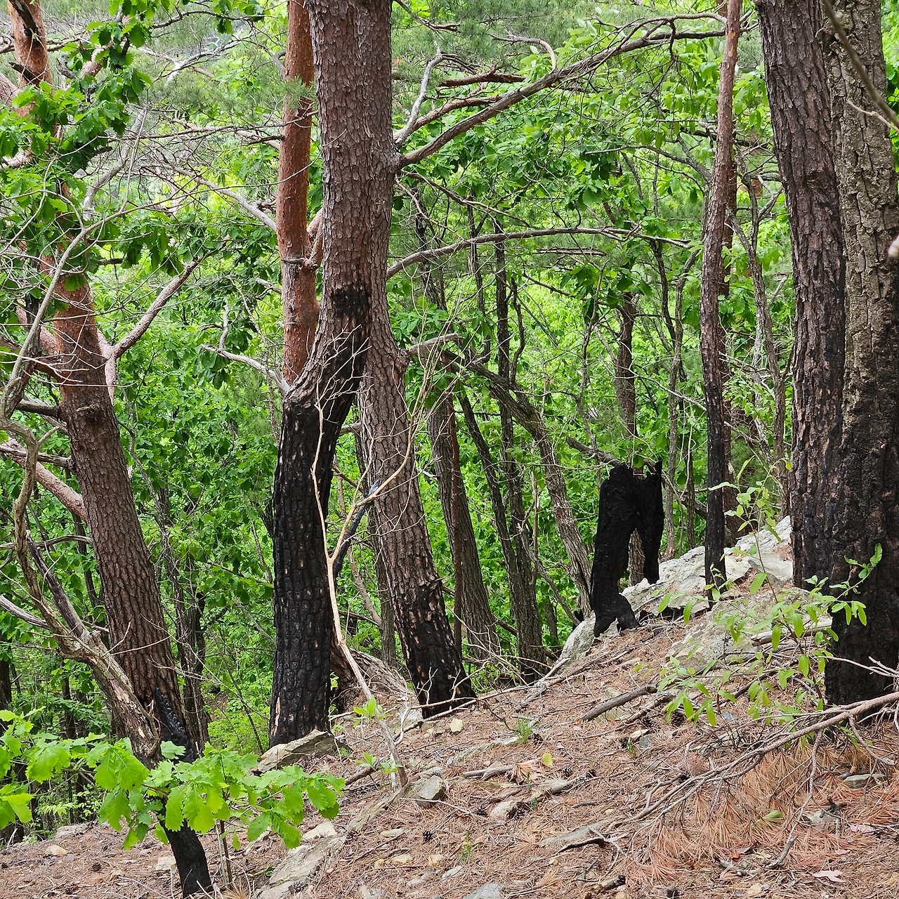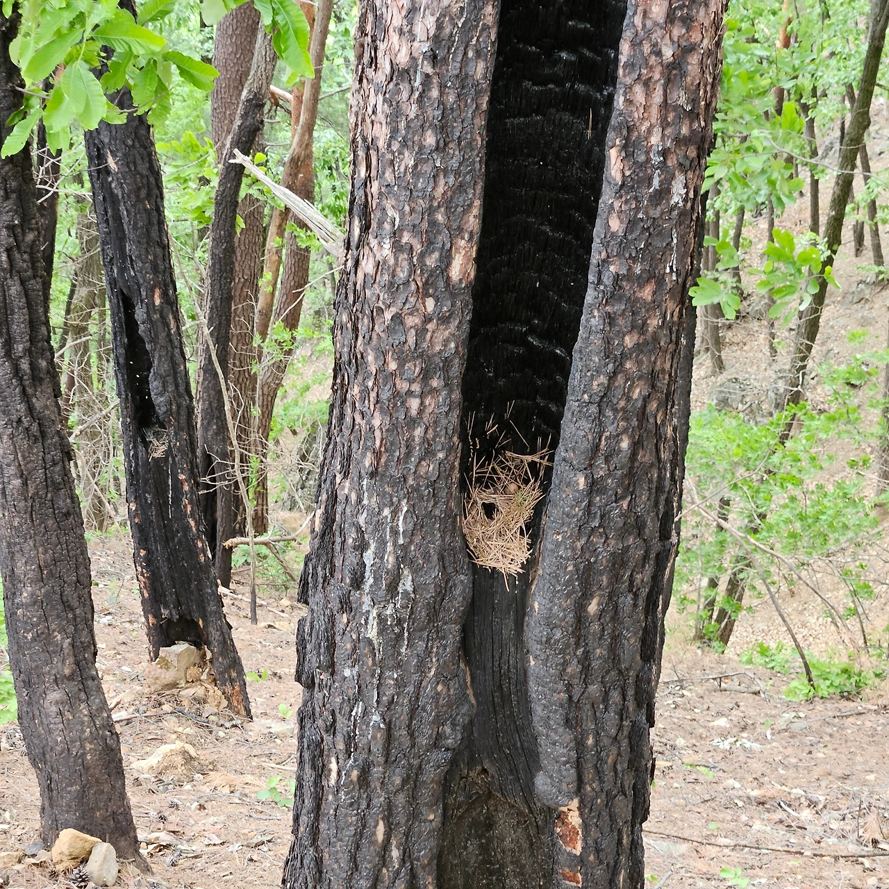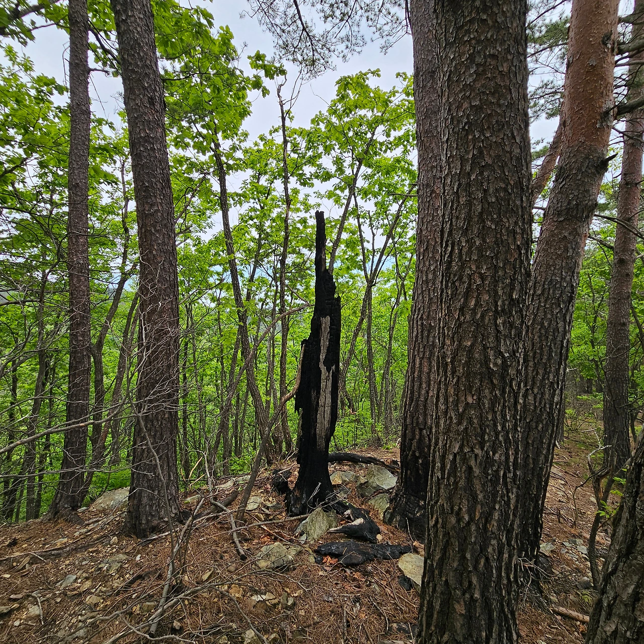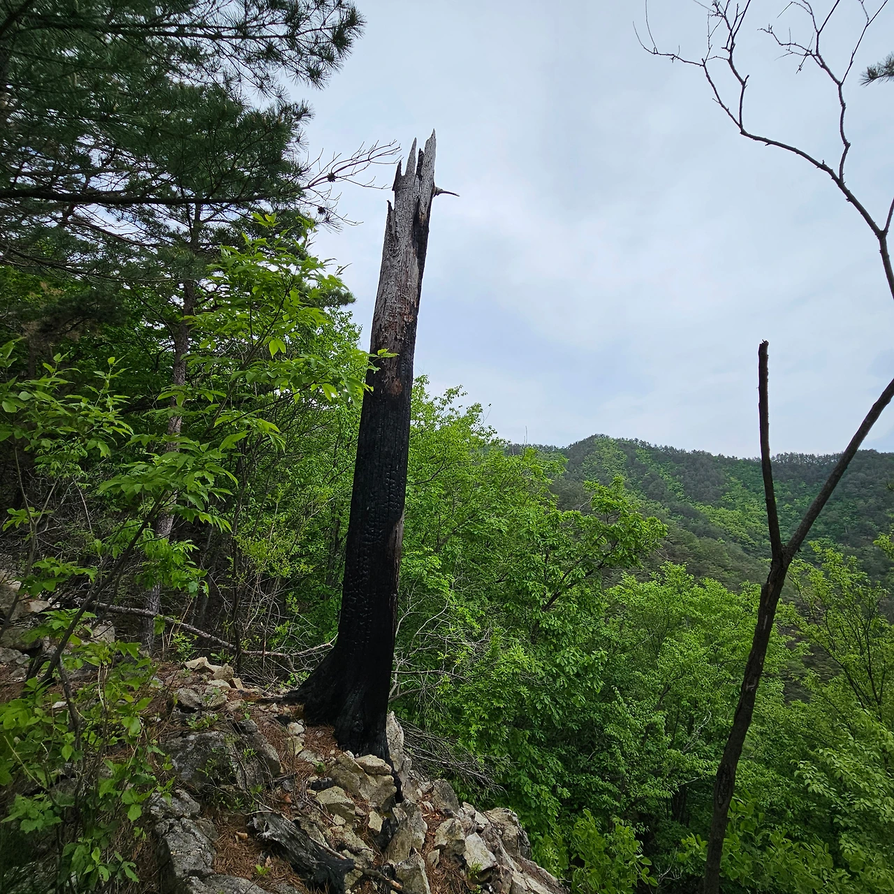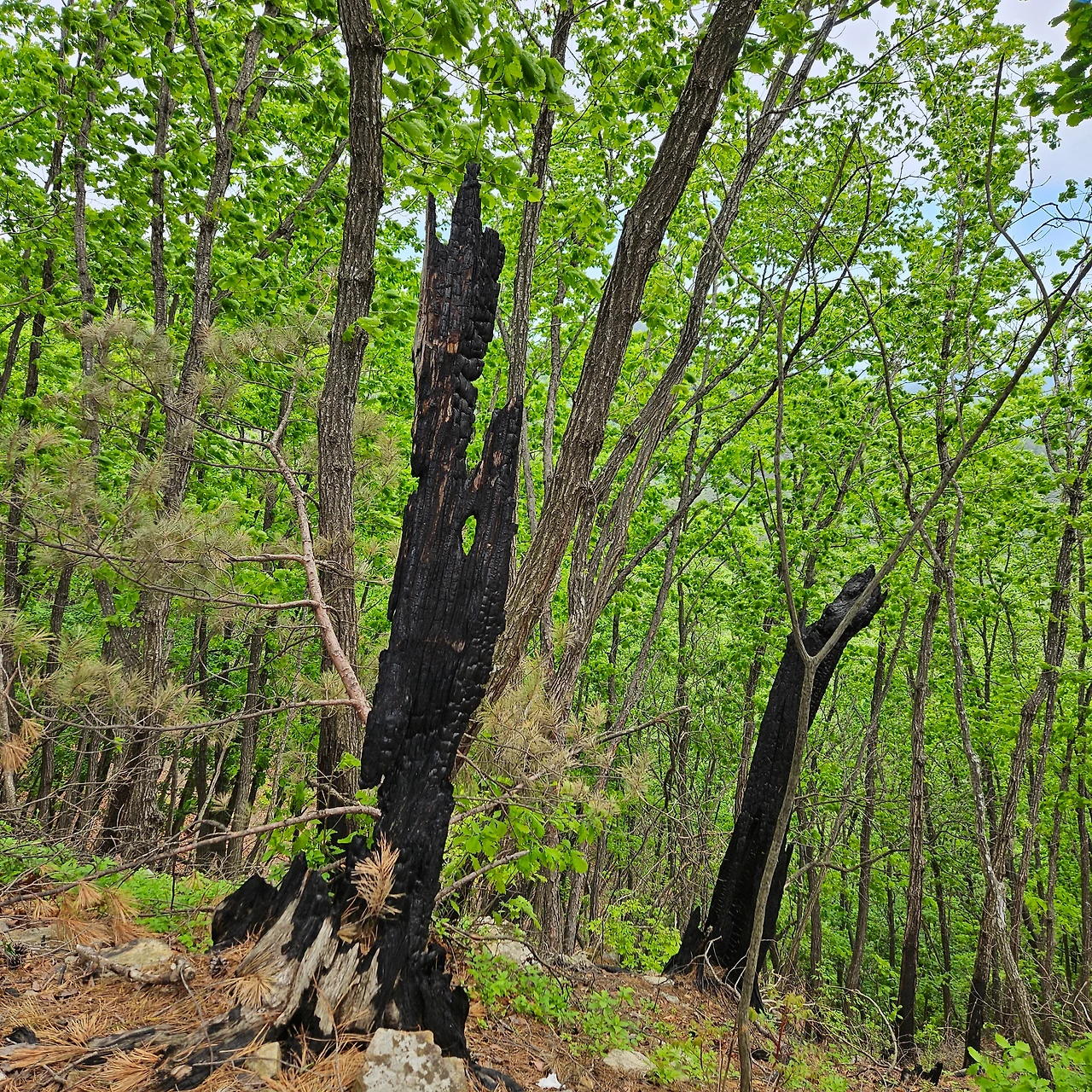 소나무가 산불에 의하여 피해를 보았는데 그곳에 새로운 생명이 자라고 있다. 소나무도 생을 이어가고 있고 새로운 생명이 둥지를 만들어서 새로운 생명 탄생을 예고하고 있다. 산을 내려오면서 야생화가 없다고 하니 H가 말하기를 산불로 인하여 모든 야생화가 타버려 다른 곳에서 날아와야 하는데 아직이다라고 한다. 나도 그것에 동감한다. 3월 산불이 났지만 이제 시작하는 생명이 화마에 모든 것을 날린 것이라고 본다. 자연은 시간이 있다. 그 시간이 지나가면 또 새로운 생명을 부른다고 보아야 할 것이다. 인간이 잘못하여 산불이 났지만, 자연은 그것을 응징하고 새로운 생명을 만들어 나간다.