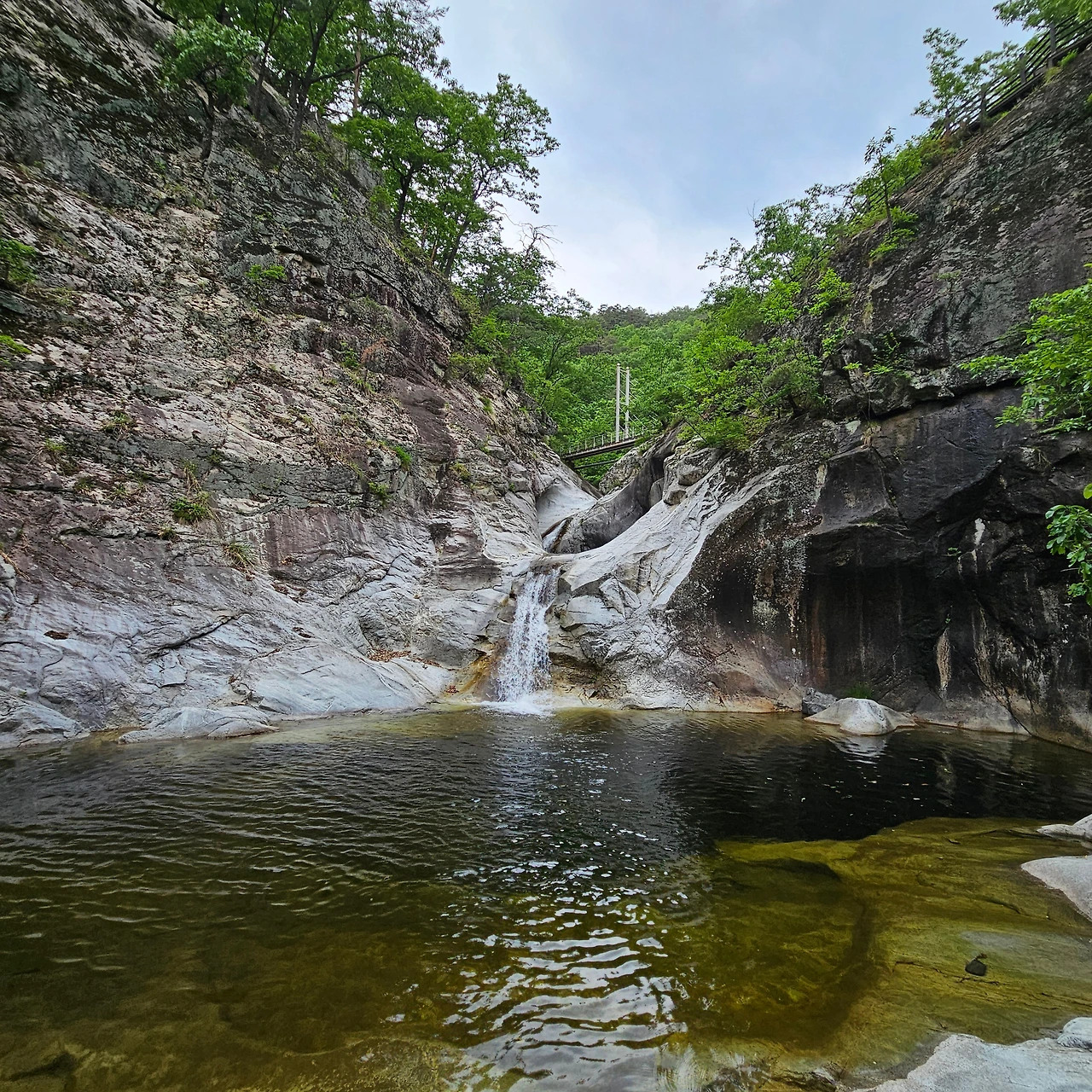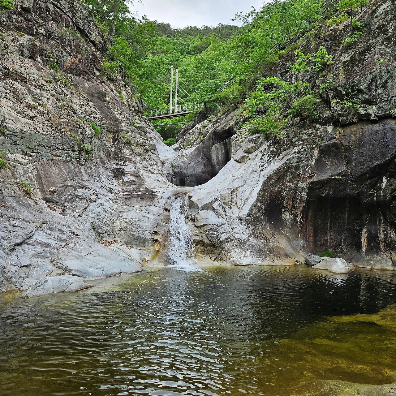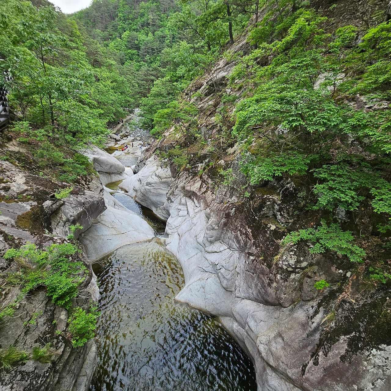 내려오면서 용소폭포와 선녀탕에 도착하였다. H는 폭포에 도착하기 전에 5교량인 크세이교 위에서 내려다보면 상어의 이빨처럼 보인다고 하였다. 그렇게 화강암에 웅덩이가 만들어져 있다. 그것을 공식명칭으로 돌개구멍이라고 하는데 위에서 보면 그것이 상어의 이빨처럼 보인다고 하였다. 돌개구멍은 화강암지역에 작은 자갈들이 물에 힘에 의하여 그곳을 마모시켜 구멍이 생겼다고 한다. 그리고 용소폭포에 도착하였다. 이곳의 폭포도 주왕산의 용연폭포나 절구폭포와 같이 2중 폭포다. 그렇게 그 폭포를 보고 내려간다.