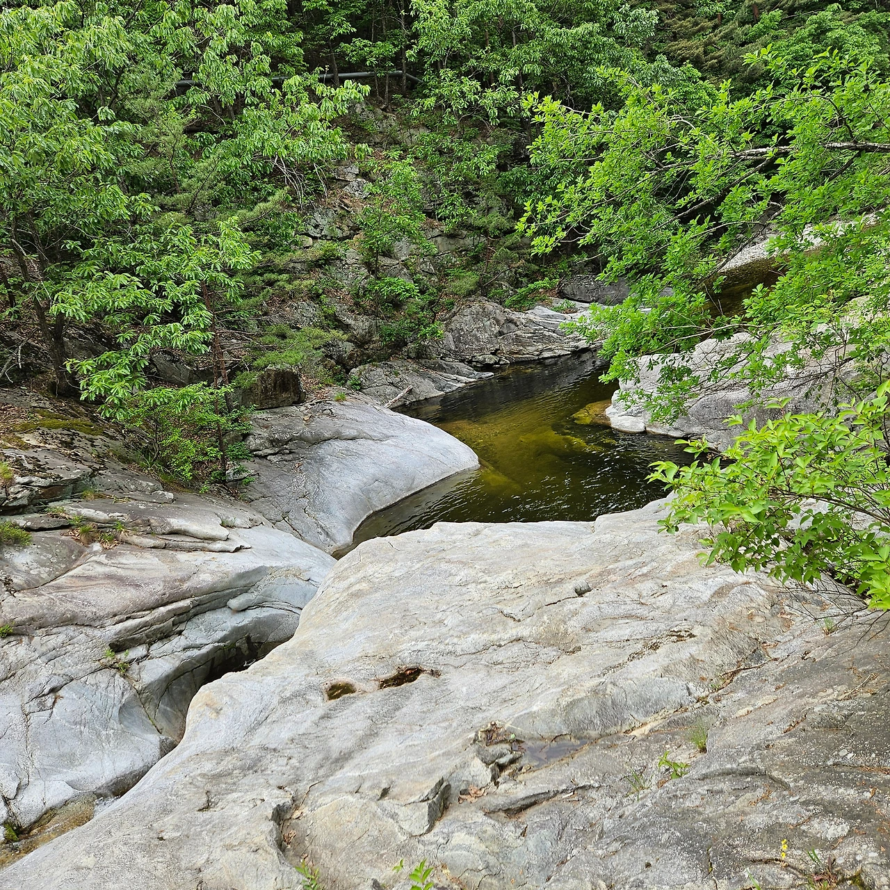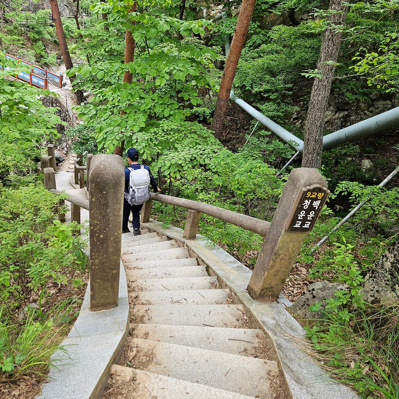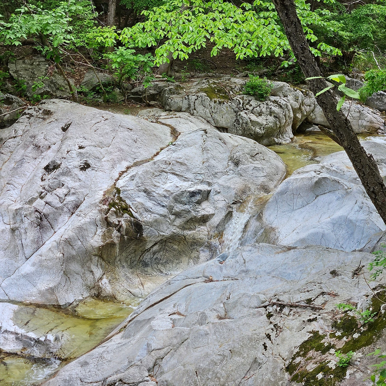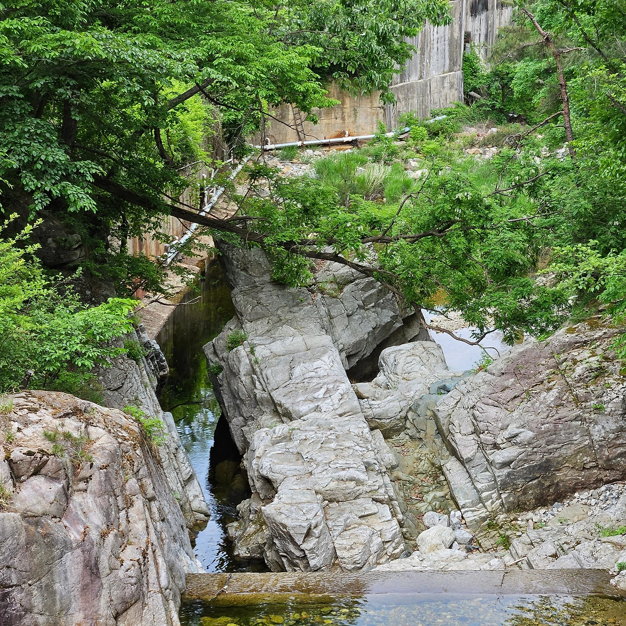 내려오면서 용소폭포와 선녀탕에 도착하였다. H는 폭포에 도착하기 전에 5교량인 크세이교 위에서 내려다보면 상어의 이빨처럼 보인다고 하였다. 그렇게 화강암에 웅덩이가 만들어져 있다. 그것을 공식명칭으로 돌개구멍이라고 하는데 위에서 보면 그것이 상어의 이빨처럼 보인다고 하였다. 돌개구멍은 화강암지역에 작은 자갈들이 물에 힘에 의하여 그곳을 마모시켜 구멍이 생겼다고 한다. 그리고 용소폭포에 도착하였다. 이곳의 폭포도 주왕산의 용연폭포나 절구폭포와 같이 2중 폭포다. 그렇게 그 폭포를 보고 내려간다.