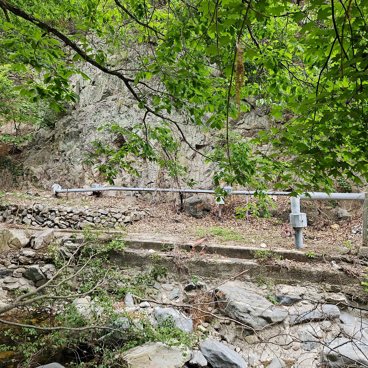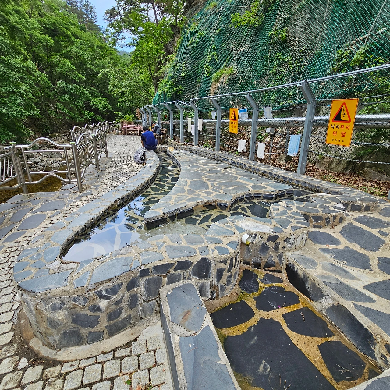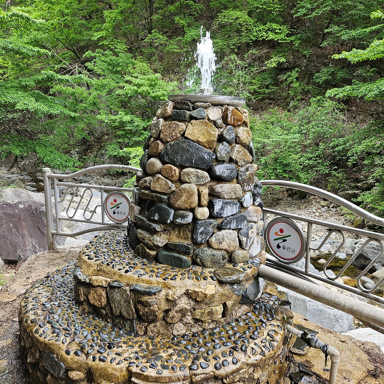 용소폭포를 지나면서 이제는 지친 기색이 역력하다. 바로 30m 전방에 무엇이 있는데 그곳에 가기 싫다고 이야기한다. 힘들었다고 보아야 할 것이다. 그곳에 줄무늬를 가진 흰돌이 있다고 하는데 지나친다. 그리고 원탕에 도착하였다. 원탕은 덕구온천의 온천수가 샘솟아 나는 곳이다. 그 온천수를 발을 담그고 즐길 수 있도록 만들어 놓았다. 바로 옆에는 온천수가 솟아나는 조그마한 분수도 있다. 우리는 계곡에서 발을 씻고 온천수에 발을 담근다. 덕구온천은 고려시대 말기, 사냥꾼들이 사냥하다가 온천수가 솟는 노천온천을 발견했고, 간이 목욕 시설을 세워 오랫동안 인근 주민들의 노천온천 역할을 했다. 약 50년 전까지만 해도 마을사람들이 목욕하러 갔다고 한다. 원래 마을주민들이 목욕했던 노천온천은 '원탕'으로 불린다. 온도는 42.4℃이다. 중탄산나트륨, 칼륨, 칼슘, 철, 탄산 등의 성분인 약알칼리성이다. 효능은 신경통, 류마티스, 근육통, 피부질환, 과격한 운동으로 인한 근육신경마비에 좋다고 한다. 이곳에서 덕구콘도 등으로 연결된 파이프라인이 설치되어 있다. 이곳의 온천수를 그곳까지 배달하는 관인 것이다.