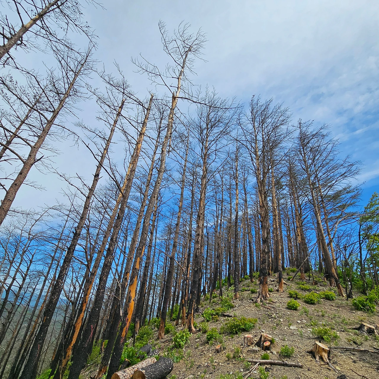 산불은 바람의 세기에 따라 아니면 바람의 방향에 따라 나무들을 불쏘시게로 사용하였는지 아닌지에 따라 피해의 양상이 다르게 보였다. 어떤 지역은 아무 피해가 없고 어떤 지역은 피해가 극심하다. 침엽수가 많은 지역이 특별히 더 많은 피해를 입은 것 같다. 나무와 나무사이에 있는 나무도 피해를 입은 것을 보았을 때 아쉽다는 생각이 든다. 생을 마감함 나무를 그 그루터기에 쌓아둔 것을 보고 J는 나에게서 난 것들을 마지막에 그것을 내가 담고 있다고 이야기한다.