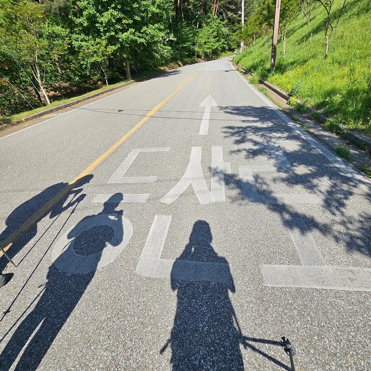 덕구콘도 주차장에 주차를 시키고 고민을 한다. 더위에 자동차를 그대로 세워둘 것인지 아니면 등산로 입구까지 갈 것인지 고민을 한다. 그래도 하산을 하면 힘이 들고 등산을 시작할 때는 힘이 있으니 돌아와서 편한 곳이 좋다고 덕구콘도에 주차를 시키고 산행을 시작한다. 산행을 시작하면서 등산로 입구로 이동하면서 포장된 도로에 등산로라는 이정표가 이채로워서 등산을 시작하면서 그림자를 엑스트라로 만들고 담아본다.