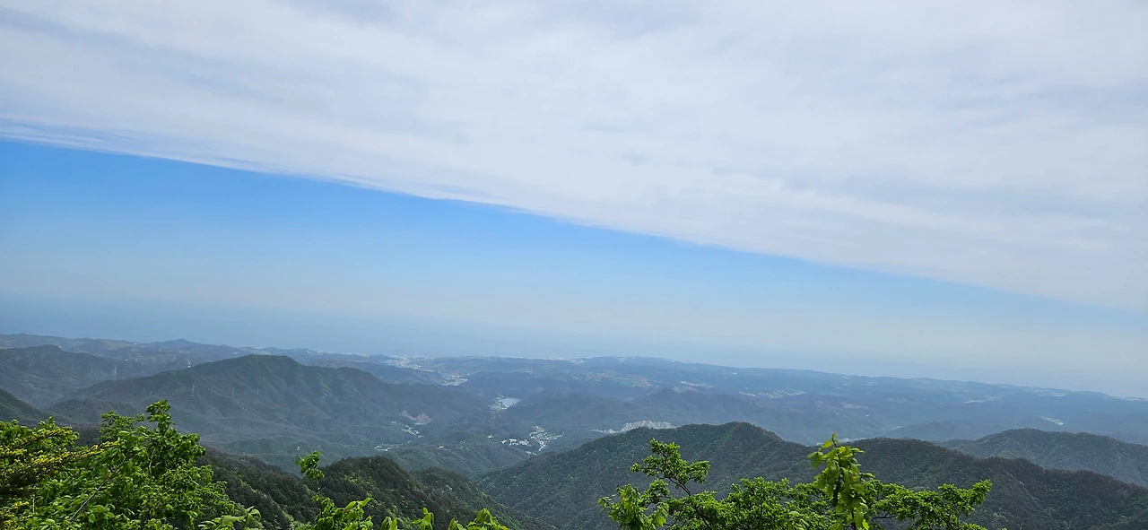이제 올라선다. 마지막헬기장이다. 헬기장이 3개 있는데 첫 번째, 두 번째를 지나면서 가파름이 시작되고 좀 더 심하여진 것을 확인하였는데 이제는 세 번째 헬기장은 이제 정상이 10m이다. 그곳에서 동해를 그대로 볼 수 있고 오른쪽으로 산이 오르고 내리는 그 멋진 경치를 볼 수 있다. 동해를 보는 데 특이하다. 푸르름 이외에 새로운 모습을 찾아보는 것이다. 응봉상을 오르면서 정상까지 거리는 특이하게 이정목이 아닌 이정석에 그것이 정리되어 있다. 불이 가까워서 사전적으로 그것을 방지한 것이라고 보아야 할 것이다. 울진군에서 산불이 발생하고 난 다음 데크와 안내지도를 바꾸었는지 산불의 흔적이 없다.