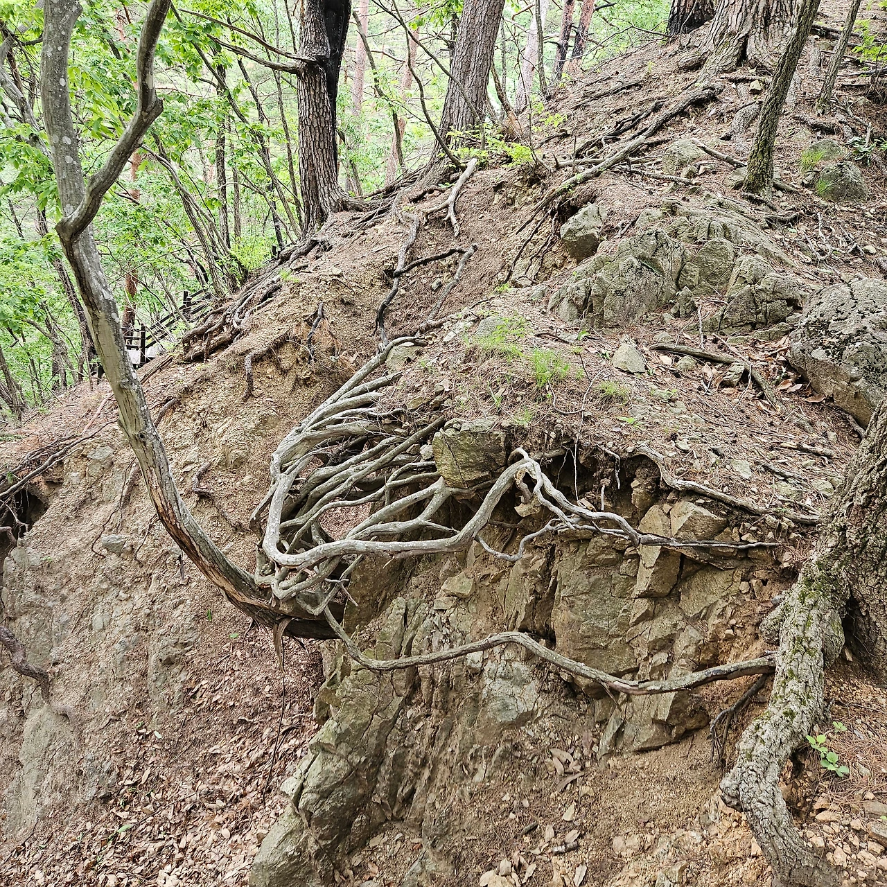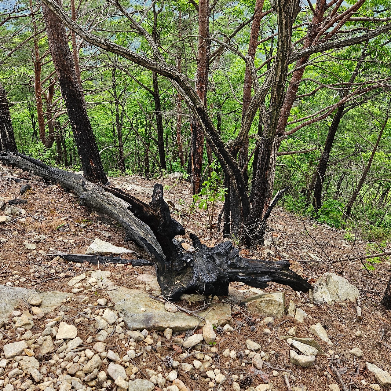 정상을 300m 정도 남겨둔 능선에서 산불의 위력을 그대로 보았다. 그런데 그곳에서 방화선을 보았다. 방화선을 사전에 구축하였는지 그것을 기준으로 좌우로 나뉘어 있다. 한쪽은 산불에 그 몸을 그대로 내 몸을 내어주었고 다른 쪽은 나를 지키고 있었다. 환경단체에서는 그 방화선을 만들 때 반대하였을 것이다. 그런데 그 결과는 생각한 이상이었다. J가 나에게 그 효과성에 대하여 논문을 작성하는 것이 어떠냐고 이야기하는데 그것을 한번 도전해 볼 가치가 있다고 본다. 방화선을 구축한 효과를 그대로 보여주는 것이 의미가 있다고 본다.