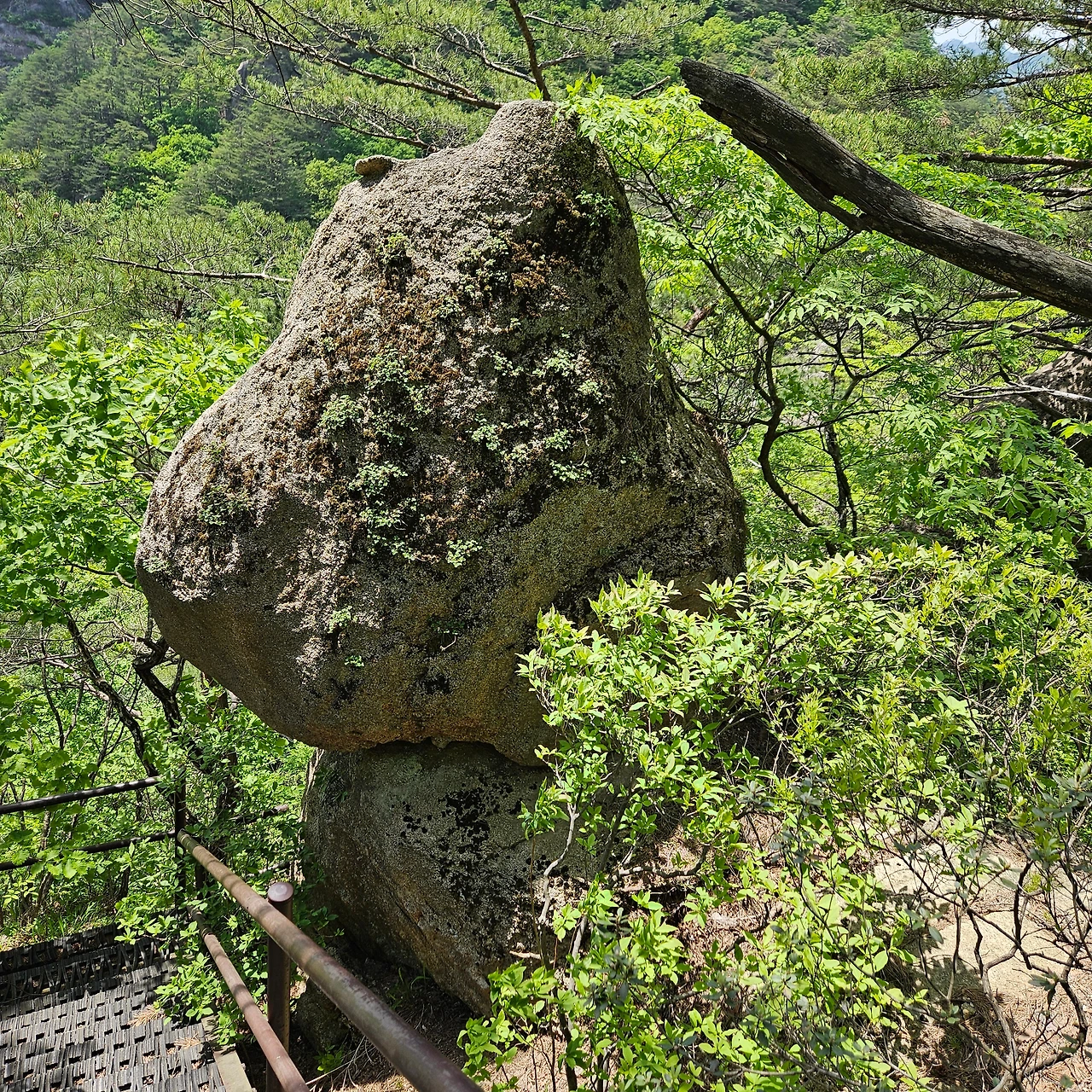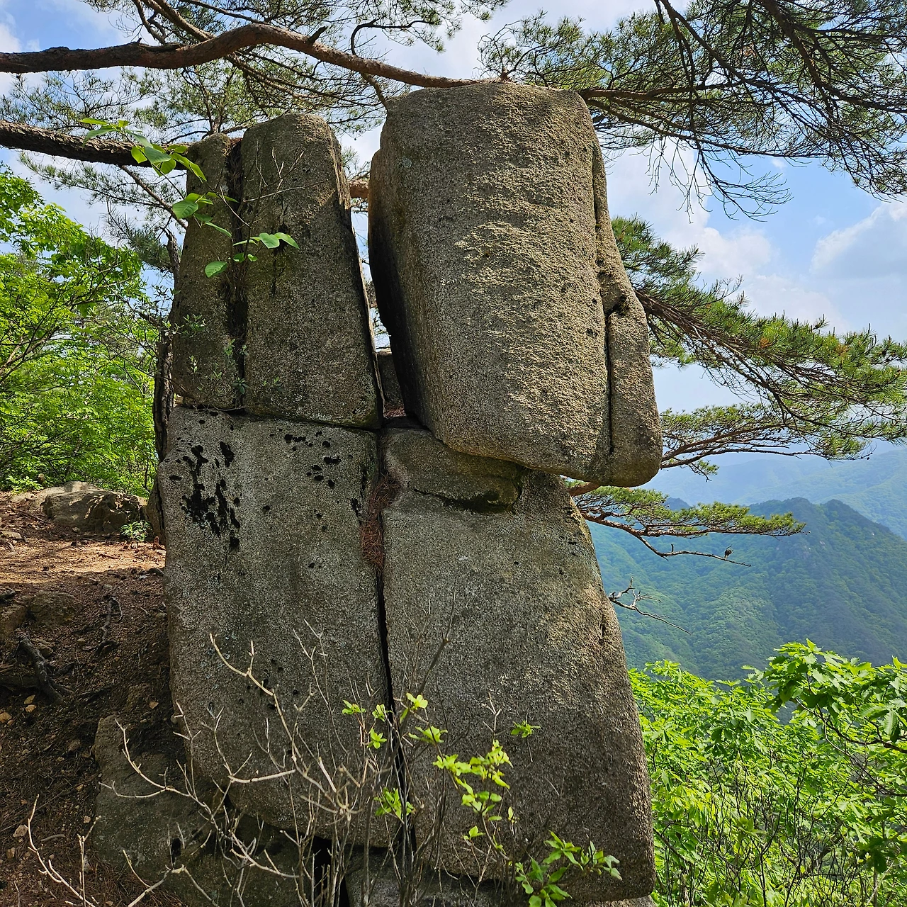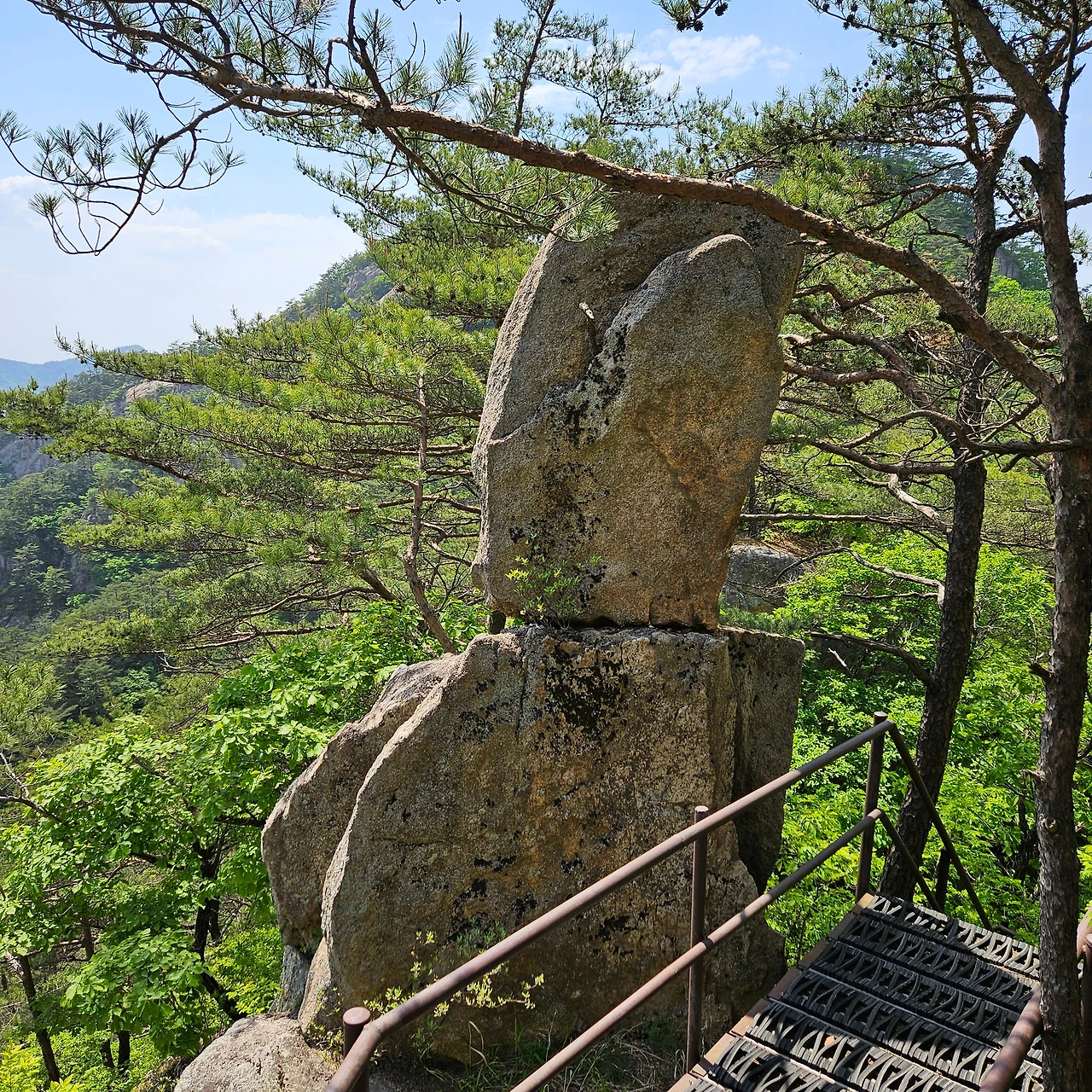 백두대간길에 접근하고 이제는 부봉삼거리로 방향을 잡는다. 예전 H가 걸을 때 생각이 난다. 그때 부봉을 오를 때 밧줄을 잡고 걸은 기억이 있는데 오늘 보니 국립공원공단에서 데크를 잘 만들어 놓았다. 멀리서 보니 데크길이다. 오르는 것이 힘들지 않을 것 같다. 가다가 바람과 비와 세월이 빚은 조각품을 감상을 한다. 이런 조각품을 오늘 처음 본다. 우리는 그 조각품에 예술적인 이름을 붙이지만 그것은 작가가 붙이는 것이고 그 작품을 감상하는 사람은 제 마음대로 붙여도 될 것이다. 그렇게 우리는 이름을 붙이면서 부봉삼거리에 도착하였다. 부봉을 오르면서 힘들었던 기억밖에 없는 데 너무 쉽다. 데크를 오르기만 하면 되는 것이다. 그런데, 데크를 오르면서 뒤를 돌아보니 너무 멋진 경치이다. 멀리 우리가 걸어온 영봉과 주봉이 그대로 보이고 월악산의 전경이 그대로다.