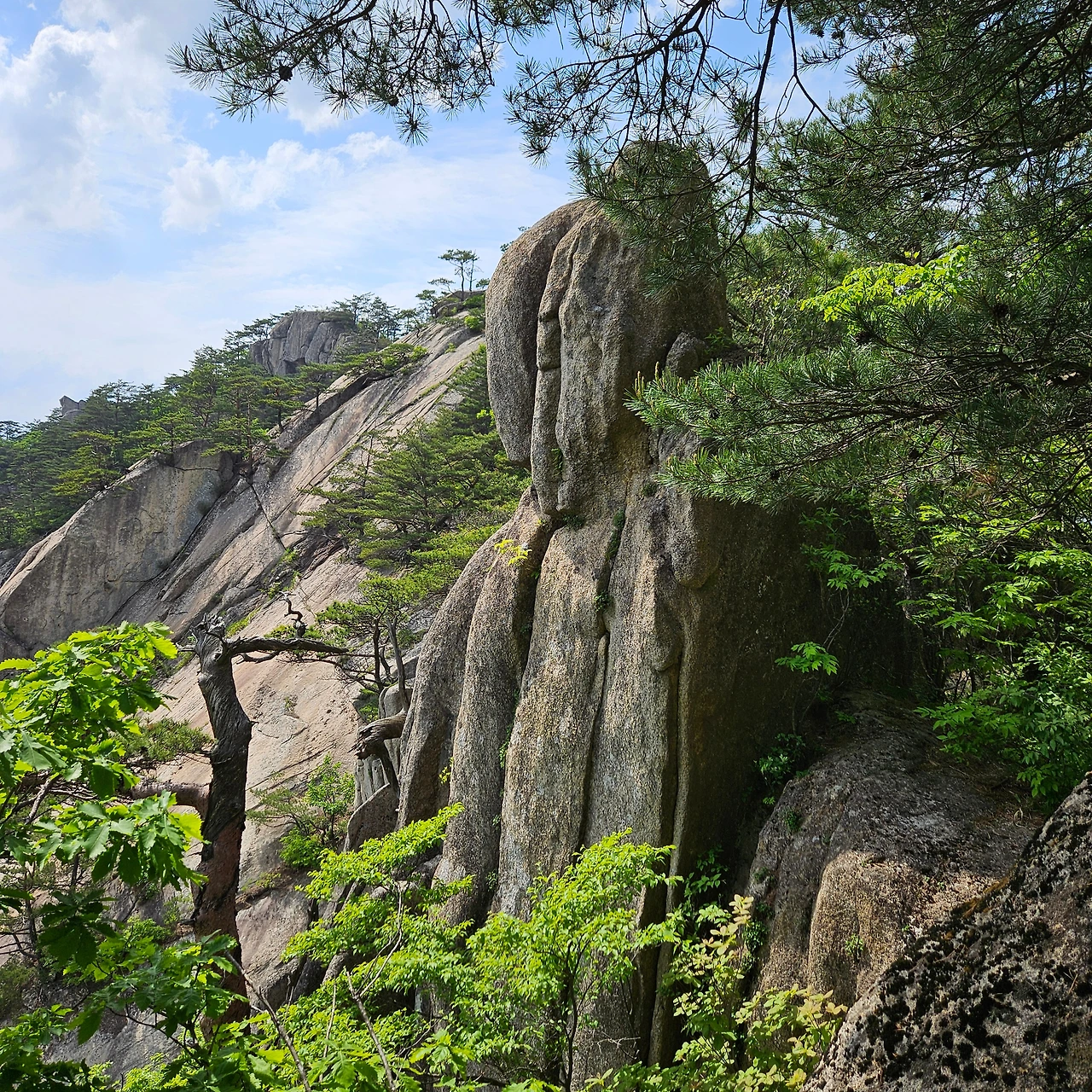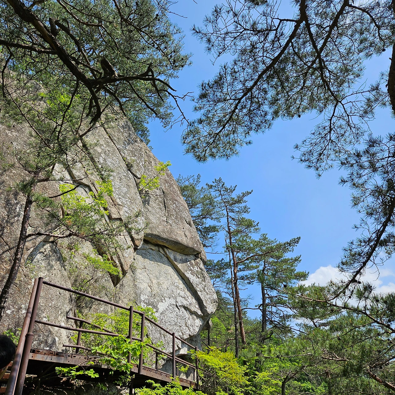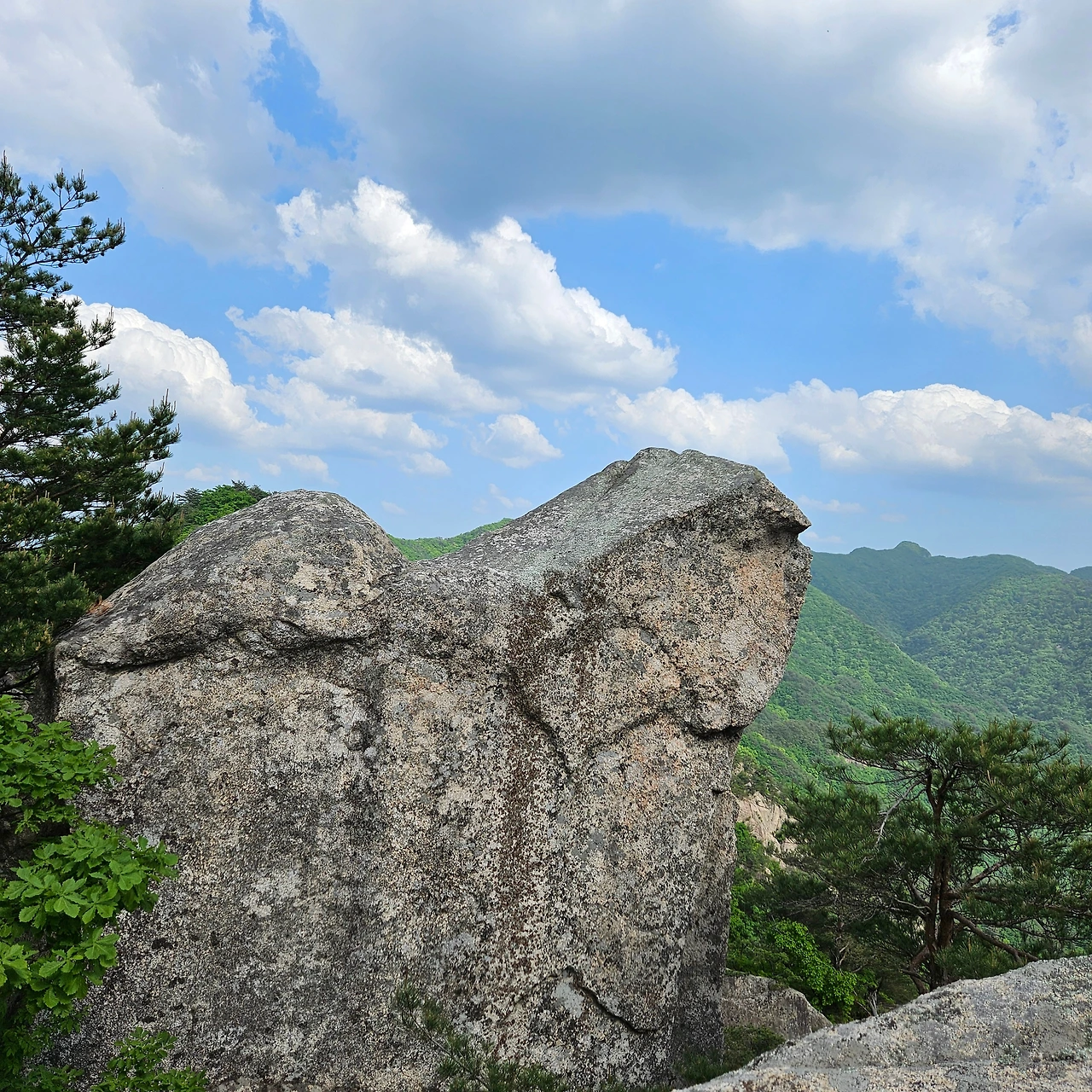 백두대간길에 접근하고 이제는 부봉삼거리로 방향을 잡는다. 예전 H가 걸을 때 생각이 난다. 그때 부봉을 오를 때 밧줄을 잡고 걸은 기억이 있는데 오늘 보니 국립공원공단에서 데크를 잘 만들어 놓았다. 멀리서 보니 데크길이다. 오르는 것이 힘들지 않을 것 같다. 가다가 바람과 비와 세월이 빚은 조각품을 감상을 한다. 이런 조각품을 오늘 처음 본다. 우리는 그 조각품에 예술적인 이름을 붙이지만 그것은 작가가 붙이는 것이고 그 작품을 감상하는 사람은 제 마음대로 붙여도 될 것이다. 그렇게 우리는 이름을 붙이면서 부봉삼거리에 도착하였다. 부봉을 오르면서 힘들었던 기억밖에 없는 데 너무 쉽다. 데크를 오르기만 하면 되는 것이다. 그런데, 데크를 오르면서 뒤를 돌아보니 너무 멋진 경치이다. 멀리 우리가 걸어온 영봉과 주봉이 그대로 보이고 월악산의 전경이 그대로다.