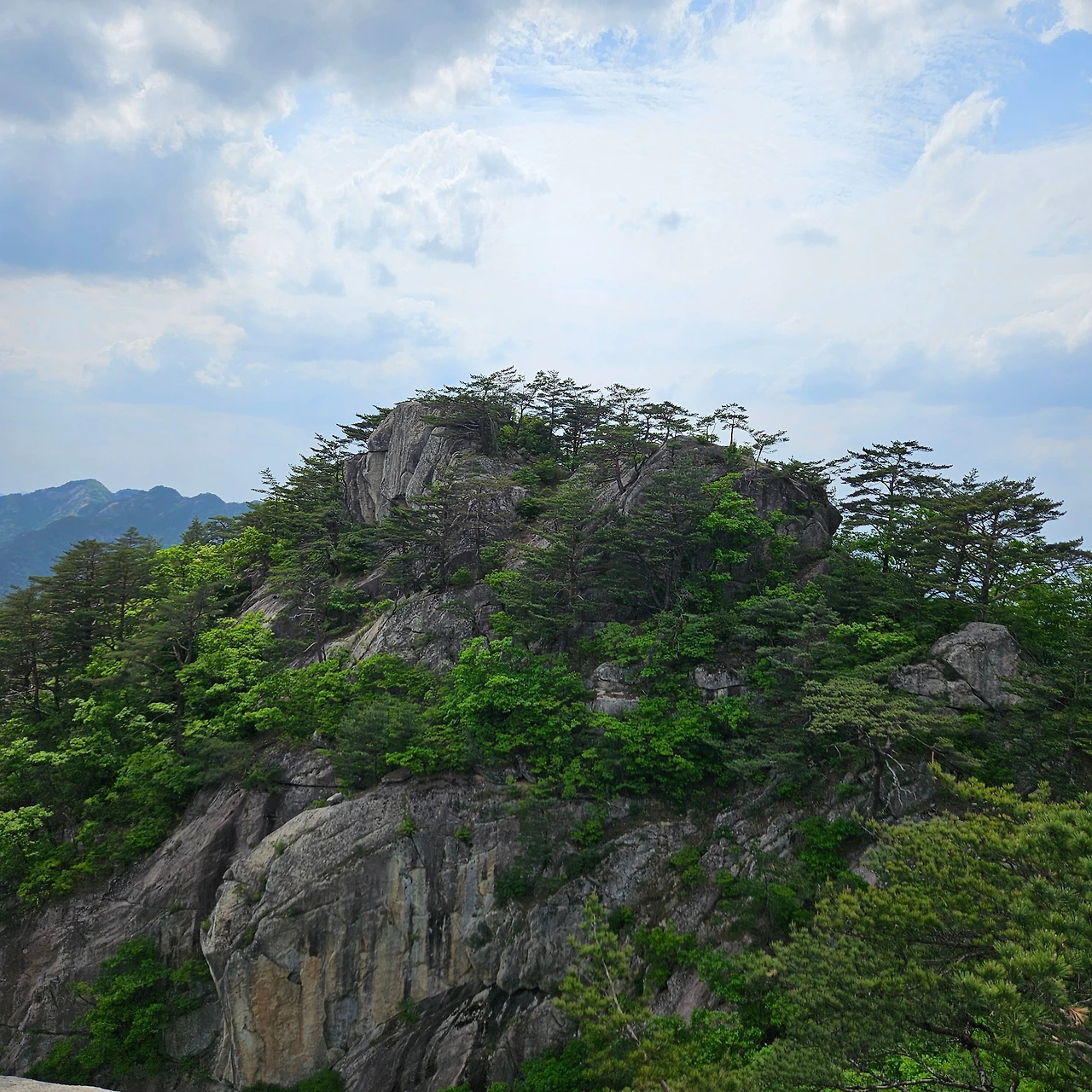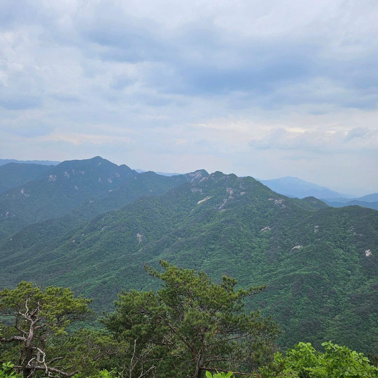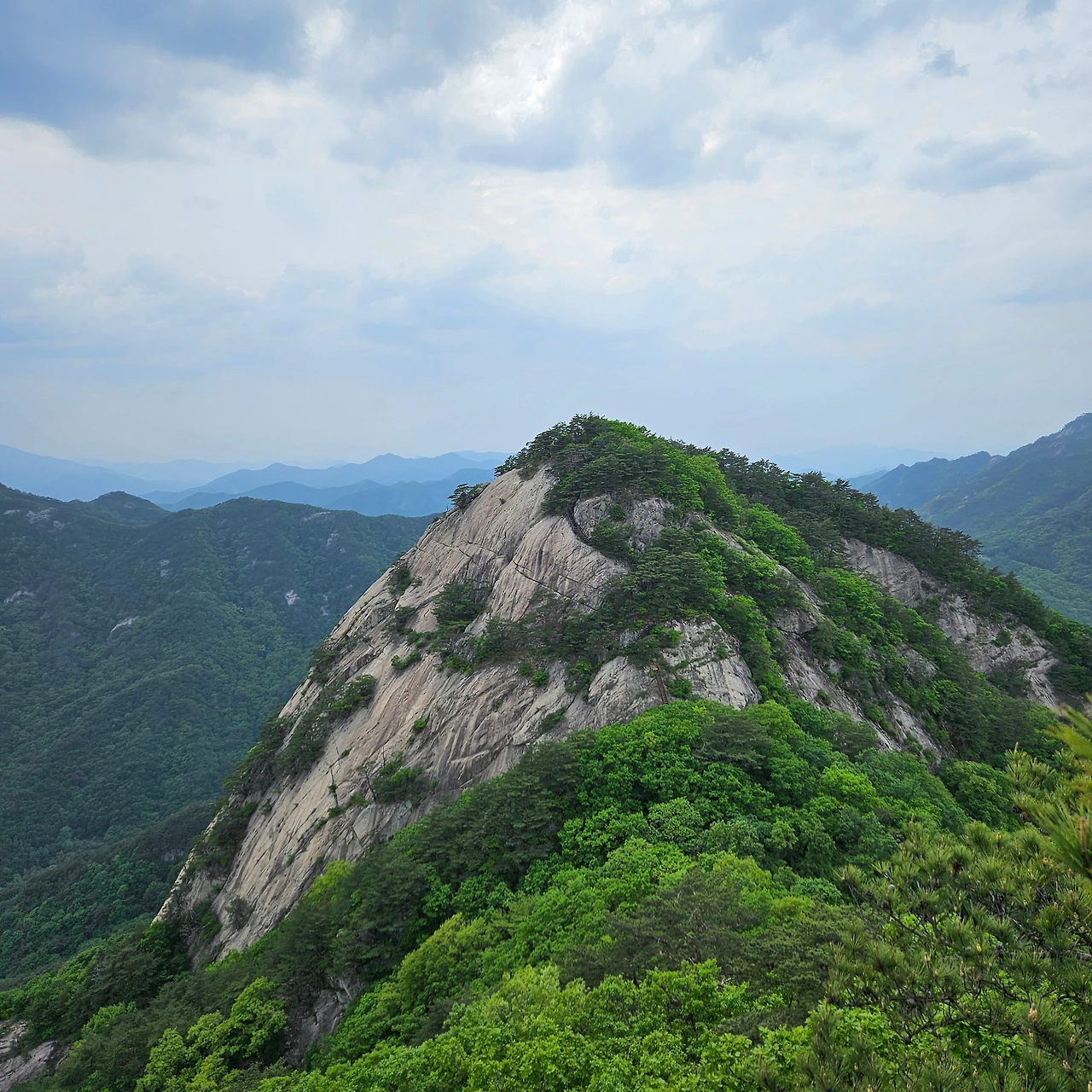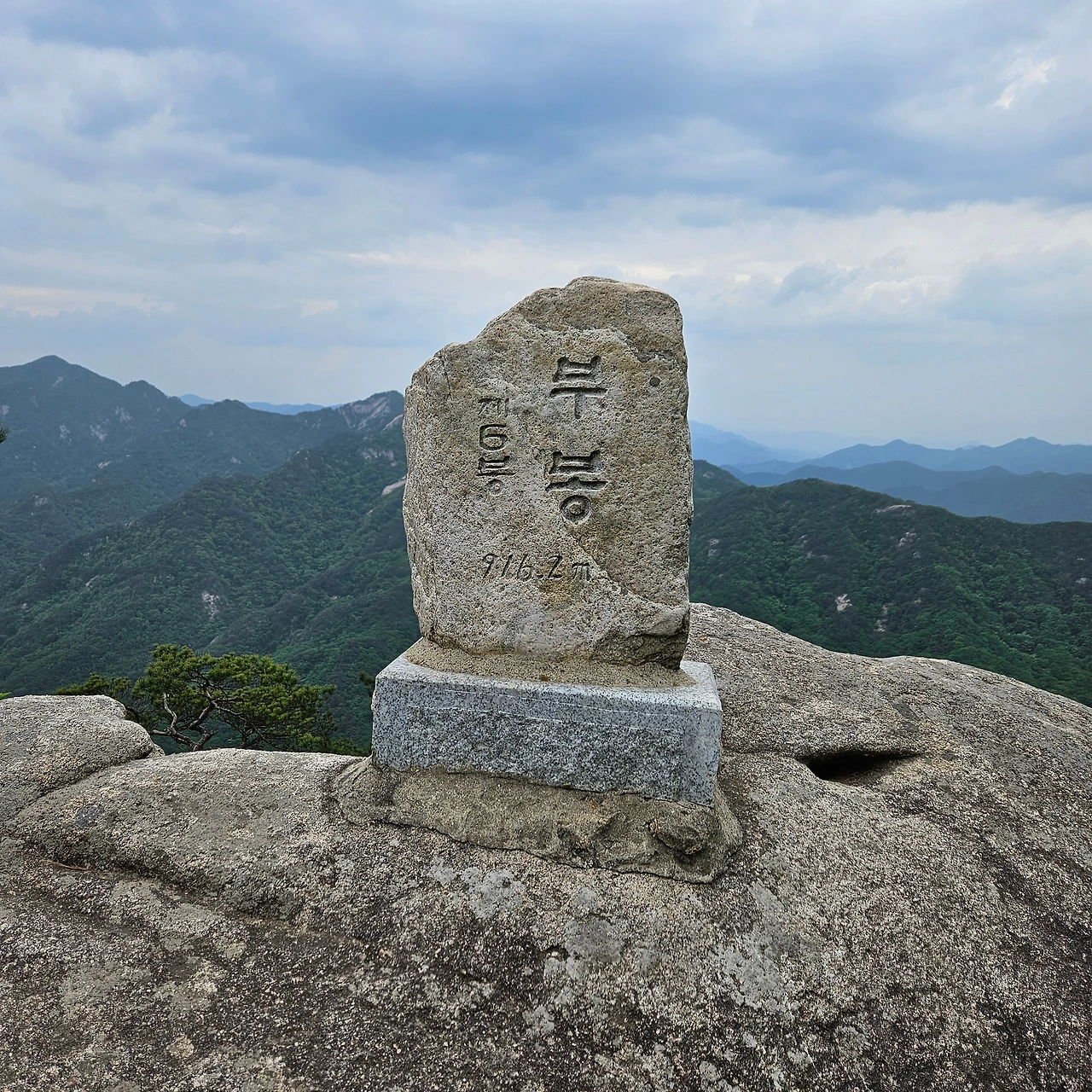 5봉은 정상석이 없고 그냥 멋진 경치 그대로이고 6봉을 볼 수 있다. 이제 비구름이 가까이 왔는지 그렇게 맑던 하늘이 어두워지고 있다. 일행들은 그래도 사진을 담고 있다. 나는 오늘 시간이 넉넉할 것이라고 생각하여 우의 챙기지 못하였는데 하는 아쉬움이 있다. 5봉을 그렇게 지나고 6봉 가까이 가니 다시 2 관문으로 가는 길이라는 이정표가 있다. 하지만, 6봉을 남겨두고 갈 수 없어 오른다.