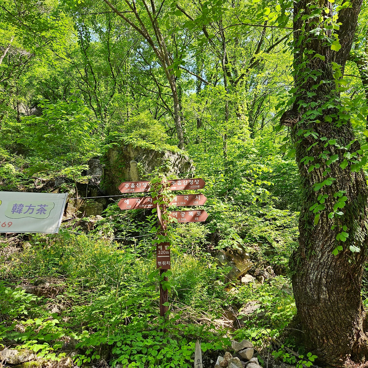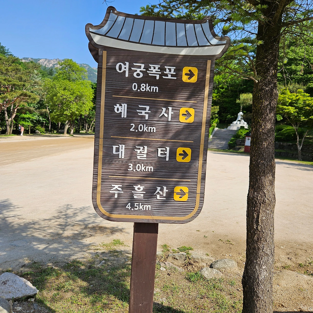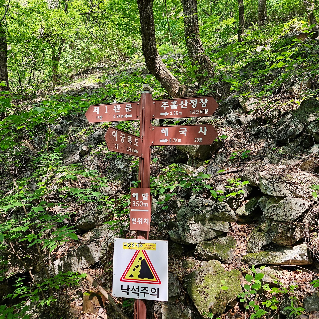 주흘산에는 여궁폭포, 꽃밭서들 등 명승을 이루고 있고, 많은 문화유산과 역사, 전설을 품고 있다. 주흘산 중턱에 신라 846년(문성왕 8) 보조선사(普照禪師) 체징(體澄 804~880)이 창건한 혜국사가 있다. 그 중심을 지나가는 것이다. 기본적으로 여궁폭포 휴게소까지는 평탄한 길의 연속이라고 할 것이다. 자동차가 휴게소까지 접근할 수 있어야 하는 만큼 그렇게 힘들이지 않고 오를 수 있는 포장된 길이다. 이곳에 이정표가 있다. 여궁폭포를 들려서 정상으로 갈 것인지 아니면 바로 정상으로 갈 것인지를 물어본다. 대부분의 사람들은 여궁폭포를 들려서 가는 코스로 간다. 그 웅장한 폭포를 보지 않고 이곳을 오르는 것은 의미가 없다고 본다. 이것을 보려고 오는 사람도 있는데 이것을 지나칠 수가 없어서 여궁폭포를 접근한다.