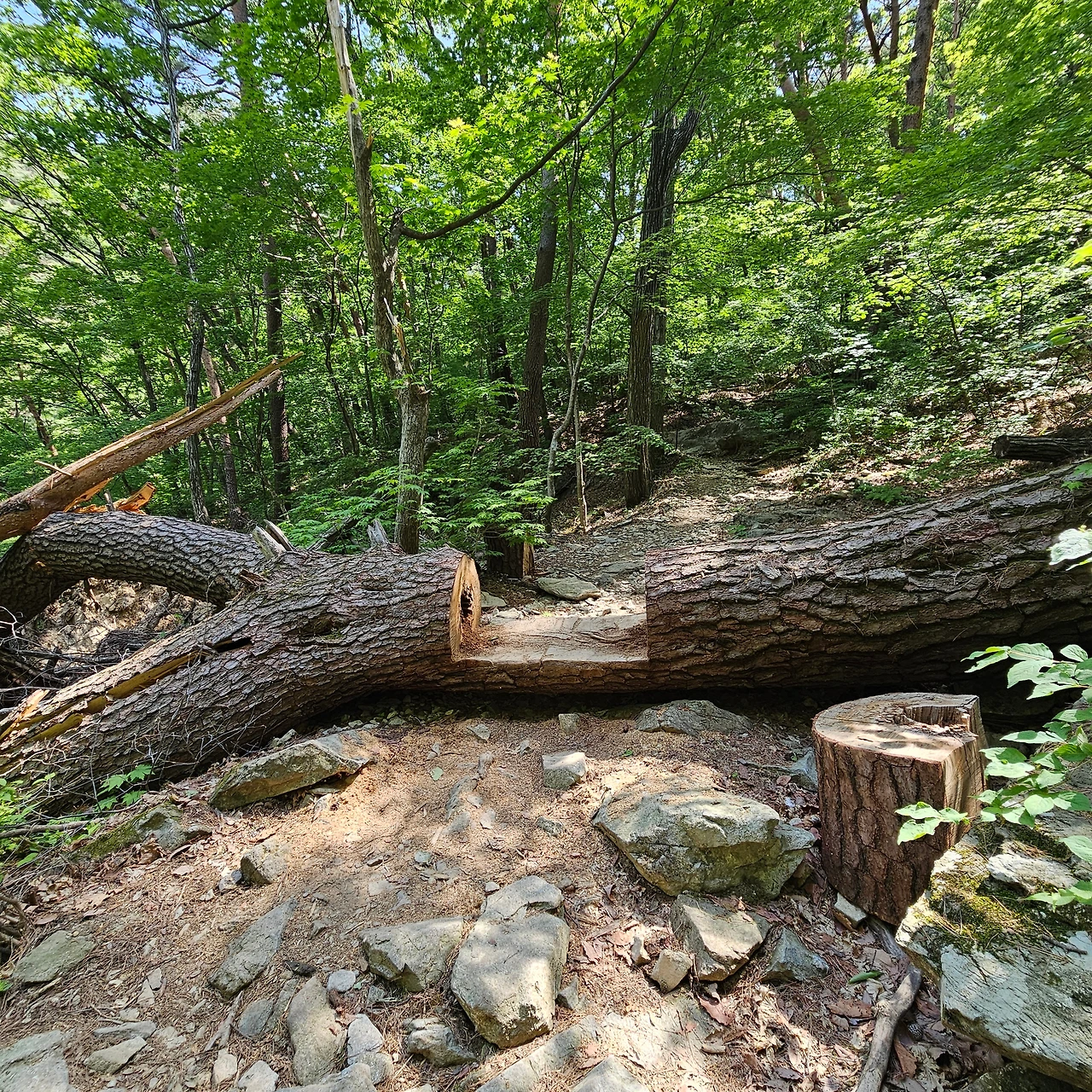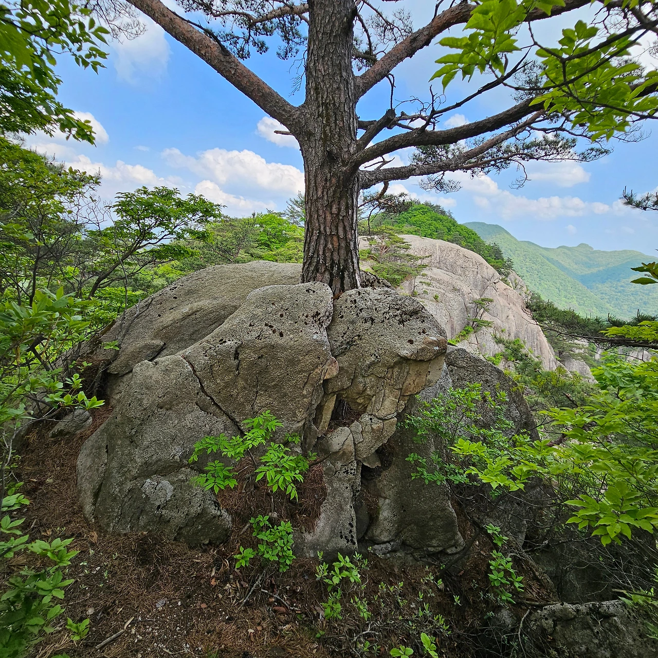 이제 정상으로 이동을 하는데 이 산도 겨울의 풍파를 겪은 흔적을 보면서 안타까움의 현실을 보았다. 겨우내 내린 눈으로 그 큰 소나무들이 넘어져 있다. 200년 이상된 소나무들이 쓰러져있다. 주흘산은 정상 부근까지 소나무들이 잘 가꾸어져 있다. 그 아름드리 소나무들이 겨울눈을 견디지 못하고 쓰러져 있다. 어떤 곳에서는 소나무가 너무 커서 중간을 토막 내어 등산로를 만들어 둔 곳도 있었다.