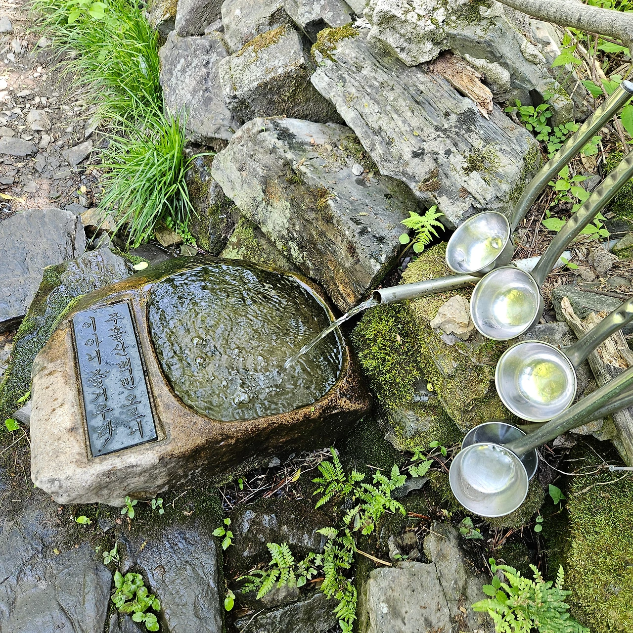 주흘산 정상으로 가면서 이제 쉬어가야 할 쯤에 샘터가 있다. 샘 터지기가 만들어 놓은 것인지 재미있는 글귀가 있다. '주흘산을 백번 오르니 이 아니 즐거우랴'