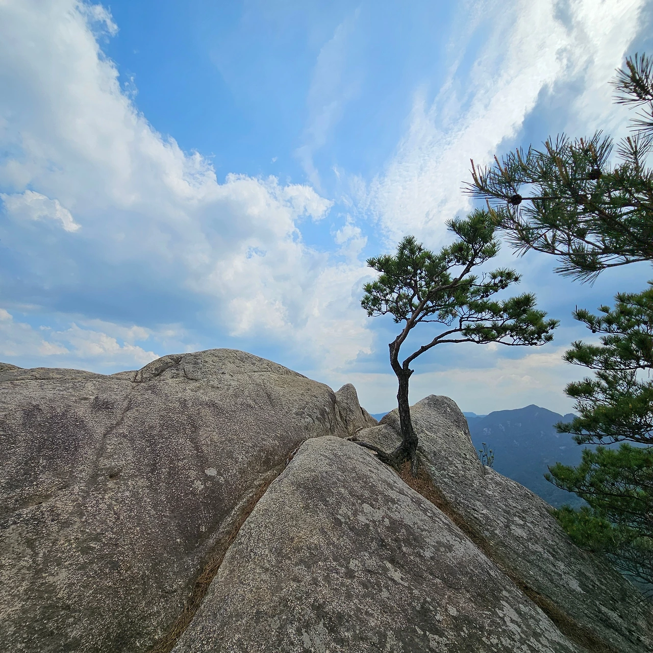 다시 3봉을 오른다. 3봉을 오르면서 오금이 저린 곳을 나온다. 하지만 안전하게 바윗길을 타고 이동을 한다. 암릉사이에 자란 소나무가 독야청정하고 정상석이 다소곳하게 자리를 잡고 있다. 우리 뒤에 따라오는 사람들이 조령산을 가는 것으로 알고 있는데 2봉에서 우리가 3봉을 조망한 곳에서 조망을 하고 있다. 그분들은 이 길을 잘 알고 있는 것 같다. 주흘산의 비경을 그대로 본다고 할 것이다.