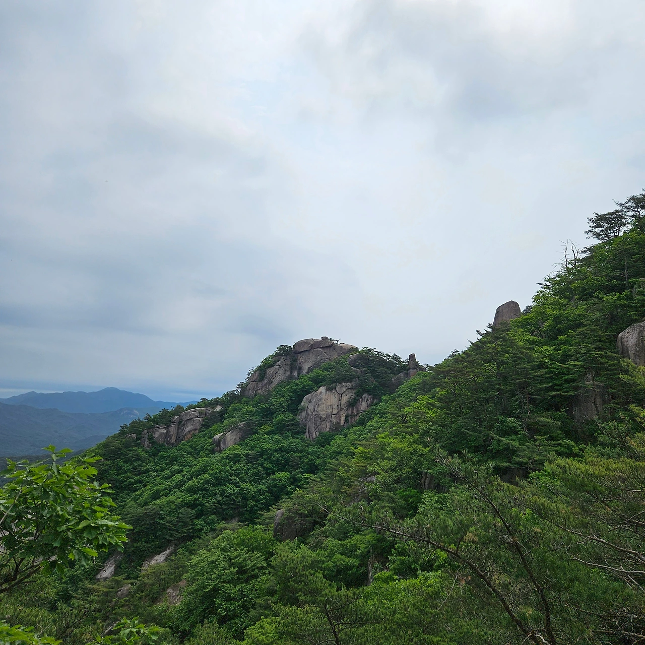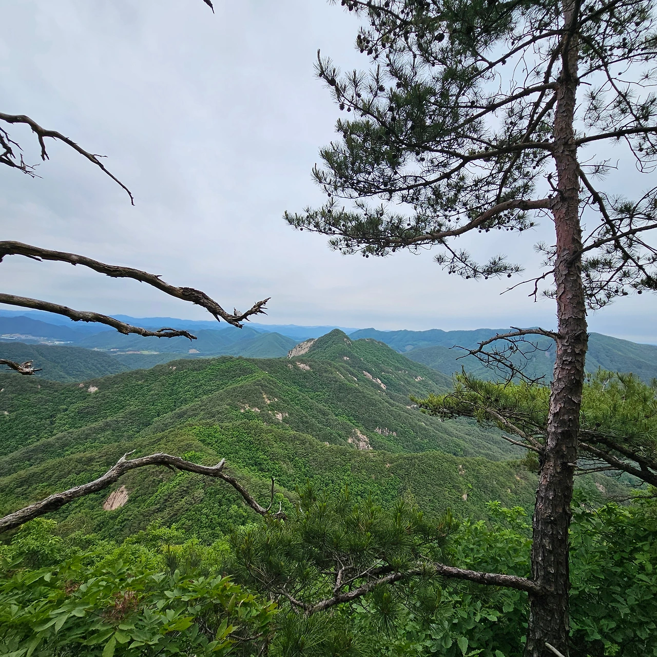첫 번째 봉우리를 오르면서 능선반대편을 보고 이웃한 청화산 정상도 바라본다. 봉우리 정상에 도착하기 전 쉼터 의자가 있으나 그것을 무시하고 정상에 도착하고 그곳에 있는 넓은 바위 위에 앉아서 쉰다. 그곳에서 1차적으로 모든 것을 본다. 이웃한 봉이 있다. 미남봉이 있고 매봉이 있다. 그리고 우리가 가야 할 봉우리가 있다.