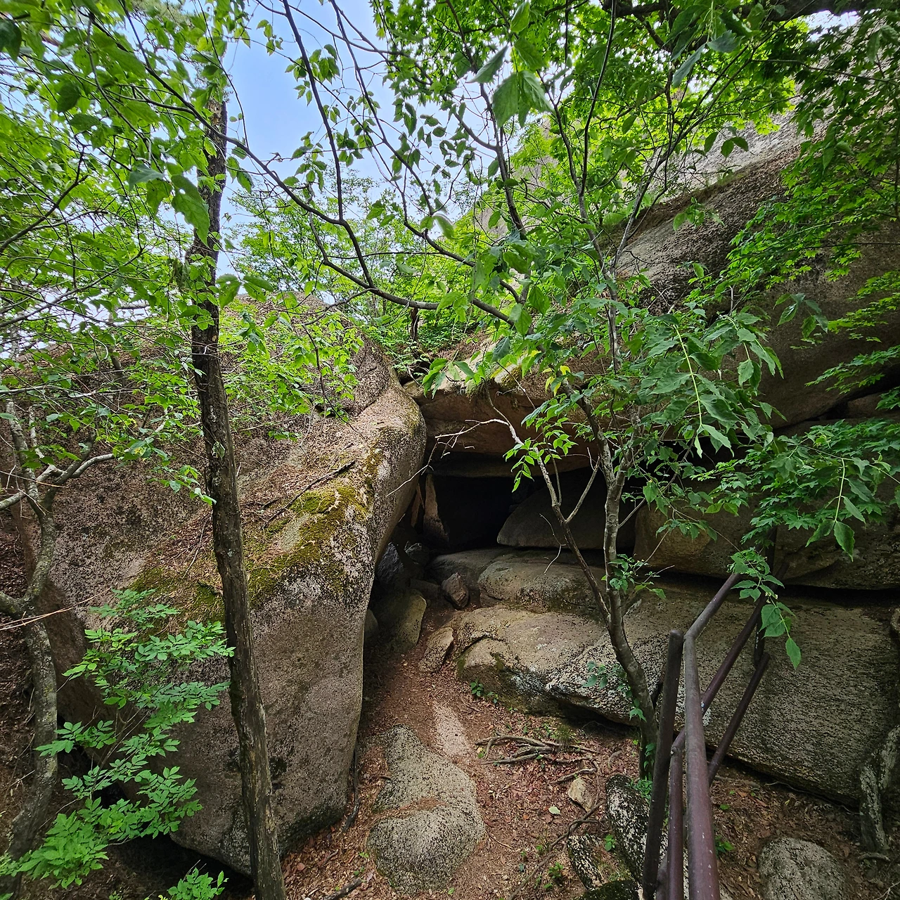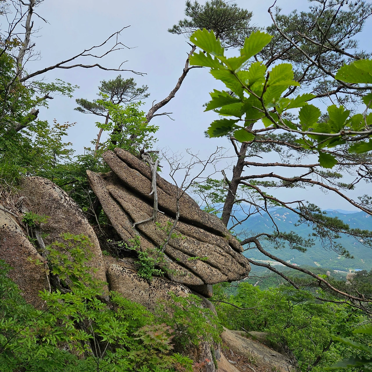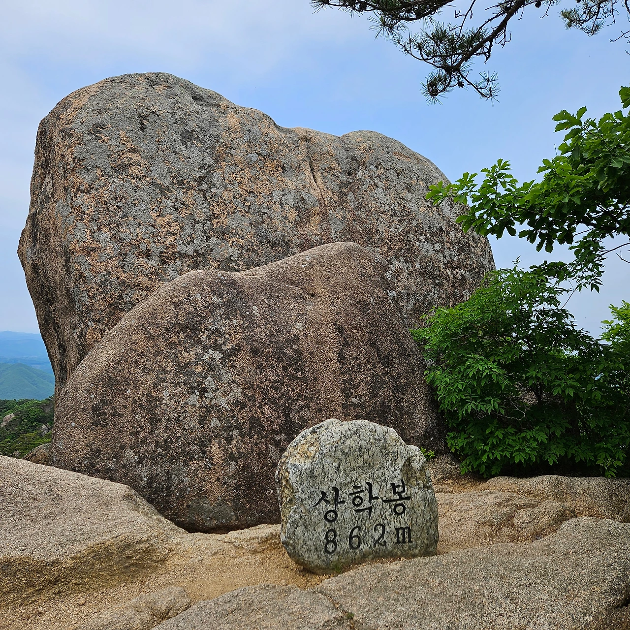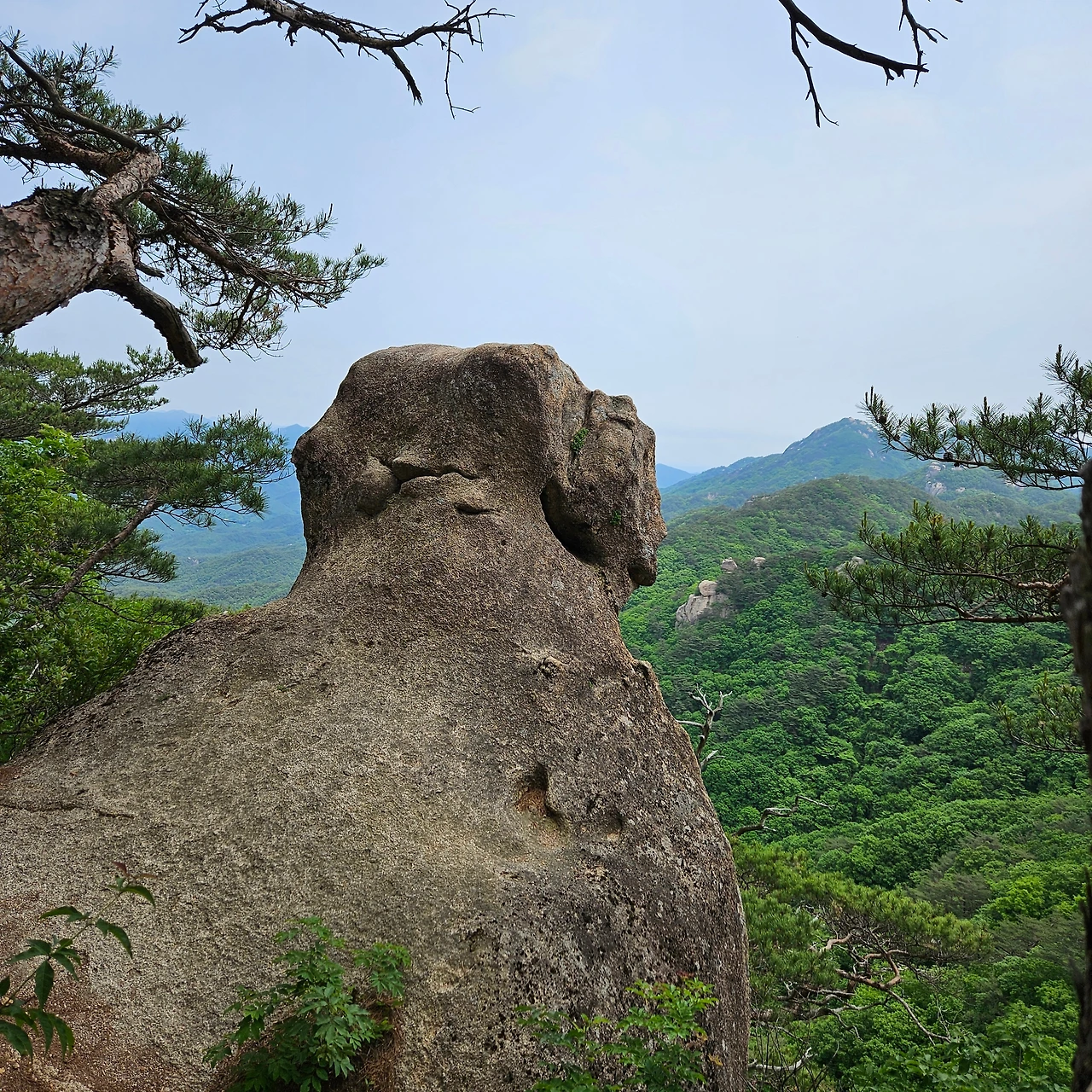 우리는 일행이 우리가 이동하는 경로를 따라오지 못하여 토끼봉을 오르지 못하고 멀리서만 그 모자바위를 감상하였다. 그 모자바위를 보는 위치도 출입금지다. 그곳에 안전로프를 설치하고 관리를 하는 것이 좀 더 좋다고 본다. 그리고 이동을 한다. 상학봉을 가면서 중간에 있는 바위밑에 토끼굴이 있는데 오늘은 지나간다. 비로봉이 있다. 바위 위에 소나무가 있어 그 경치를 담는다. 상학봉을 지나면서 시간이 촉박하다는 것을 느낀다. 휴식시간을 최소화하고 걷는다. 상학봉을 지나면서 보면 바로 이웃한 스핑크스 바위가 있고 멀리 눈이 좋은 사람은 묘봉의 기묘한 바위를 볼 수 있다. 그것을 사진기술을 이용하여 당겨본다. 그것을 이해하지 못하는 사람도 있고 이해하는 사람도 있다.