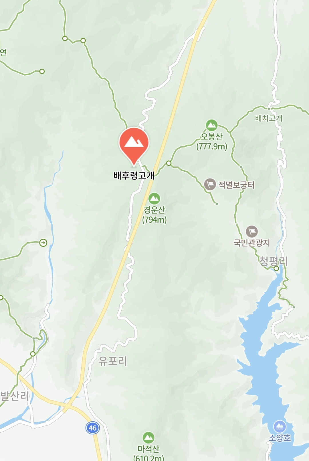 배후령을 지나지 않고 터널로 지난다. 터널이 개통되고 나서는 양구가 30분 더 가까워졌다. 청평사로 가는 길은 춘천에서 소양댐에 자동차를 세워두고 배를 타고 들어가거나 배후령을 지난 후 배치고개를 넘어가는 방법이 있는데, 배치고개를 넘어간다. 배치고개는 오봉산과 부용산 사이에 있는 고개다. 그 너머에 있는 청평사는 천혜의 요새다. 이곳을 방어하면 아무도 들어올 수 없을 것이다. 소양댐이 건설되기 전에는 소양강을 거슬러 올라온 후 들어와야 하기 때문이다.