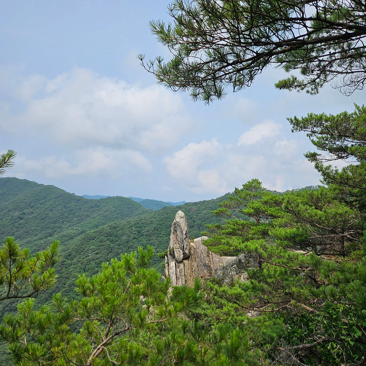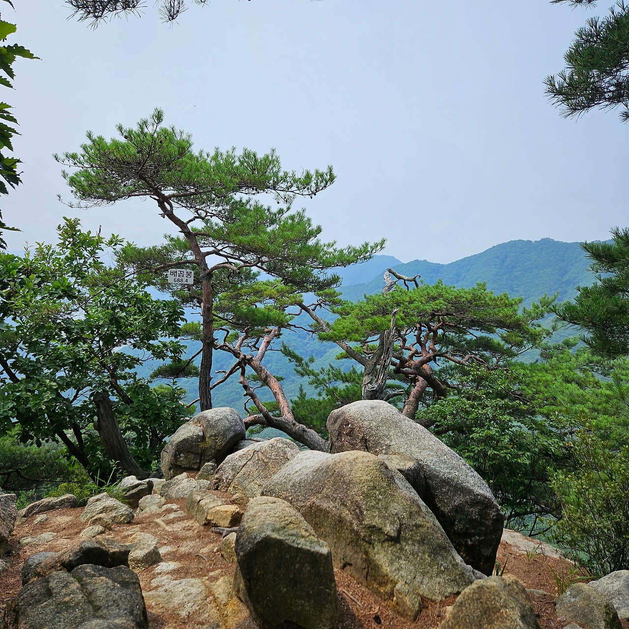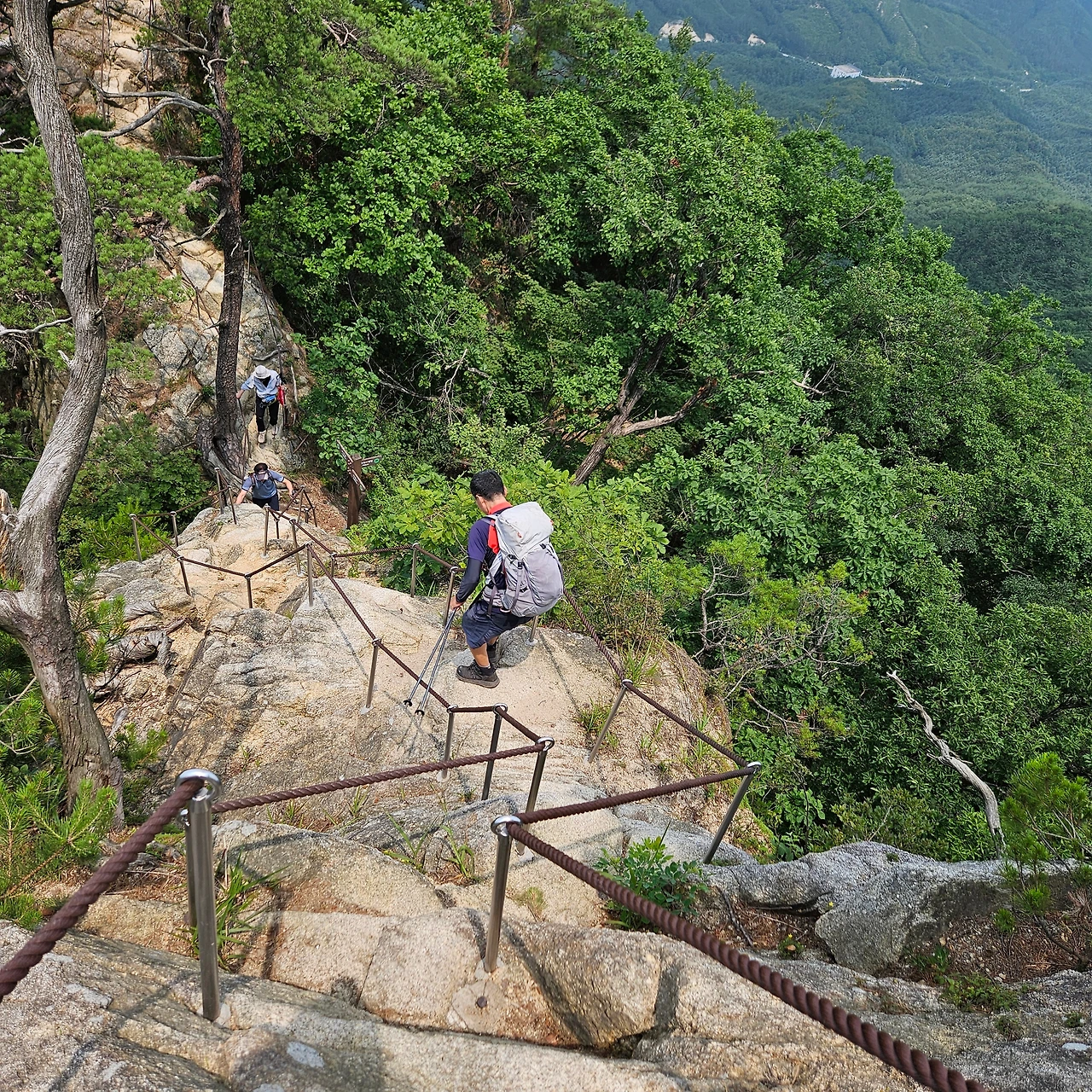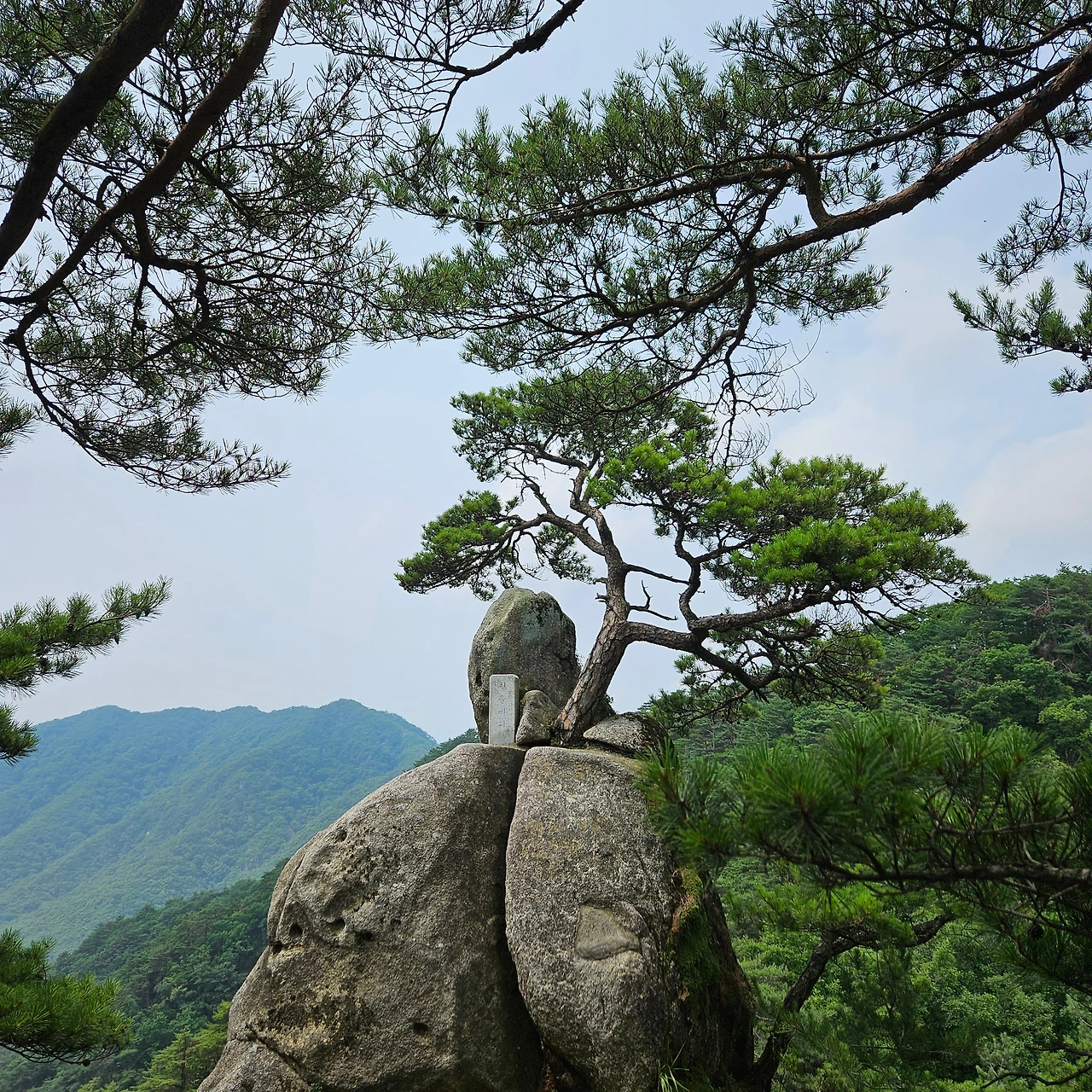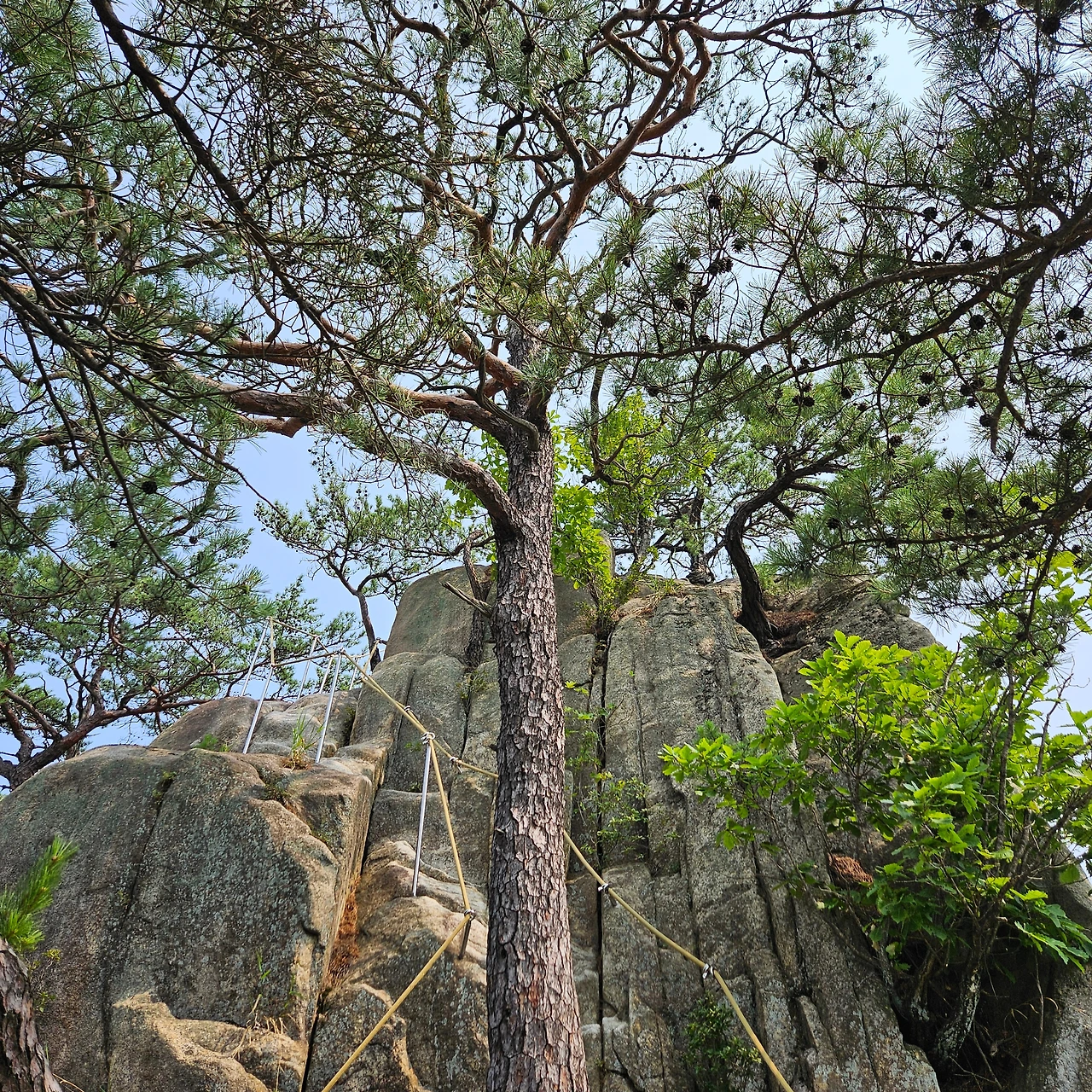 청솔바위가 있다. 그렇게 소나무가 암릉 위에 자리를 잡고 몇백 년을 유지하였을 것이다. 청솔바위 앞에서 다양한 폼으로 인증샷을 남긴다. 오늘 우리가 내려가면서 마지막으로 밧줄을 잡고 내려가는 길이라고 보아야 할 것이다. 배후령에서 오르면 첫 번째 만나는 암릉인 것이다. 경이로운 모습으로 소나무가 자리를 잡고 있다. 이제 3봉은 아무 생각 없이 지나치고, 제2봉을 지나면서 그래도 봉우리인데 하면서 인증샷을 남긴다.