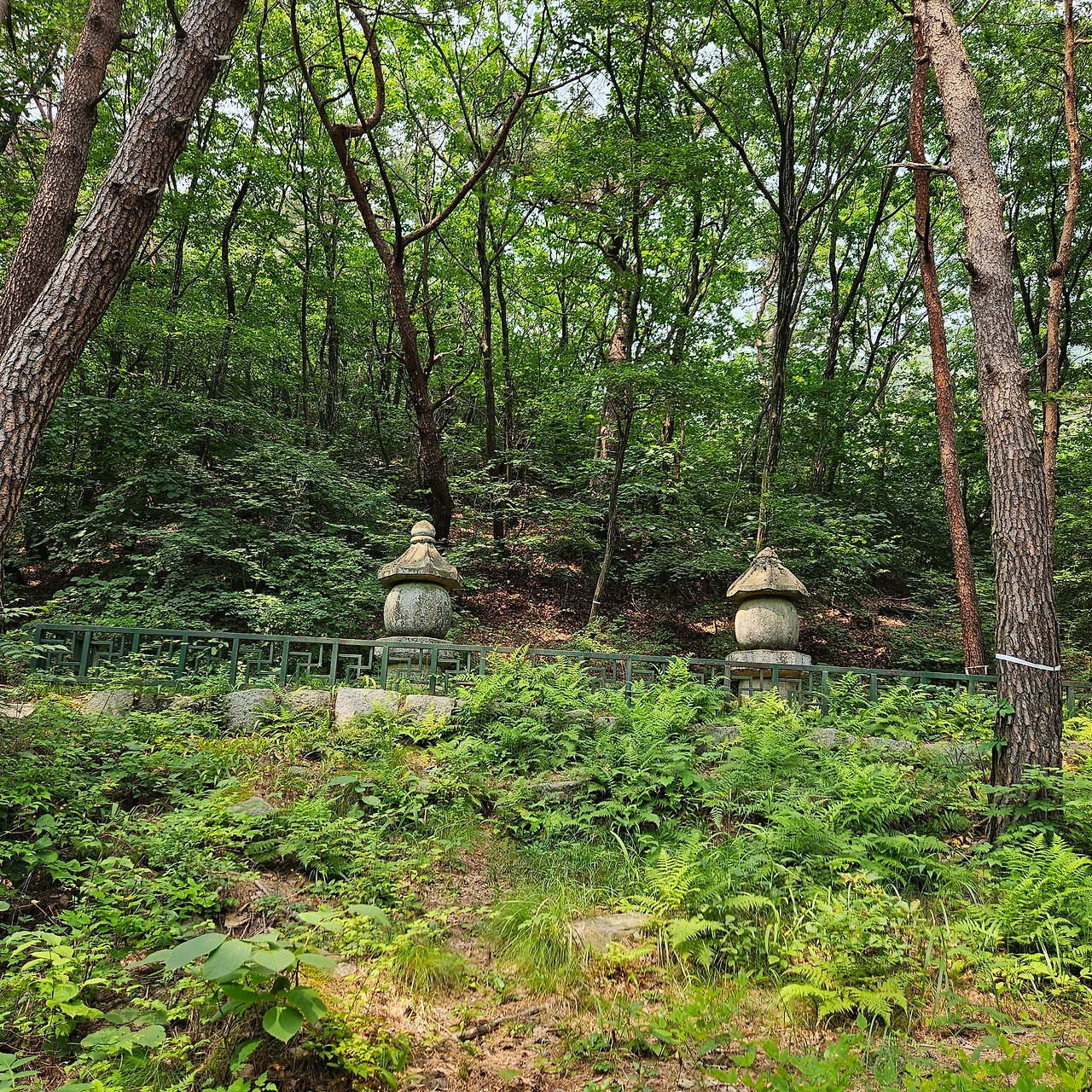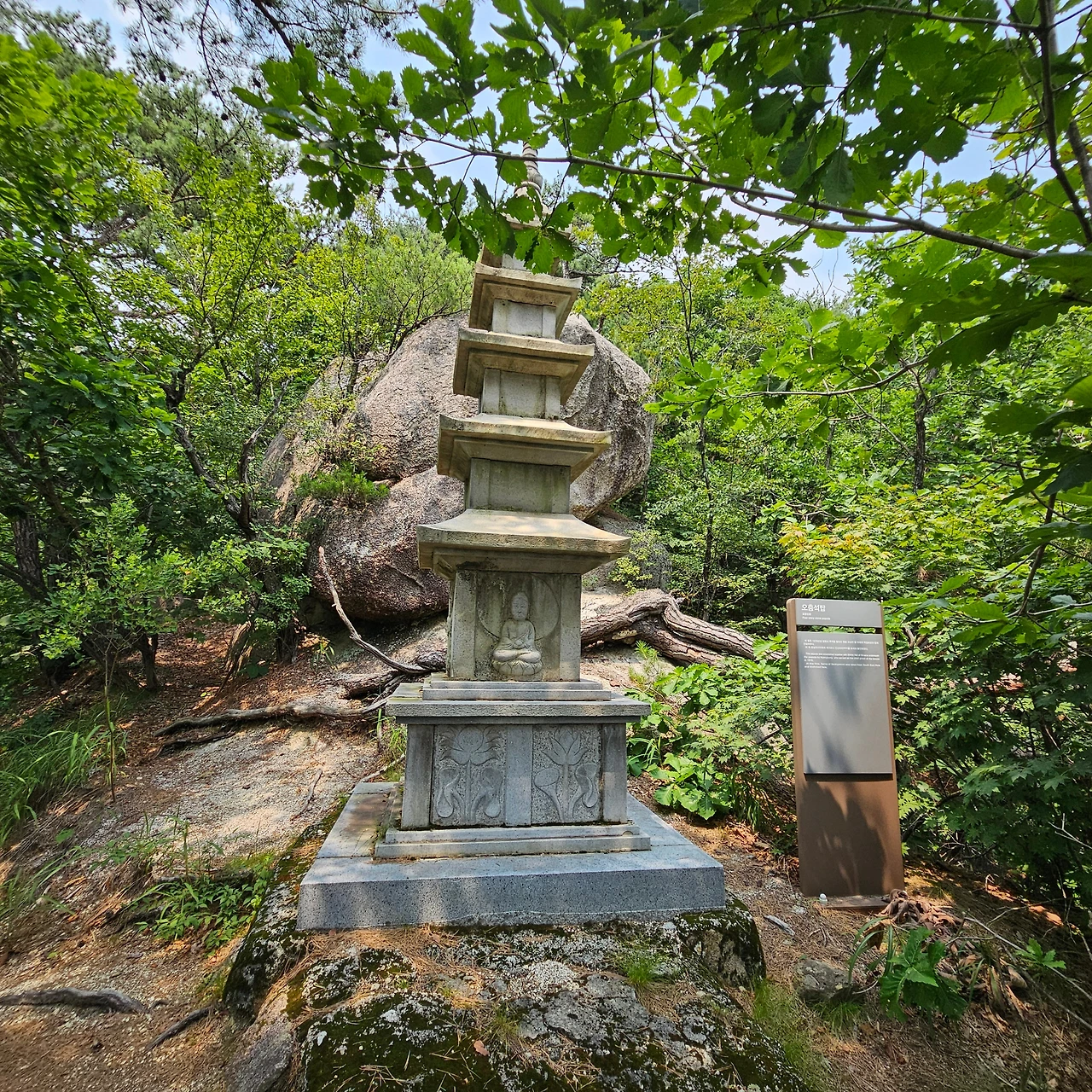 H 호기심이 발동하였다. 이곳에서부터 440m 지점에 오층석탑이 있다는 이정표를 보고 가보자고 한다. 왕복 1km가 되지 않기에 J와 내가 호응을 하고 H는 계곡에서 발을 담그고 쉬기로 하였다. 그렇게 440m를 가면서 이곳에 있었던 암자의 흔적을 보았다. 그리고 이곳에서 은둔 생활을 하였던 이자현(李資玄)이 37간 이곳에 머물렀다고 한다. 아래의 청평사도 그 흔적이라고 한다. 암자가 있었던 터가 있고 이자헌의 세수터도 있다. 더 위에 오층석탑이 있다. 오래된 탑이 아니고 1978년 건축한 탑이었다. 다만, 석가모니의 진신사리를 적명보궁에 안치하면서 이곳에 탑을 세웠다고 안내되어 있다. 이 오층석탑은 사리탑이라고 한다. 청평사에서 안내하는 자료를 보면 1979년경에 주지 향봉스님이 스리랑카에서 부처님 진신사리를 옮겨와 아래의 식암 터에 적멸보궁(현재 해체)과 함께 이 탑을 세우고 사리를 봉안하였으며, 고려시대 석탑의 양식을 모방하여 건립하였다고 한다. 그런데 적멸보궁 터라고 지도에는 표시되어 있다.