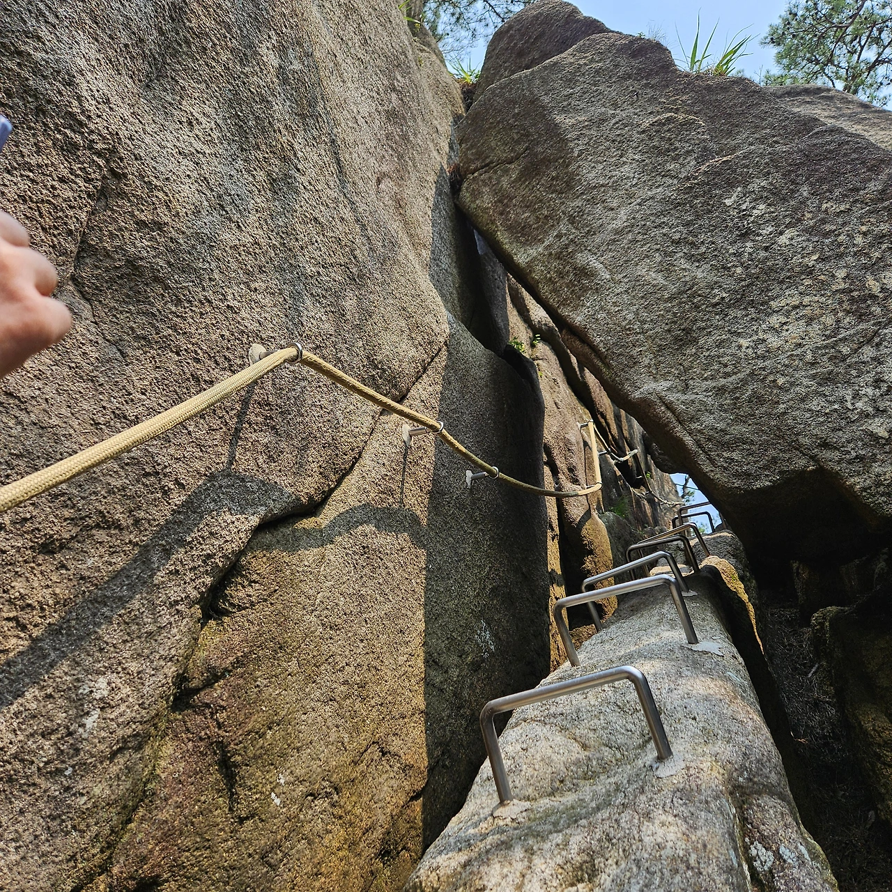 이제 홈통방위다. 어떤 곳에서는 구멍바위라고도 표기하여 놓았다. 그곳을 지날 때 조심조심 아니 적당한 키에 적당한 몸을 유지한 사람이 유리하다. 아니 키가 작거나 여린 사람이 유리하다고 할 것이다. 예전 장군들은 이곳을 지나가지 못하였을 것이다. 그 우람한 덩치로 인하여 홈통바위를 지나지 못하였을 것이다. 이 홈통바위를 바로 앞에 두고 다소곳이 머리를 숙이고 지나갈 뿐이다. 그렇게 지나면 이제 정상이 바로 코앞이다