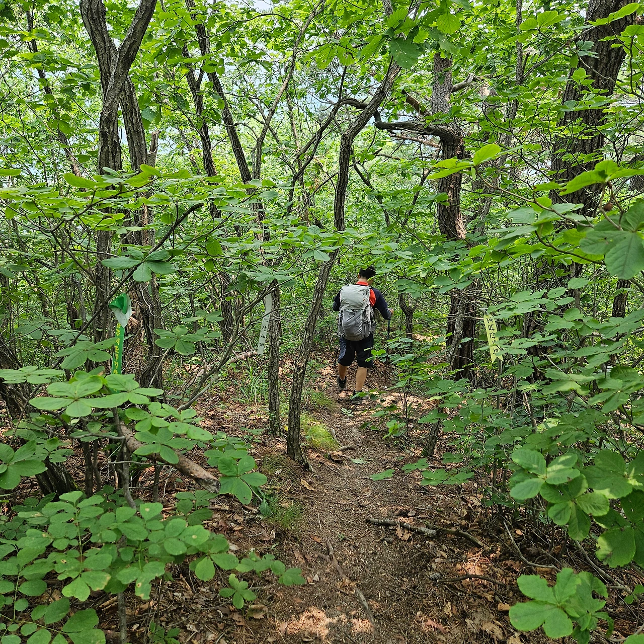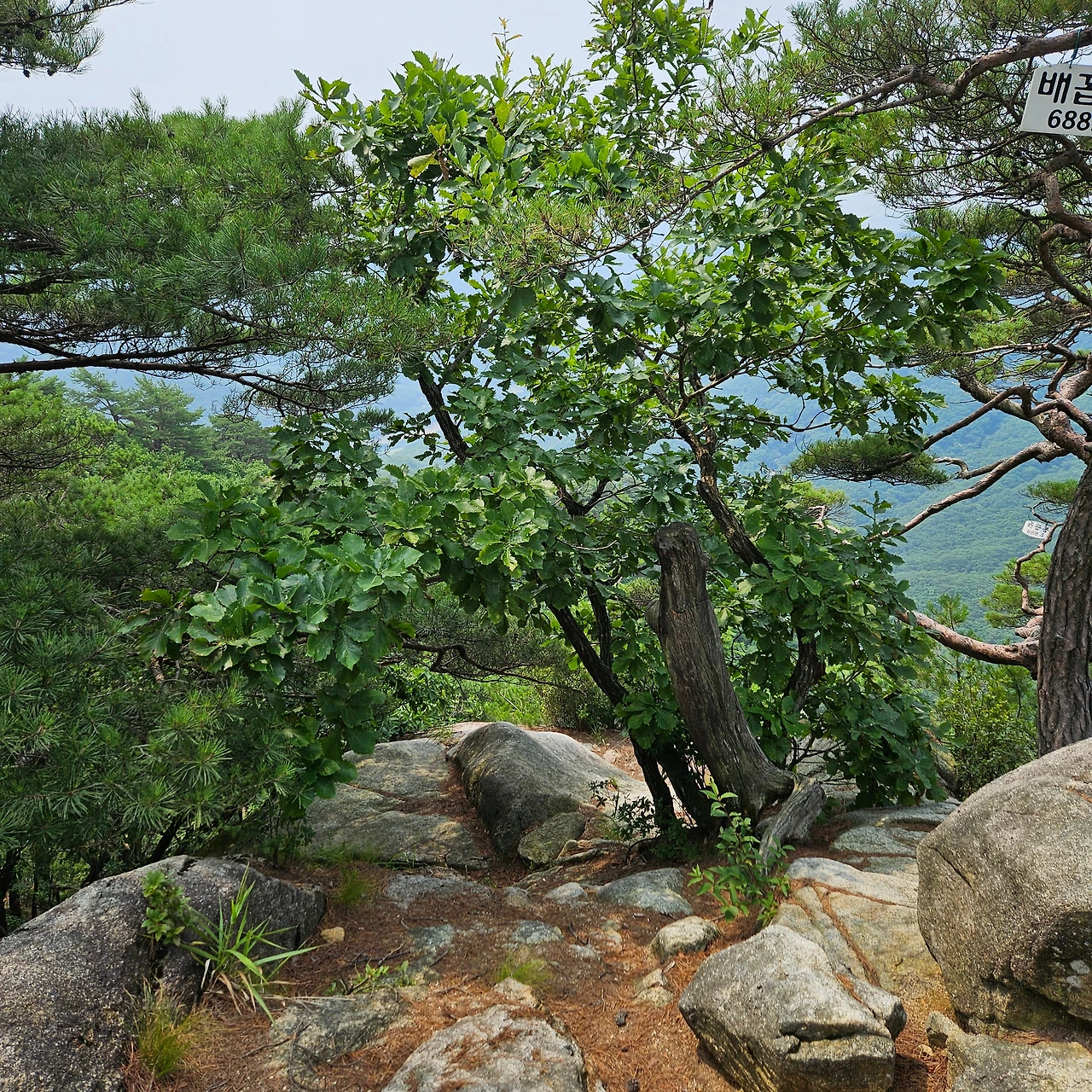 이제는 내려가는 길도 필요하다. 2봉과 1봉 사이에 난 길을 찾아야 한다. 오봉산 정상을 오를 때에는 정상으로 가는 길과 청평사 가는 길이라는 이정표가 있었는데 없다. 다만, 배후령 내려가는 길만 있다. 이정표가 없이 능선으로 빠지는 길이 있다. 그 길이 하산길이라고 생각하지만 또 다른 길이 있을까 하여 1봉까지 간다. 1봉까지 가면서 새로운 길이 없기에 조금 전 보아두었던 등산로로 다시 이동을 한다.