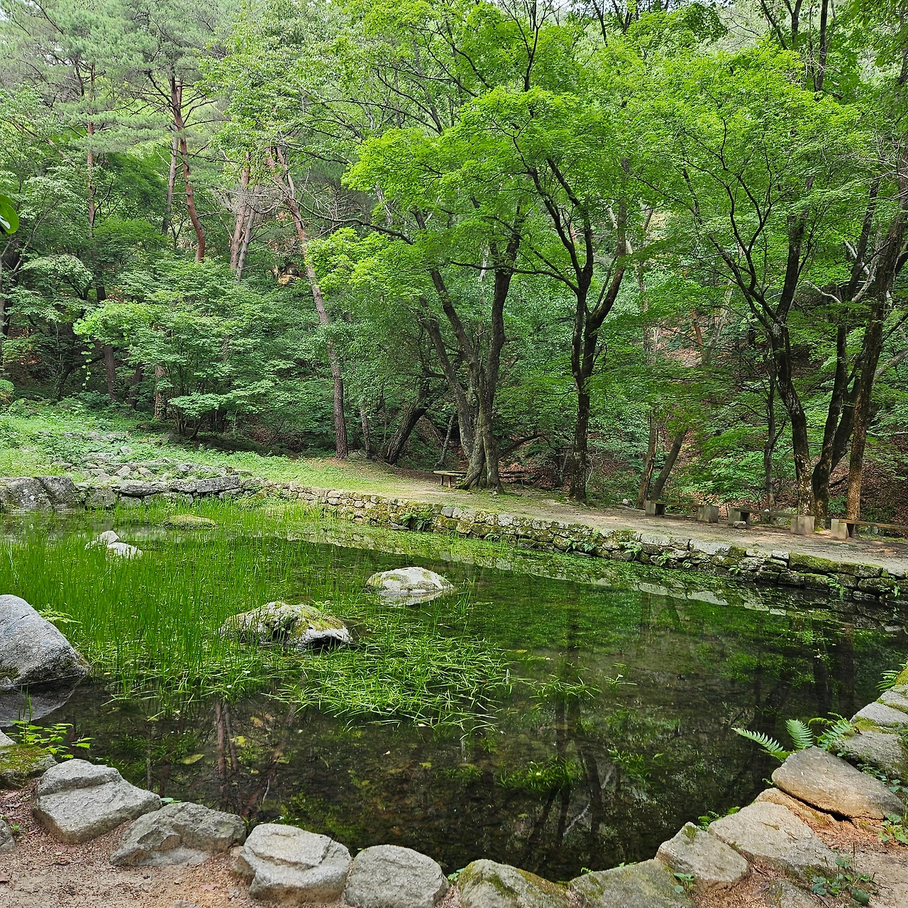 H는 공주탑을 찾아갔고 우리는 공주상을 찾으러 갔다. 그리고 내려가면서 영지를 보았다. 영지에서는 봉우리의 그림자가 보이도록 영지(影池)를 만들었다고 한다. 지금은 봉우리가 보이지 않고 나무의 그림자 보일 뿐이었다. 청평사에서 안내하는 자료를 보면 고려시대 진락공 이자현이 청평사 골짜기 전체를 사찰 경내로 삼아 선원(禪園)을 가꿨는데 그 중심에 영지가 있도록 했고, 조선 초기 김시습의 한시를 비롯한 많은 문인들의 시에 언급되어 있다고 한다. 일본이 자랑하는 교토(京都) 사이호사(西芳寺)의 고산수식(枯山水式) 정원보다 200년이나 앞선 정원이며, 한국 정원사(庭園史)에 중요한 자료라고 언급하고 있다.