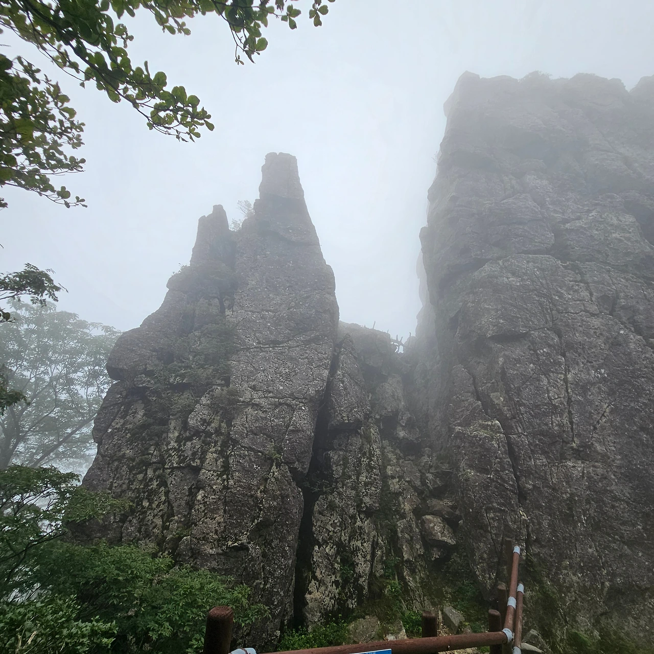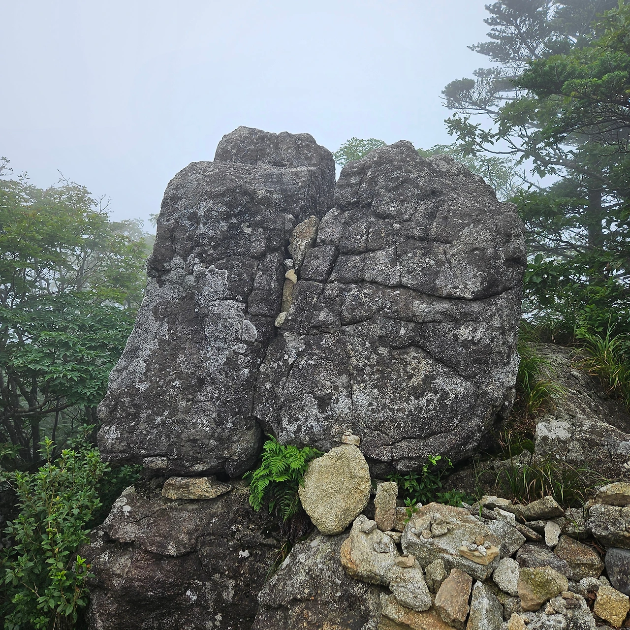 삼각봉을 쉽게 통과하고 형제봉을 지난다. 정상부에 2개의 암봉이 솟아 있는 형제봉이다. 형제봉 정상은 여기인데 형제봉 표시는 여기가 아니다. 왜일까 궁금해 하지만 곰탕이다. 앞뒤가 보이지 않는다. 오후에 소나기 예보가 있었고 그것이 우리에게 다가오는 것 같다. 멀리에서 천둥소리가 들린다. 마음이 급해진다. 곰탕 속에서 바위가 나타났다. 그것이 무엇인지 모르고 사진으로 담지만 왜 형제봉인지 몰랐는데 찾아보니 이렇다