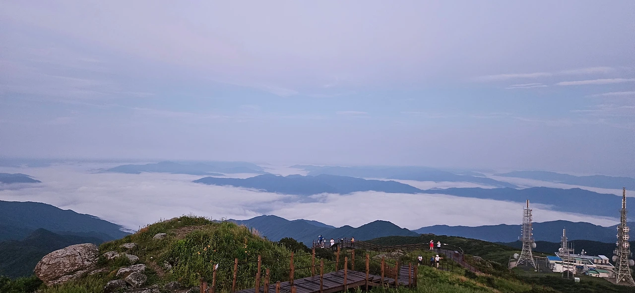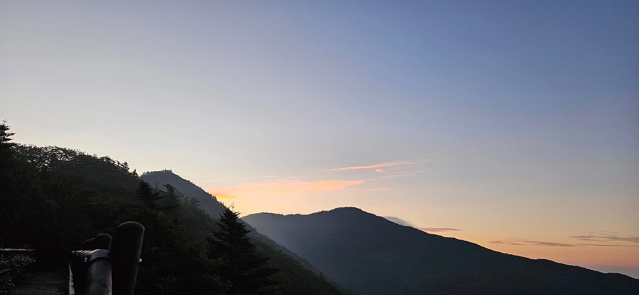 노고단 대피소에 도착하기까지 별빛을 보고 헤드랜턴에 의존하여 오른다. 그리고 노고단 대피소에 도착하여 여유를 찾고자 한번 쉬고 바로 올라가는 계단길을 피하여 돌아간다. H는 바로 계단을 통해서 올랐다. 그리고 노고단고개에서 노고단으로 가는 길이 열리기를 기다렸다. 5시부터 노고단이 개방이 되기 때문이다. 고개 주변을 돌아본다. 5시가 조금 못 미치는 시간이지만, 여명이 들면서 헤드랜턴이 필요 없는 시점에 노고단이 열렸다. 노고단은 사전예약제로 운영이 되고 있어서 한달전에 내가 예약을 하였고 그것을 인증하고 입구를 통과한 것이다. 노고단을 천천히 오르면서 노고단의 일출을 기대하는 우리의 마음이 멀리 산아래의 불빛이 우리의 마음속에 그대로 전달된다.
