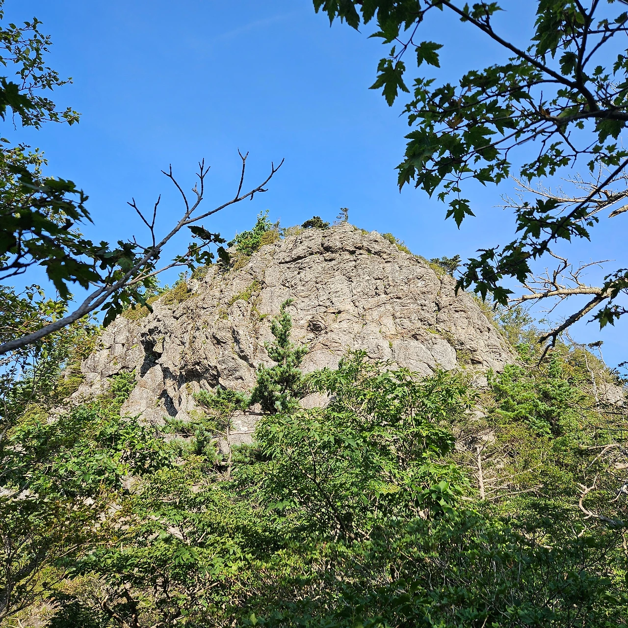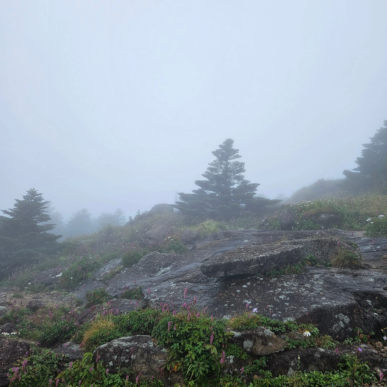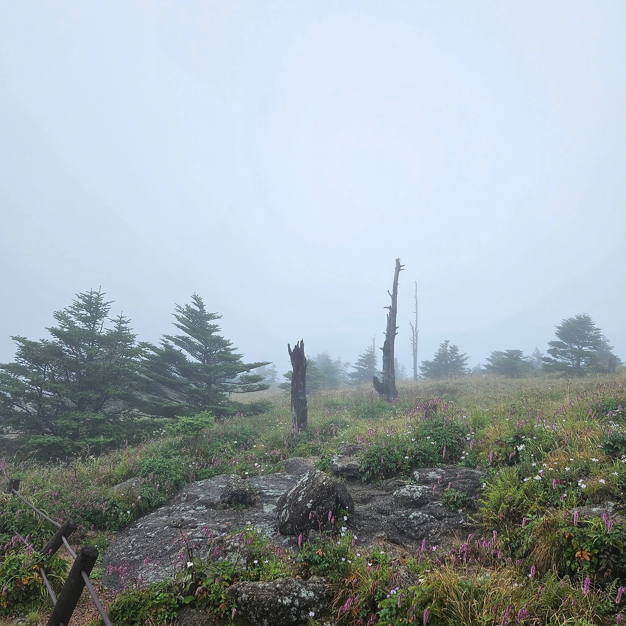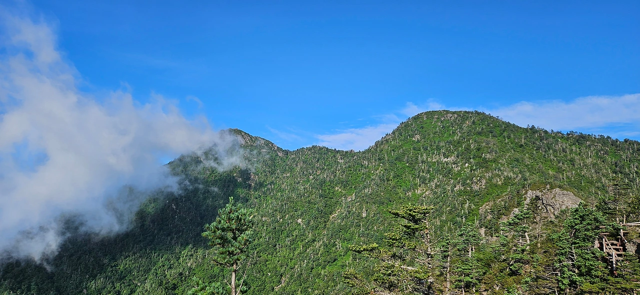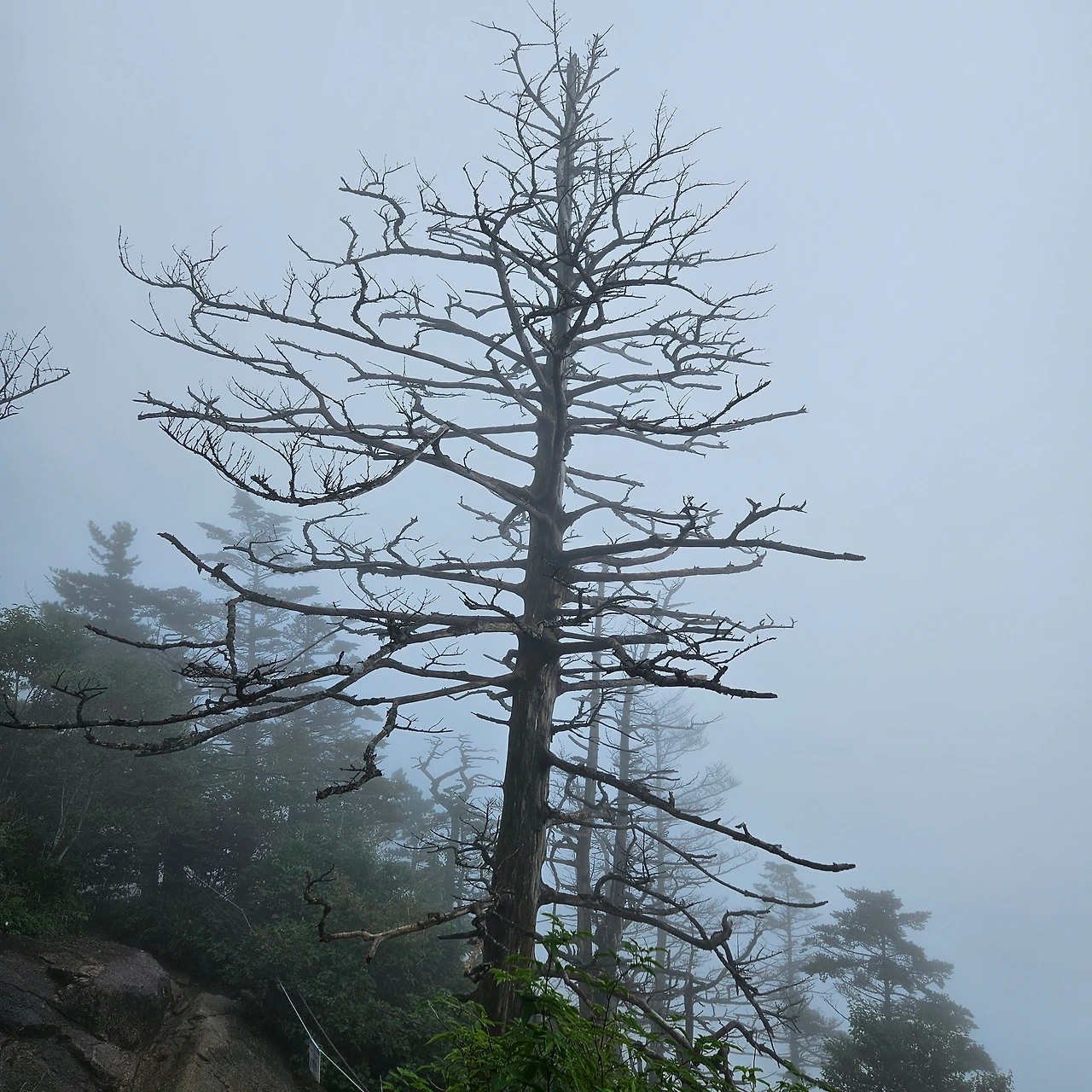 부지런을 떨면서 준비한 사람부터 밖에서 기다리기로 한다. 한 명씩 나가서 기다린다. 오늘도 어제와 똑같이 대피소 지붕에 설치되어 있는 태양광 패널에 이슬이 맺혀서 비처럼 처마를 젖시고 있다. 처마밑에서 일행을 기다리던 사람들이 화들짝 놀라면서 자리를 피하고 있다. 우리 일행이 모두 도착하여 파이팅을 외치고 출발한다. 바로 뒤에는 아빠와 아들 일행이 배낭 없이 따라붙는다. 제석봉은 장터목대피소에 바로 오르면 가파르다고 할 수 있다. 숨을 가쁘게 쉬고 있는데 헤드랜턴 불빛을 보고 불나방이 덤벼든다. 숨을 가쁘게 쉬면 입이 열리고 그 입속으로 나방이 들어간다. 얼굴을 때린다. 가쁜 숨을 들이켜는 구간을 지나 제석봉의 구상나무 고사목에 대한 안내판을 들여다본다. 헤드래턴 빛에 고사목 모습이 보일 뿐이다. 주간에 이 구간을 지나지 않으면 고사목을 완벽하게 볼 수 없을 것이다. 이곳에서 구상나무가 또 자라고 있다. 예전에 무단벌목을 한 사람들이 그것의 흔적을 없애기 위하여 불을 질렸다고 한다. 2023년 여름에 이곳을 지나갈 때 고사목을 담아 보았는데 그것을 여기에 올려본다.