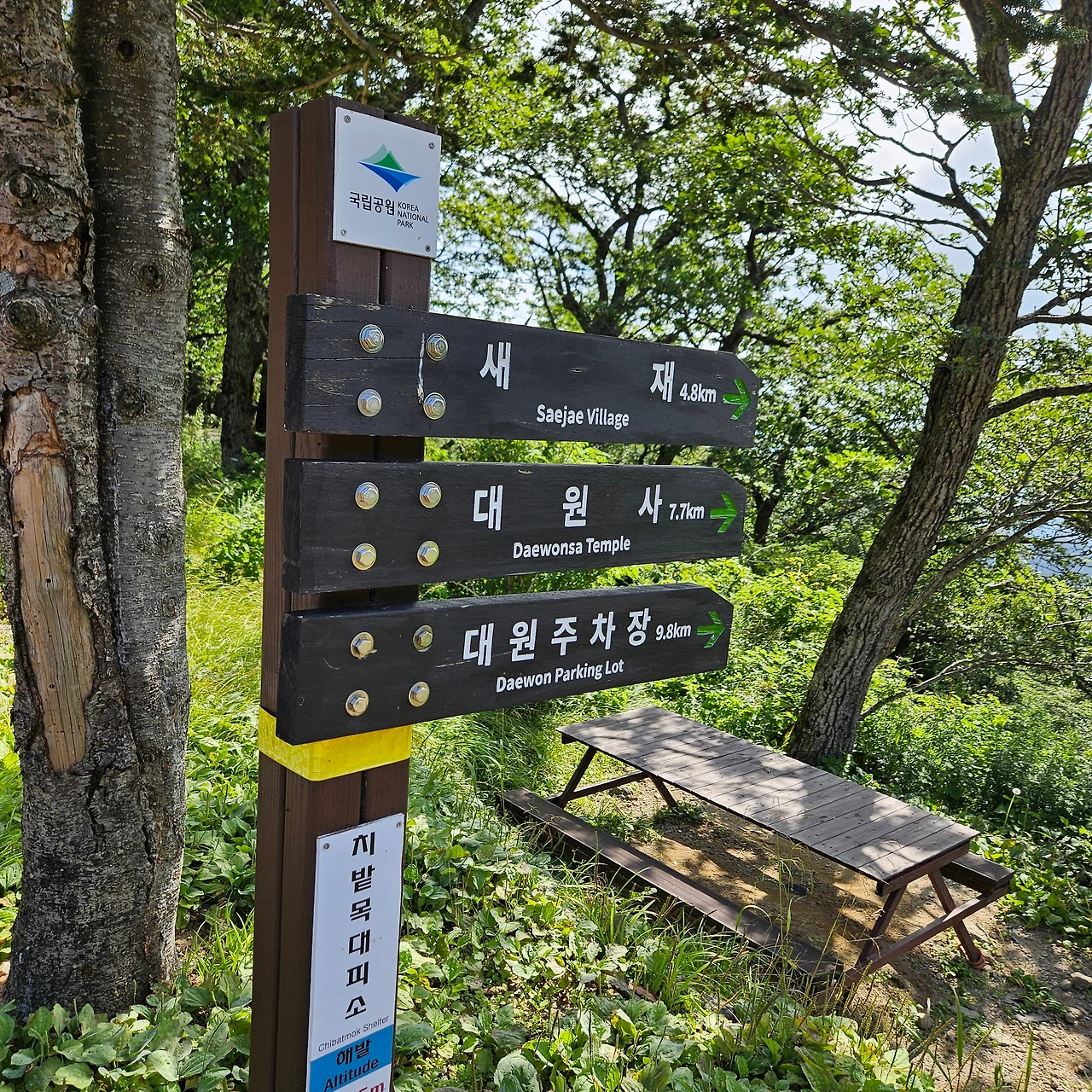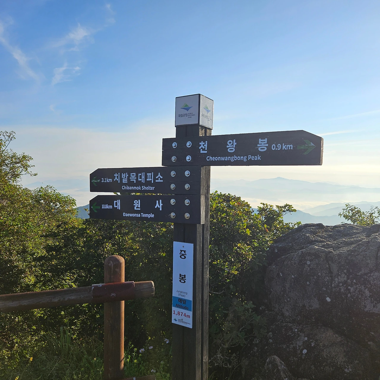 치밭목대피소까지 4km 정도이니 2시간이면 충분히 가능할 것이라고 생각하였는데 우리 걸음이 느려서 그런지 2시간 40분이 걸렸다. 중봉을 지나고 가파르게 하산을 하고 그곳에 있는 쉼터에 도착한 시간이 1km 약간 더 걸었다고 표시를 하고 1시간을 걸었다. 사실 국립공원공단에서 안내하기로 3시간 정도 걸린다고 소개되어 있다.