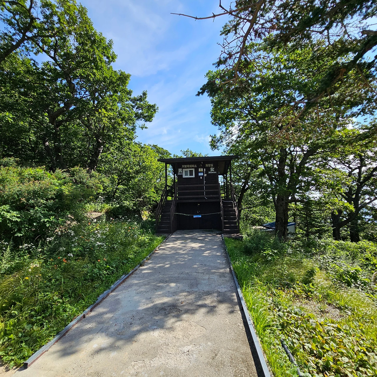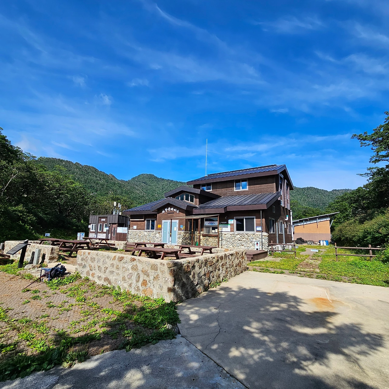 2시간이면 충분할 것이라고 생각하였던 치밭목 대피소에 도착하니 2시간 40분이 지났다. 내려오면서 무엇을 계속 먹어서 그런지 이곳에서 아점을 해결하려고 하였던 부분을 취소하였다. 치밭목대피소의 식수터는 100m 정도 왼쪽으로 들어가야 했다. 그곳에서 식수를 가져와서 아점을 하기에는 시간이 20분 이상 추가적으로 소요될 것 같아 그곳까지 이동을 하여 식수를 보충하고 다시 정비를 하고 미숫가루 등으로 아점을 대신하였다. 치밭목대피소는 예전에 민간이 운영하던 것을 국립공원공단이 인수하여 대피소로 운영하고 있다고 한다. 월간 산 7월호에 보면 “치밭목대피소는 느긋하게 지리산을 만끽할 수 있는 곳이에요! 이용객이 적어 한적하고 여유롭죠. 여기서 근무하고 싶어 하는 직원들이 꽤 많아요. 지리산 대피소 중 근무 경쟁률이 가장 치열한 곳이죠.”하면서 대피소 직원들이 가장 선호하는 대피소라 한다. 그만큼 산행객들이 적다고 보면 될 것이다. 이곳의 화장실도 특이하다. 이층에 있다.