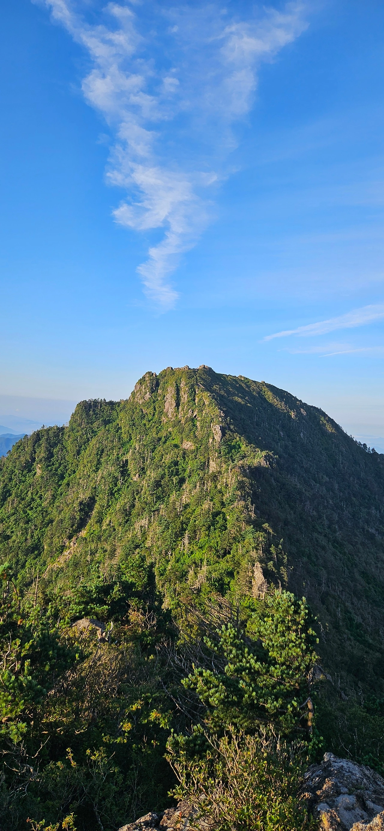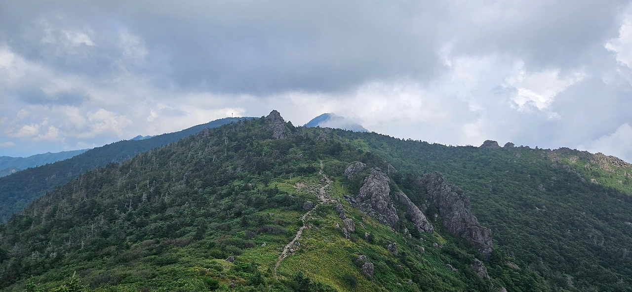 중봉을 내려가면서 중봉을 담고 중봉을 올라가면서 천왕봉을 담았다. 중봉에도 정상석은 없었다. 사실 지리산주능선에 정상석이 있는 곳은 천왕봉, 반야봉, 노고단에만 본 기억이 있다. 나머지는 이정표에 위치를 표시하여 둔 것을 보았다. 중봉도 동일하였다. 지리산 전체에서 높이가 두 번째이지만 지리산 천왕봉에 가려져 의미가 없다. J가 "중봉은 억울하다. 설악산보다 높고, 덕유산보다 높은데 천왕봉이 높아서 그 아류인 지리산의 다른 봉은 높다고 이야기를 하지 못하다"라고 하였다.
