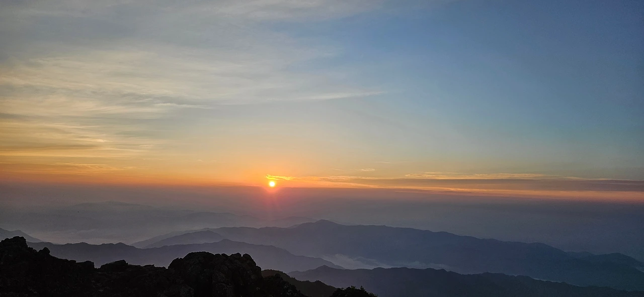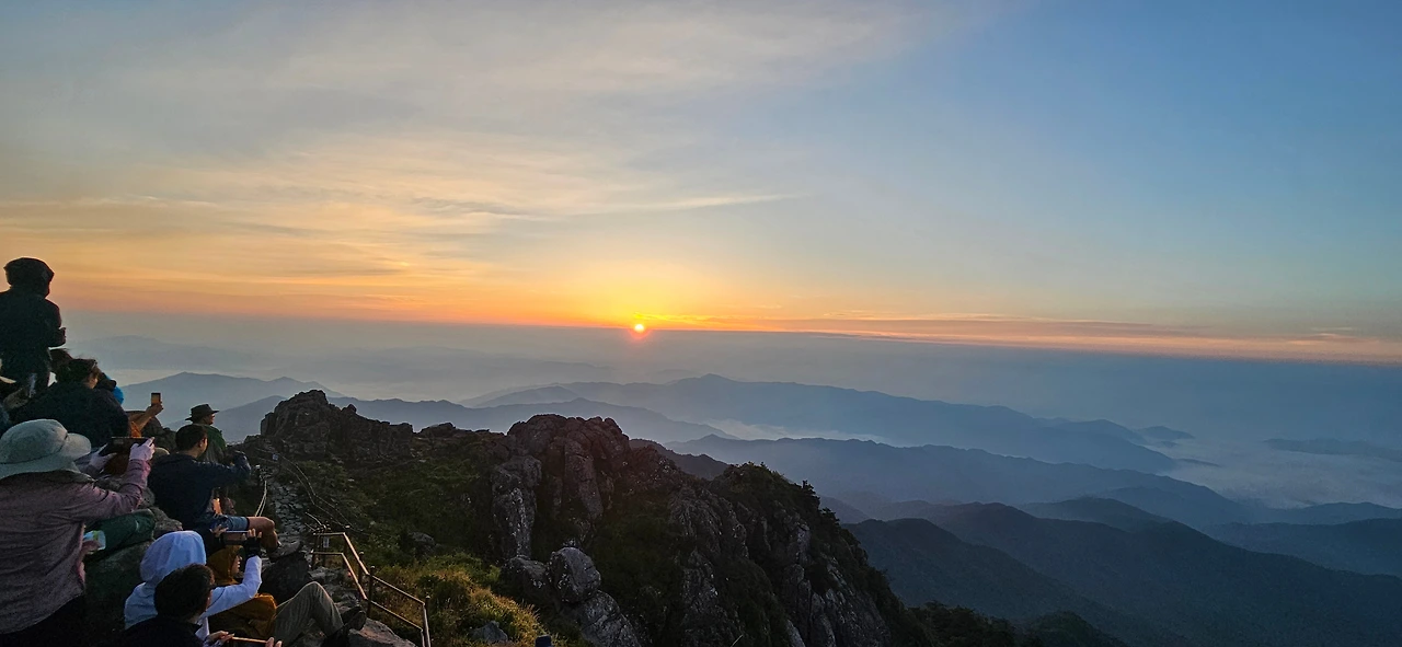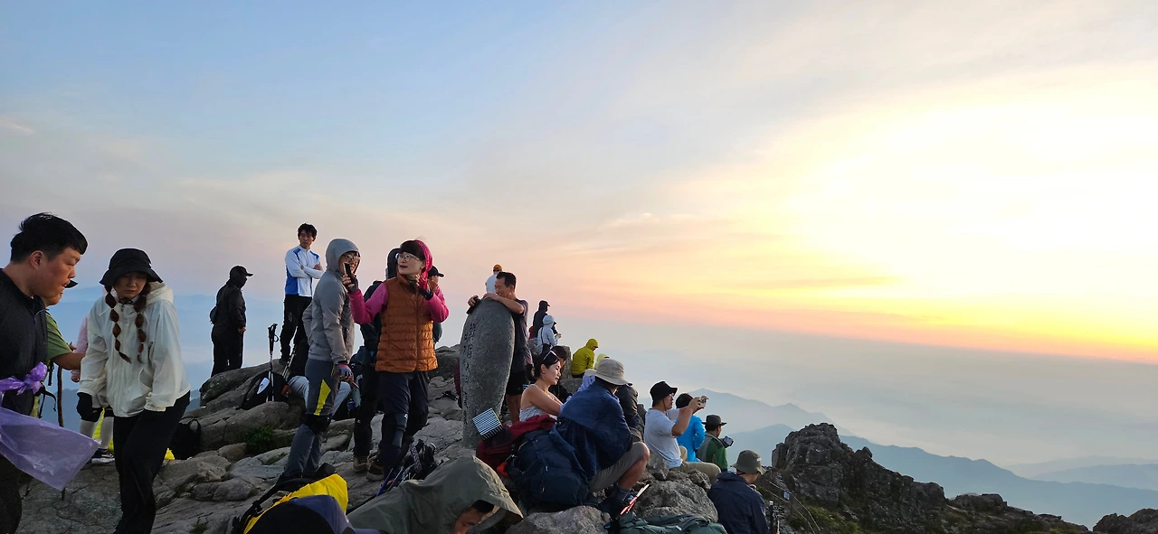 해가 뜨기 전이 가장 춥다고 하였다. 방풍재킷을 입고 바람을 막아주는 곳에 앉아 아침이 아닌 간식으로 시간을 보내면서 일출을 기다린다. 우리는 하늘의 밝기가 변화될 마다 한 번씩 스마트폰을 열어서 하늘을 향해 셔터를 누른다. 지리산 10경 중에 일경이 천왕봉 일출이라고 하는데 그 모습을 보고 싶어서 오늘 많이도 왔다. 그리고 하늘에서 아침놀과 함께 일출을 보았다. 일출에 대한 설명을 학창 시절 의유당 김 씨의 동명일기보다 묘사를 못할 것 같아 여기에 그것을 옮겨본다. "급히 눈을 들어 보니, 물 밑 홍운(紅雲)을 헤앗고 큰 실오리 같은 줄이 붉기 더욱 기이(奇異)하며, 기운이 진홍(眞紅) 같은 것이 차차 나 손바닥 넓이 같은 것이 그믐밤에 보는 숯불 빛 같더라. 차차 나오더니, 그 우흐로 적은 회오리밤 같은 것이 붉기 호박(琥珀) 구슬 같고, 맑고 통랑(通朗)하기는 호박도곤 더 곱더라."([출처] 동명일기(東溟日記)-의유당 김씨)