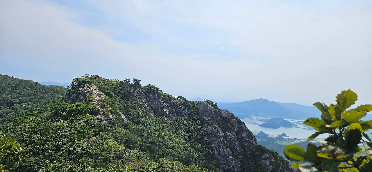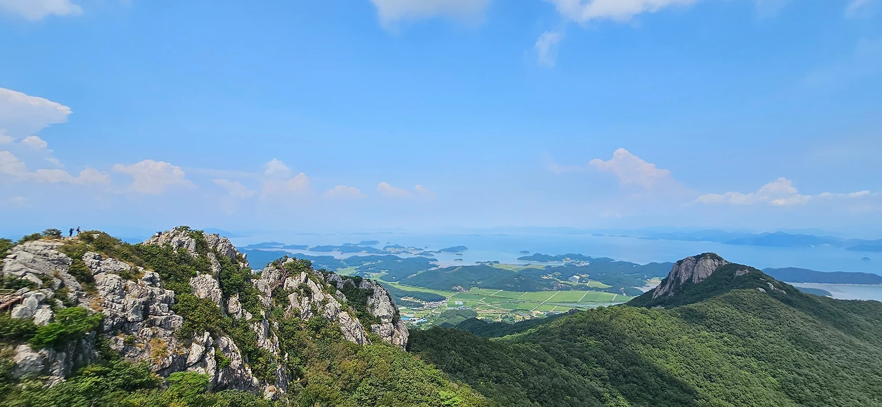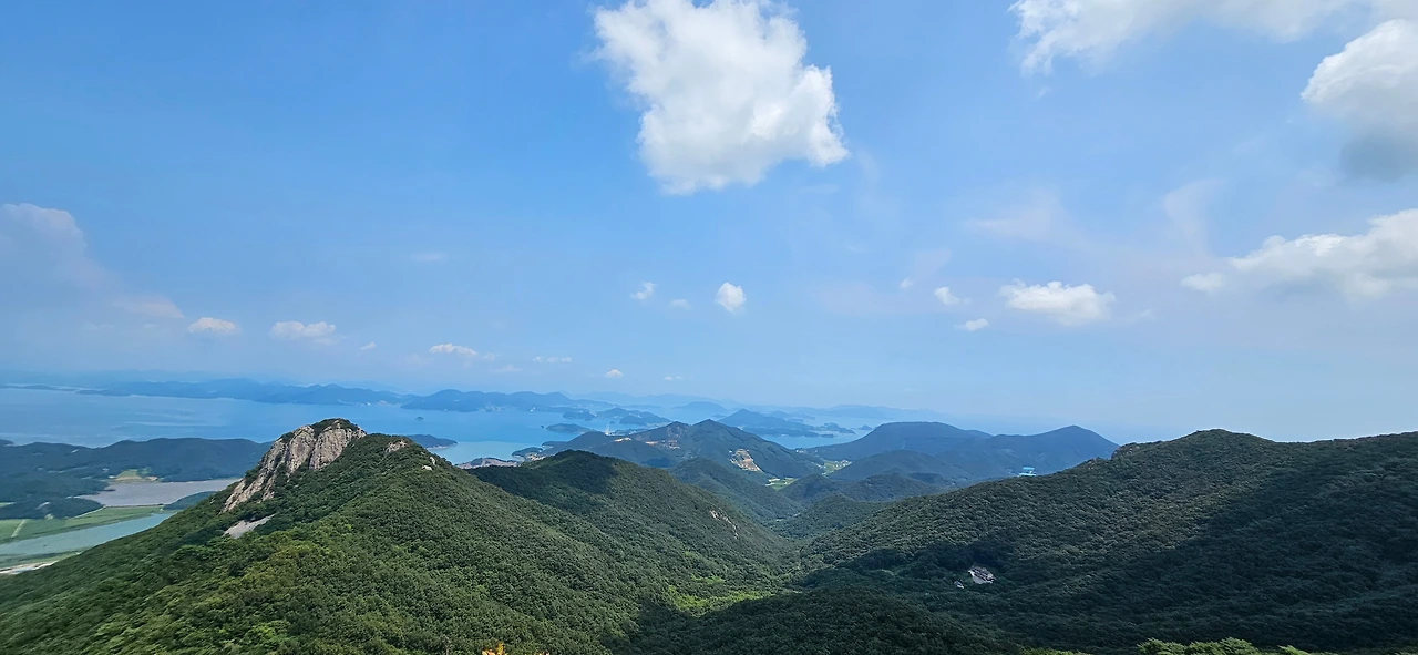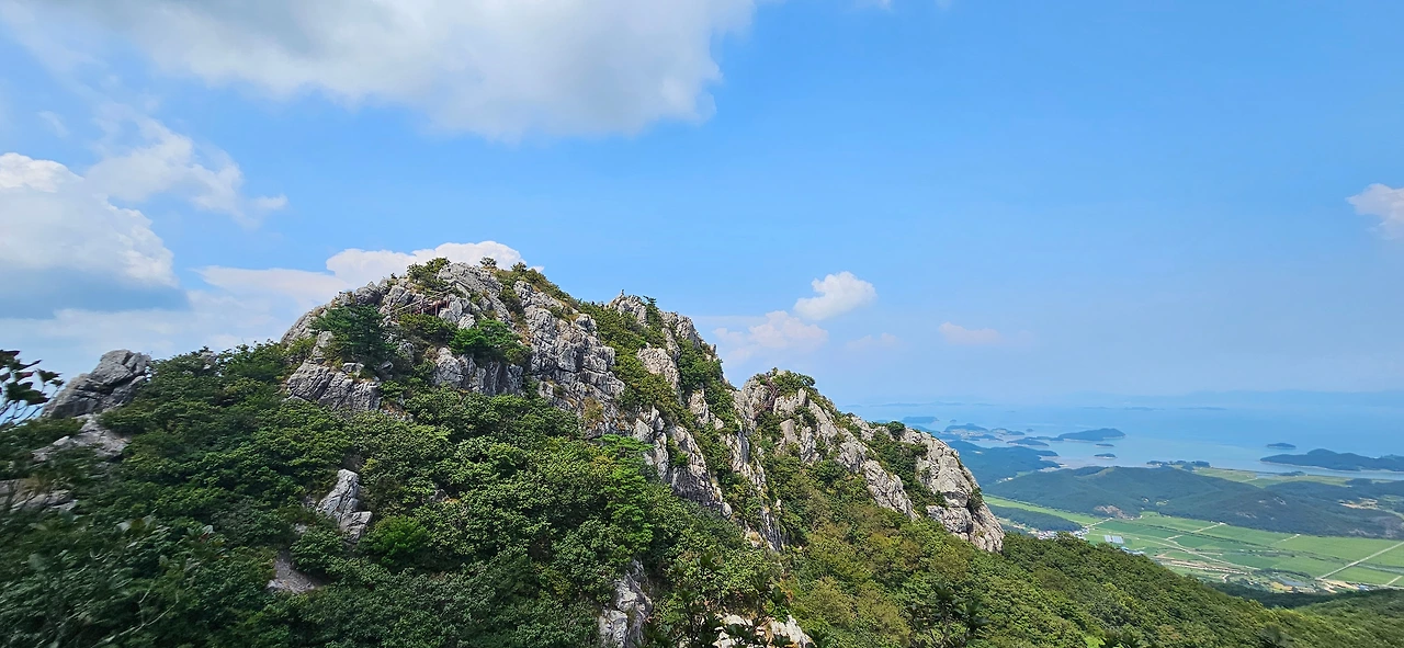 멀리 팔영산의 그림자가 보인다. 그 봉우리가 오묘하다. 지나가면서 슬쩍 사진으로 담았는데 마지막에 깃대봉을 가면서 사진을 담는 것이 보다 명확히 팔영산을 담았다고 할 수 있다. 버스는 능가사 주변에 있는 주차장에 주차를 한다. 버스에 내려서서 얼마나 더울까 하였는데 생각보다 덜이다. 바닷바람이 불어서 그런지 폭염처럼 느끼지는 못한다. 능가사는 내려오면서 한번 보기로 하고 팔영산을 바로 간다. 팔영산이라는 이름은 여러 가지 설이 있지만, 고흥군 홈페이지에서 찾아보니 이렇다. 팔영산의 본디 이름은 팔전산(八顚山)이었다. 중국 위왕의 세숫대야에 그 봉우리가 비친 고사에서 그림자 영(影)을 쓴 팔영산이라고 주로 부르고 있으며, 김정호의 대동여지도에는 신령할 령(靈)으로 표기되어 과거 신령한 산으로 팔령산이라고도 했다고 한다.