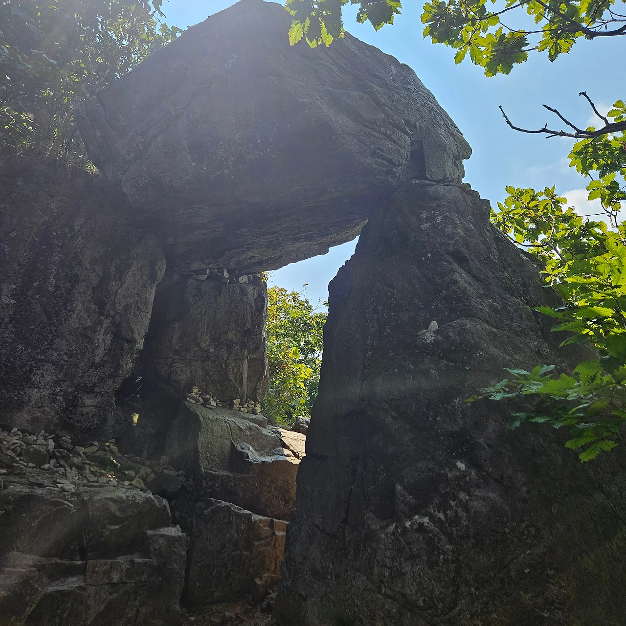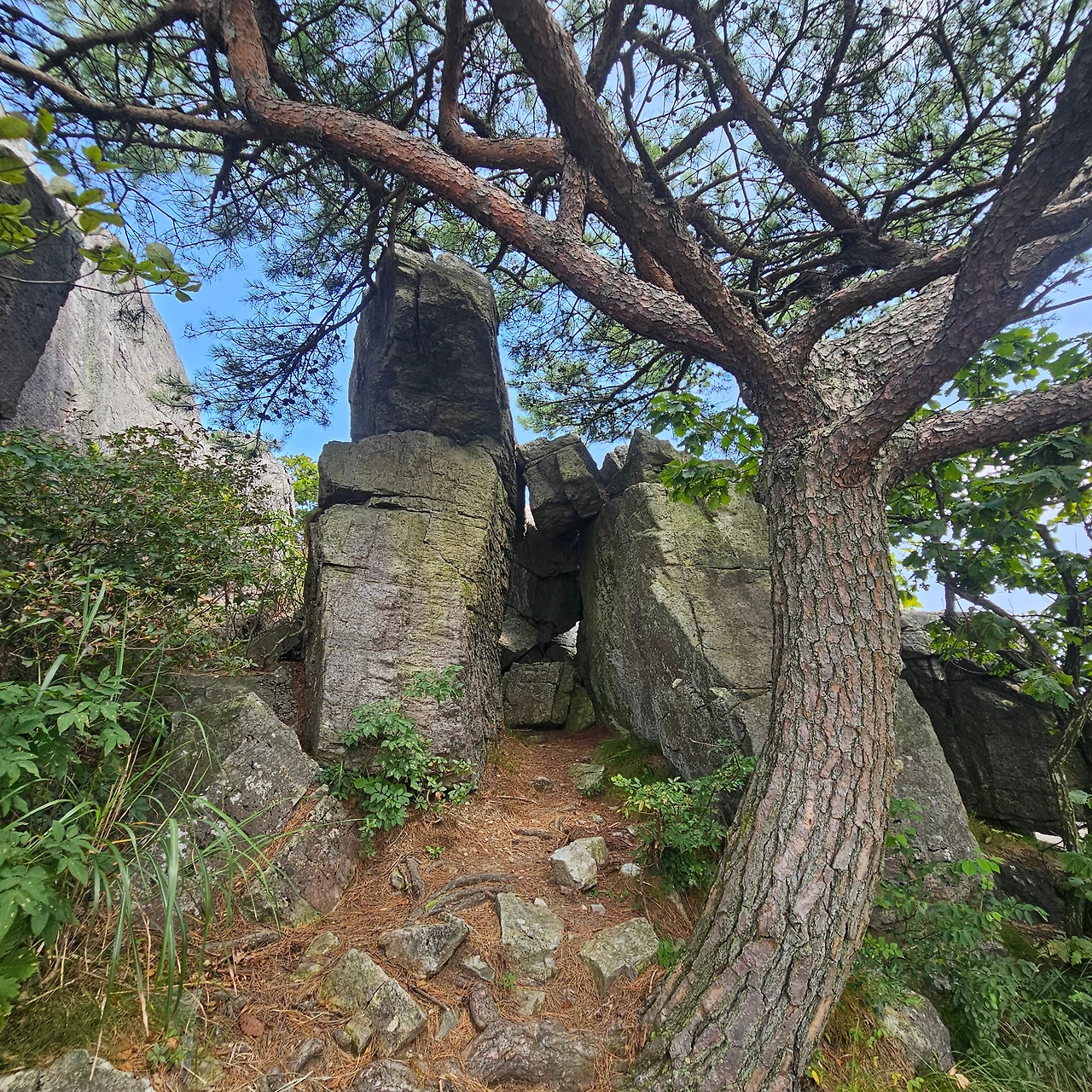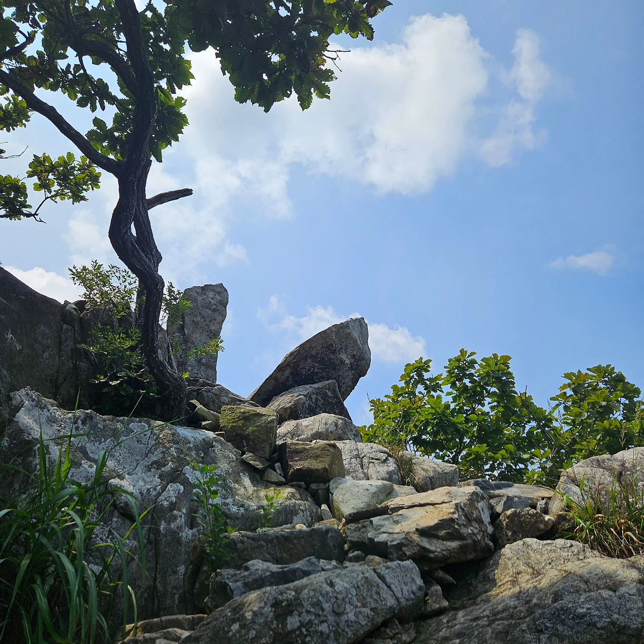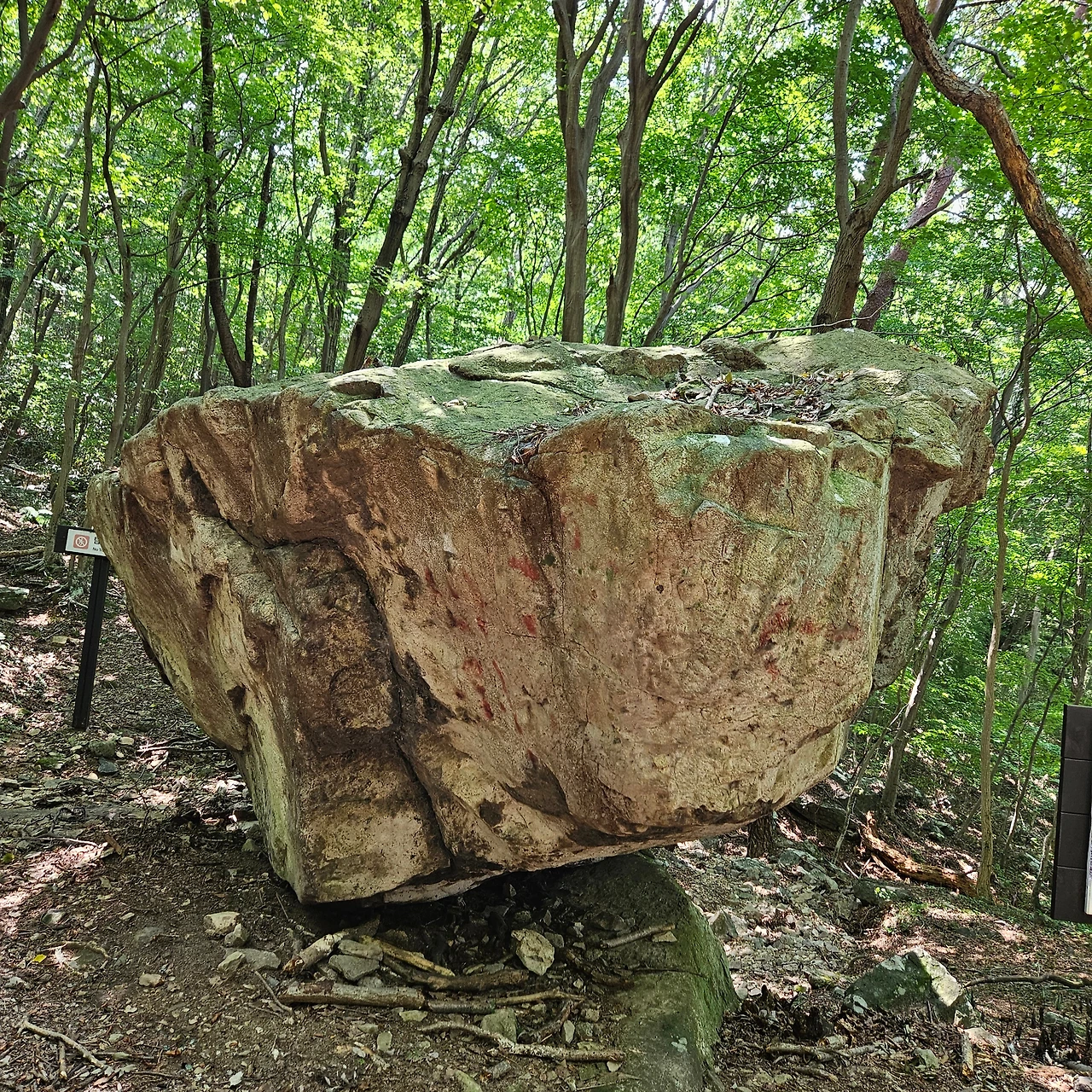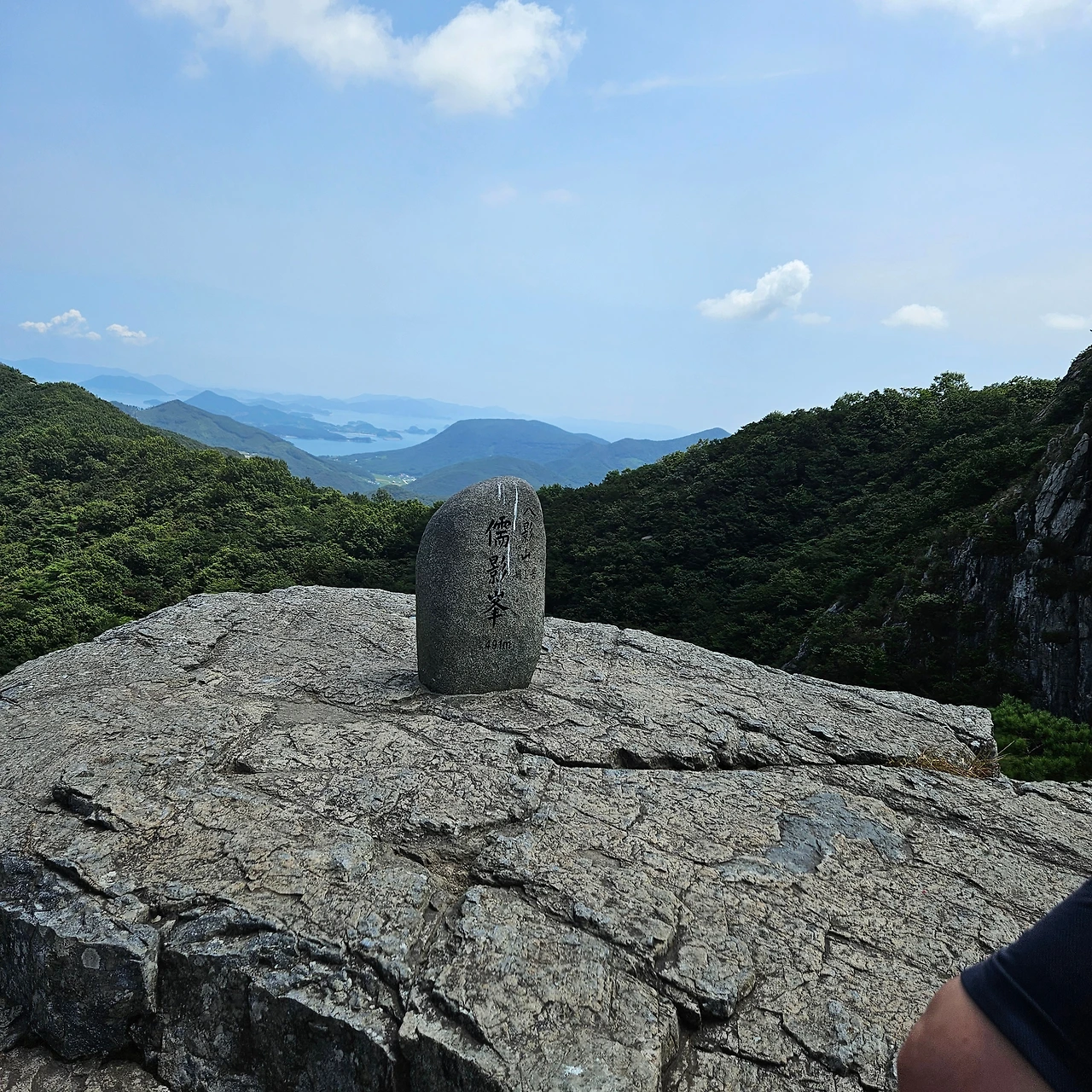 이제 산행을 시작한다. 야영장이 끝나는 지점에서 등산로를 알리는 이정표를 따라 올라간다. 우리보다 앞서온 동네산악회 회원들이 있다. 언니, 누나, 오빠, 동생, 형 등 다양하 용어가 오가고 무전기에서 흘러나오는 위치 안내도 등산로를 복잡하게 하고 있다. 12시 가까이 되어 등산을 시작하여서 그런지 등이 바람이 불어 시원하게 느끼지만 등은 땀으로 흥건하다. 흔들바위까지 사람들이 쉴세 없이 오른다. 시간이 촉박하지도 않은데 쉬어갈 수 있는 휴식터가 없어서 그런 것 같다. 바닷가에서 등산을 하는 것은 해발이 400m를 오르는 것도 힘들다. 그 400m가 10m 이내에서 출발하여 오롯이 400m를 오르기 때문이다. 흔들바위는 마당처럼 꼼짝하지 않는다고 하여 마당바위라고도 하였다고 한다. 하지만, 어른 몇 명이 지속적으로 흔들면 흔들린다고 하여 흔들바위 하고 한다고 하였다.