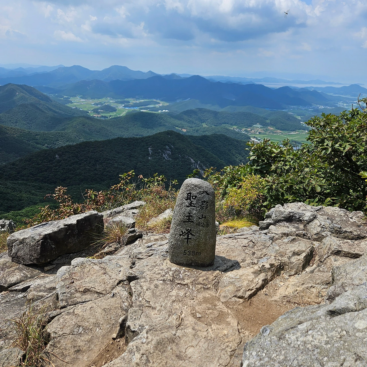 1봉에서 보면 2봉의 암릉을 오르는 데크가 보이고 그 데크를 오르면 되는 것이다. 안전펜스도 있고 그 펜스를 잡고 오르거나 데크를 걸으면 된다. 이곳에 오래전에 왔던 사람들은 도립공원시절에는 데크가 없었지만 국립공원이 된 후 데크가 만들어졌다고 한다. 2봉은 성주봉이다. 누군가가 옆으로 지나가면서 "성주신이 있는 봉우리를 간다"라고 하였다. 국립공원공단에서는 2봉인 성주봉을 "성스런 명산 주인 산을 지킨 군주봉아 팔봉 지켜 주는 부처 같은 성인바위 팔영산의 주인 되신 성주인 얘기로세"라고 소개하고 있다. 성주봉의 정상석 주변은 그늘이 없어서 지나친다. 그리고 경치가 잘 보이는 곳에서 1봉과 함께 선녀봉을 담고 가야 할 3봉부터 4봉 등을 담는다.