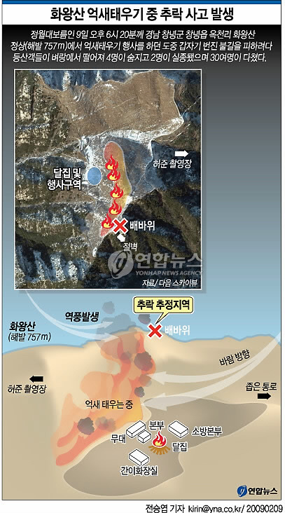 2009년 당시 화왕삭 억새태우기 행사의 모습(출처 : 오마이뉴스, 연한뉴스) 배바위를 지나고 곰바위가 있다. 곰바위라고 하는데 두더지 바위라고 해야 할 것 같다. 이제 하산이다. 하산을 하기 바로 전에 시간이 있어 여유를 갖고 산을 둘러보는 장소에서 돌아본다. 바로 앞에 암릉이 보이고 그리고 창녕읍의 전경이 보인다. 하산은 쉼터에서 내려서자마자 갈림길에서 오른쪽으로 방향을 잡는다. 도성암으로 가는 길이다. 도성암으로 내려가는 길이 가파른 내리막이다. 중간중간에 화왕산 암릉 전체를 조망을 한다. 그렇게 내려가면서 화왕산을 조망하는 것이다. 내려가고 내려가고 하면서 암릉사이에 난 길을 찾고 그 길을 따라 하산을 한다. 스틱이 필요 없고 두 손으로 안전지주와 안전줄을 잘 잡는 것이 최선이라고 할 것이다. 계곡에서 올라오는 사람도 있는데 거리는 짧지만 쉽지 않은 길이라고 본다. 차라리 옥천주차장에서 올라오는 것이 편한 길이라고 보아야 할 것이다.