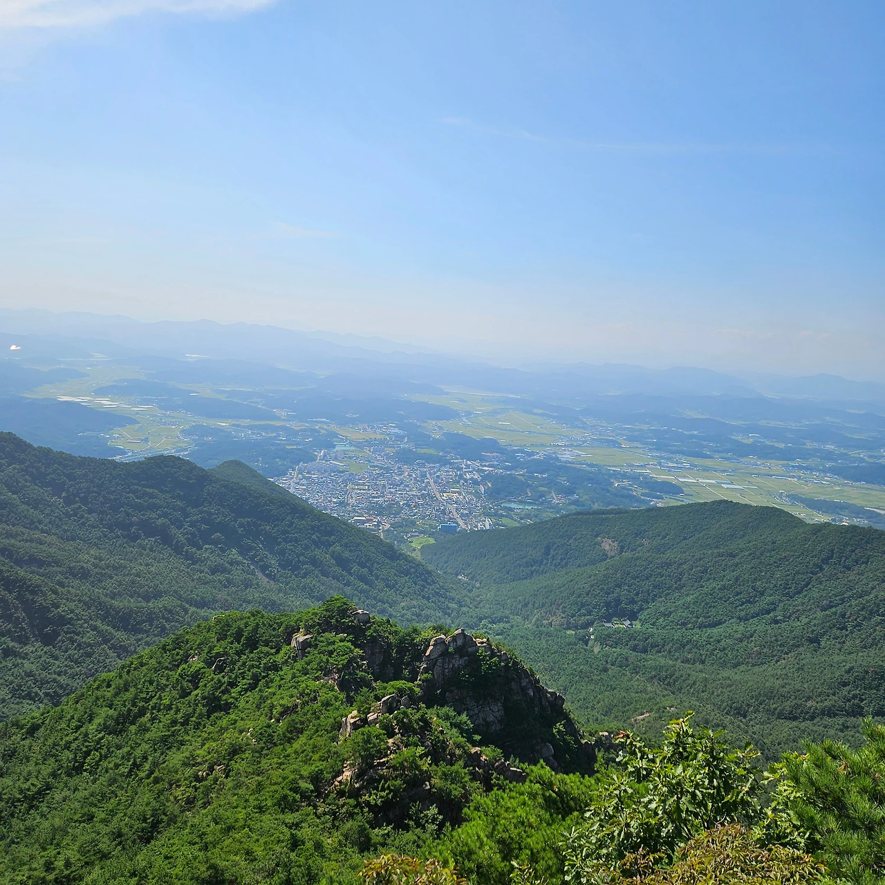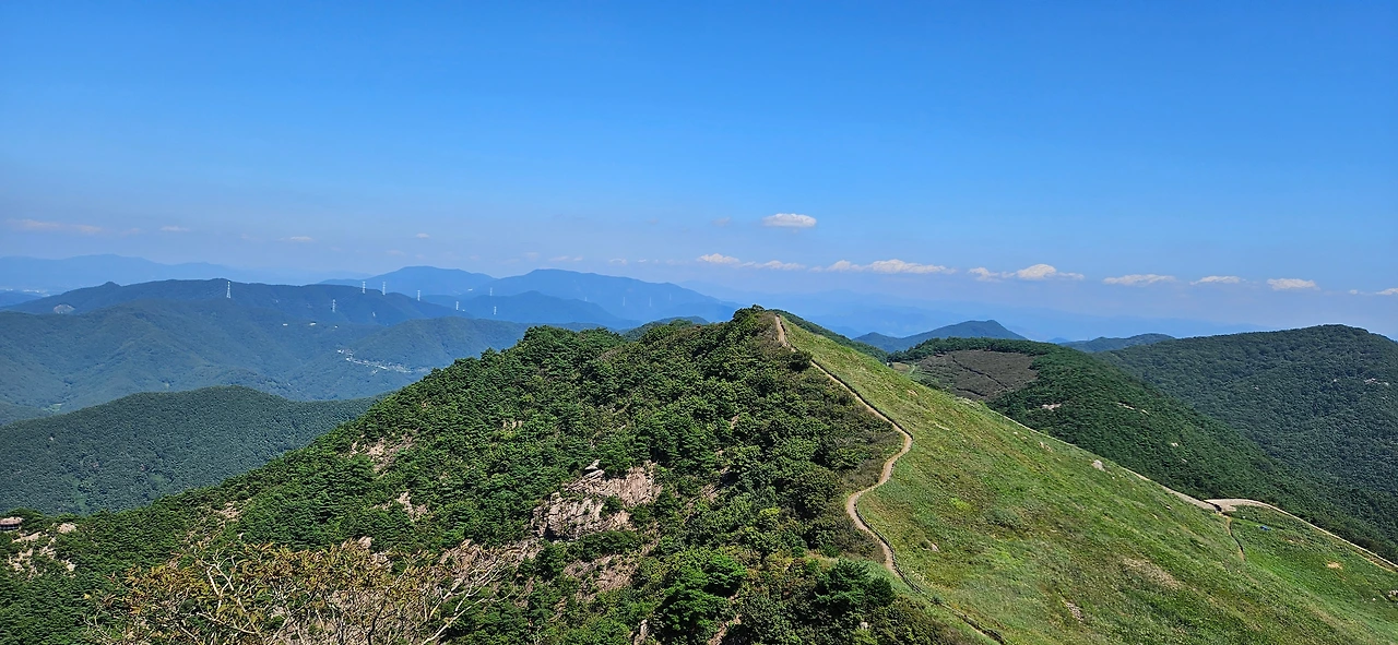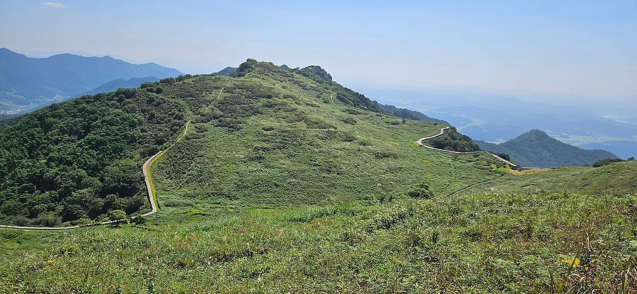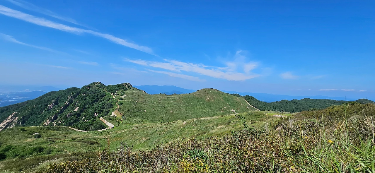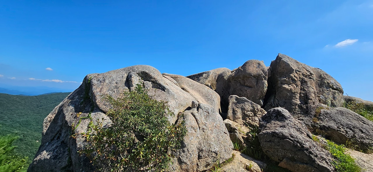 화왕산 정상 근처에는 다양한 바위가 많다. 창녕군에서는 그 바위에 대하여 다양한 이름을 붙여놓았다. 거북이 바위, 미소바위 등이 있다. 정상에서 인증을 하고 서문방향으로 이동한 후 배바위를 올랐다가 하산을 할 것이다. 정상에서 내려오자마자 미소바위가 있고 서문이 있다. 그리고 배바위로 올라간다. 배바위로 올라가면서 햇빛이 강하게 때리는 억새밭 사리를 걸어서 올라가면서 지리산의 연하선경의 모습을 엿볼 수 있었다.