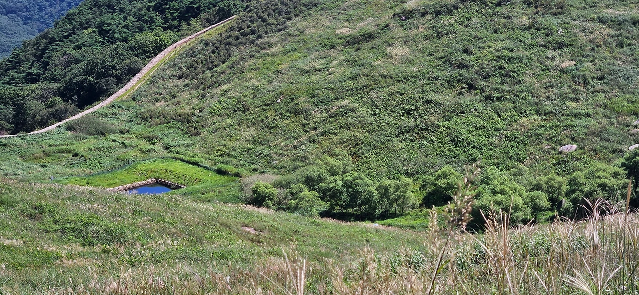 이제는 바로 앞에 화왕산성이 보인다. 산성을 복원한 것이라고 한다. 산성의 동문을 들어서면 딱 뜨인 억새밭이 눈앞에 들어온다. 초원의 억새를 보러 온 것이다. 가을이면 억새꽃이 피었겠지만 오늘은 아니다. 창녕군에서는 억새군락지를 복원하고 있으니 들어가지 말라는 안내를 하고 있다. 이제는 산성 둘레길이다. 약간 오르면 둘레길 정상이라고 표시되어 있고 억새밭 전체를 조망할 수 있다. 억새밭 중앙 구릉에 연못이 있고 산 위에 버드나무가 자라고 있다. 이곳이 산성이 된 이유를 그대로 설명하고 있다. 화왕산 정상은 구릉지대이고 억새밭이 있지만, 화왕산성내부를 제외하고는 암릉지대다. 그 산성의 성안의 곳곳에서는 조선·고려의 자기편들과 신라·가야의 토기편들이 출토되고 있어, 가야시대부터 조선시대까지의 장기간에 걸쳐 화왕산성이 군사적으로 이용되었음을 짐작케 한다고 한다. 산성 중앙의 연못 주위에는 많은 건물터가 남아 있다.