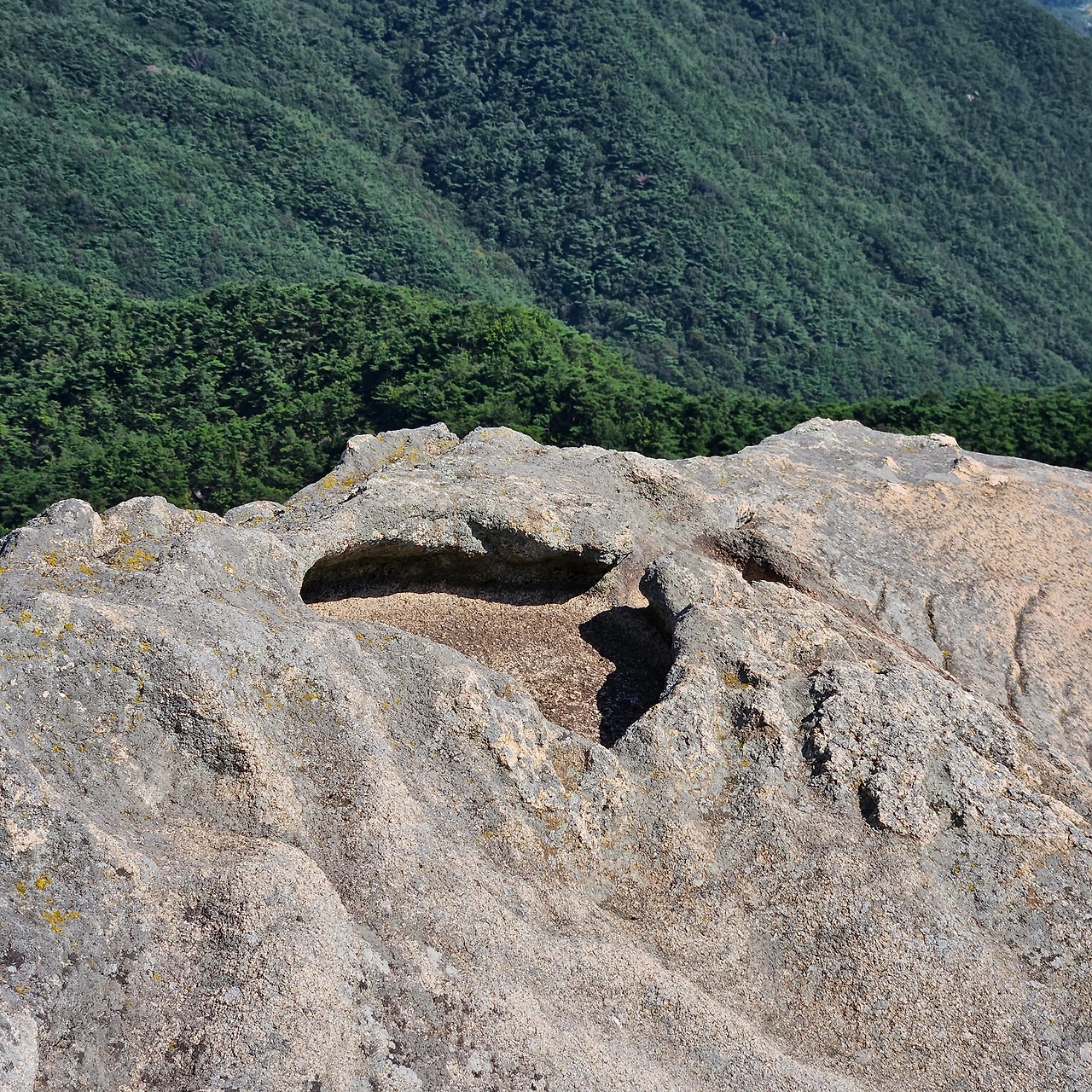 배바위를 상상하면서 올라갔는데 배모양의 바위는 없다. 다만, 전설을 소개하고 있다. 옛날 홍수가 나서 정상 근처까지 물이 이곳까지 가득하였는데 배를 배바위에 묶어두어서 배바위라고 한다고 하였다. 부두에 배를 밧줄로 묶어두기 위해 설치한 말뚝 대신으로 바위를 사용하였다는 것이다. 고창선운산의 배맨바위와 같은 의미라고 할 것이다. 배바위라고 하여서 배모양일 것이라고 상상한 우리를 무색하게 하고 그 위에 파인 곳이 있는데 그곳을 홍의장군 곽재우장군의 세숫대야라고 하였다.