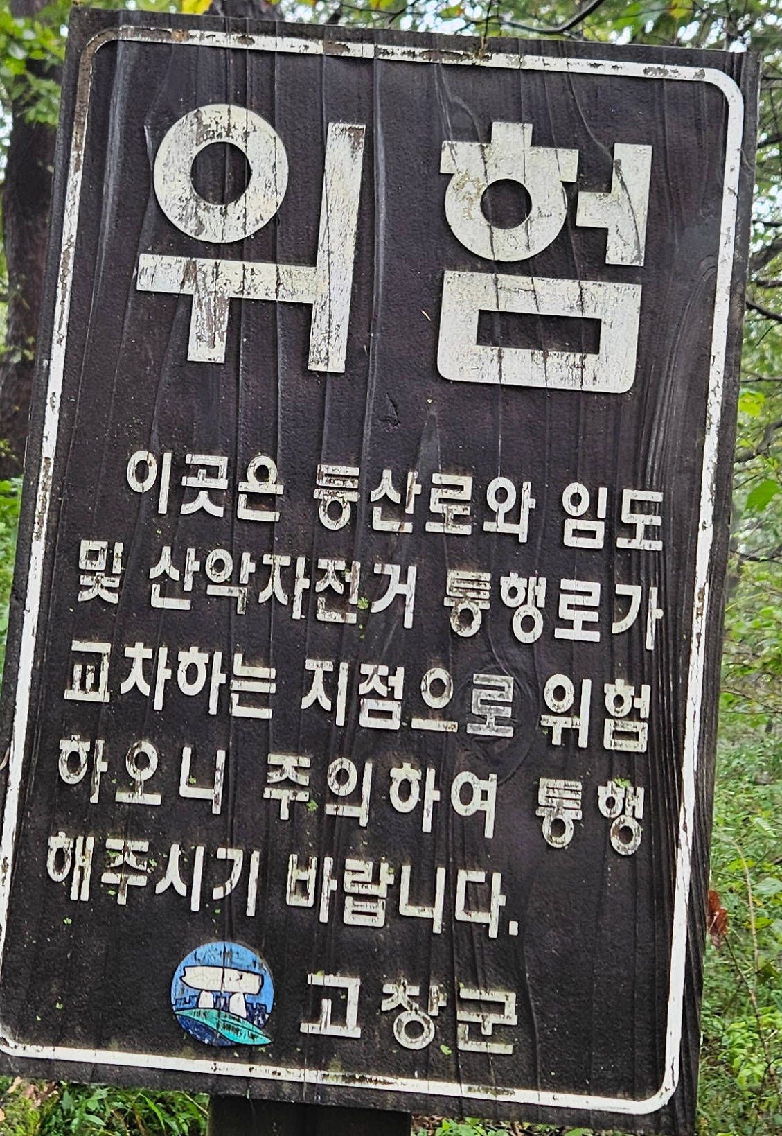 벽오봉이라는 정상목을 뒤로하고 문너머재 부근까지 평탄한 하산길을 걷는다. 이 길이 맞는지 의심스러워 한 번씩 다시 전자지도를 보지만 네이버 지도는 그것을 표시하지는 못하고 있다. 다만, 이정표와 길을 안내하는 지도가 있어 그것을 보고 걷는다. 문너머재에 도착하여 오른쪽으로 방향을 잡는다. 그 길은 등산로와 MTB길이 교차하는 구간이 있다. 안전에 주의해야 한다고 안내를 하고 있다. 억새봉은 재미있다. 패러글라이딩, MTB 그리고 등산이 있는 산이다. 급경사 내리막이 한참 동안 이어진다. 이곳에서부터 공설운동장까지는 4km다. 오늘은 더 이상 오를 길은 없고 내리막의 연속이라고 보면 될 것이다. 중간중간에 MTB와 등산로가 교차하는 만큼 주의하라는 안내표시가 있다.