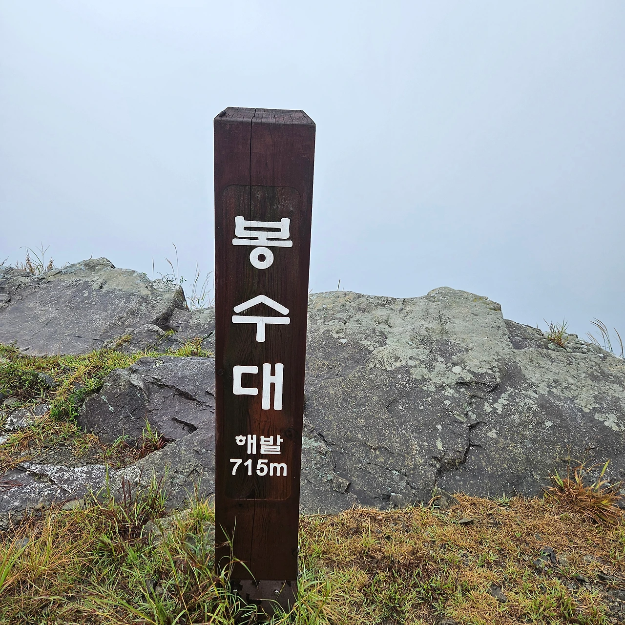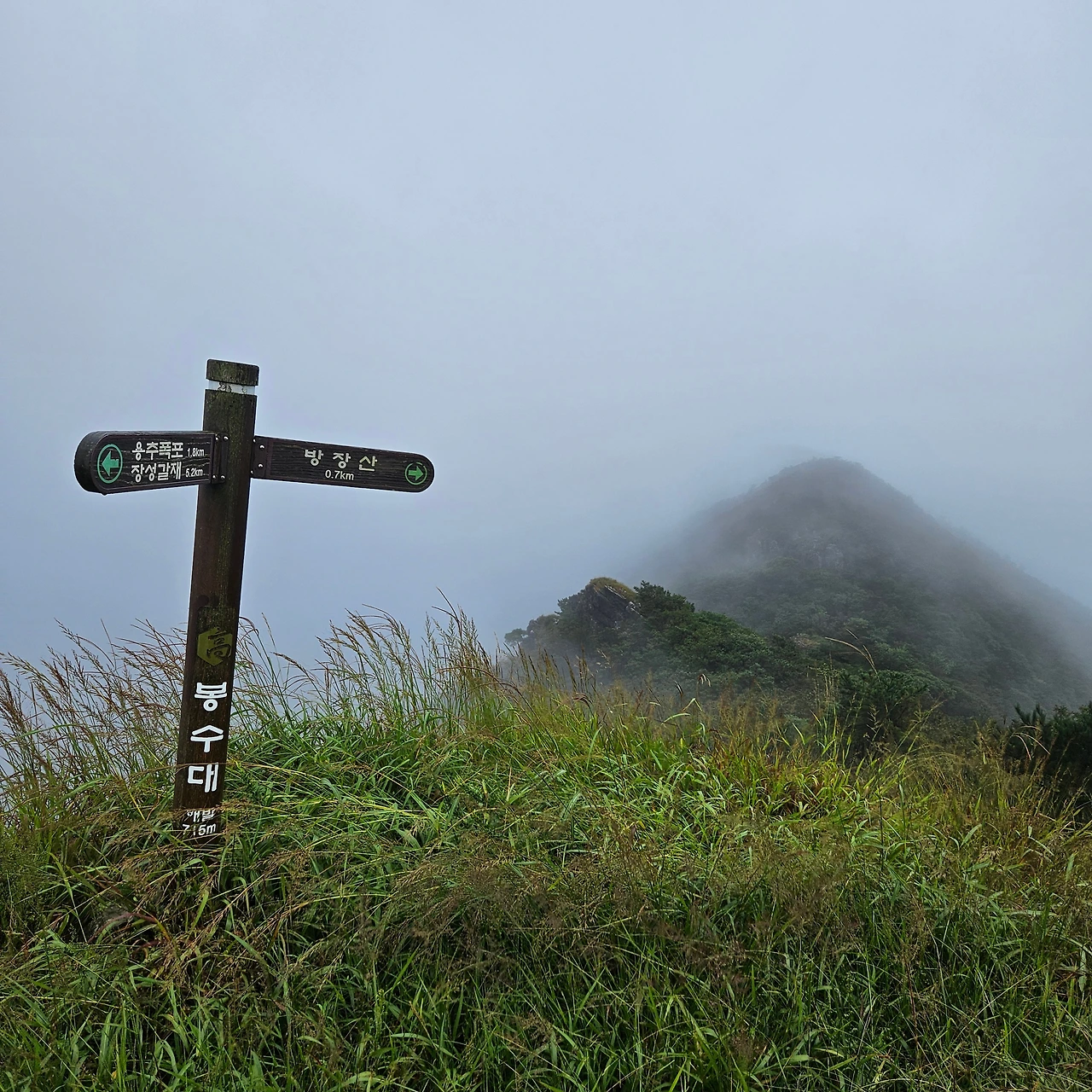이제는 봉수대를 지나고 방장상 정상으로 이동하면 된다. 비구름이 지나갔는지 이제는 비가 오지 않고 산안개 즉, 구름 속에 방장산이 된 것이다. 진한 곰탕을 걸었다고 보면 될 것이다. 등산로가 그렇게 나쁘지 않고 한 번씩 미끄러운 바위지역이 있으나 양옆에 안전펜스와 안전로프가 있어 문제없이 지날 수 있었다. 쓰리봉을 바로 내려와서 전망대가 있고 그곳에서 오른쪽과 왼쪽의 길이 있는데 오른쪽에 표지기가 있어 그곳으로 걸었다. 결론적으로 이 길이 맞는 것이었다. 혼자서 걸으면 고민을 한참 하여야겠지만, 셋이서 걸었다. 우리가 선두주자로서 다른 사람에 비하여 빠르게 쉬지 않고 걸었다.