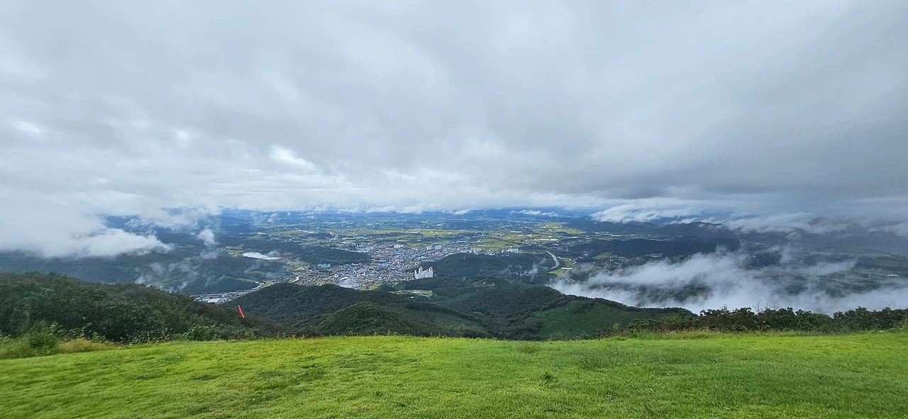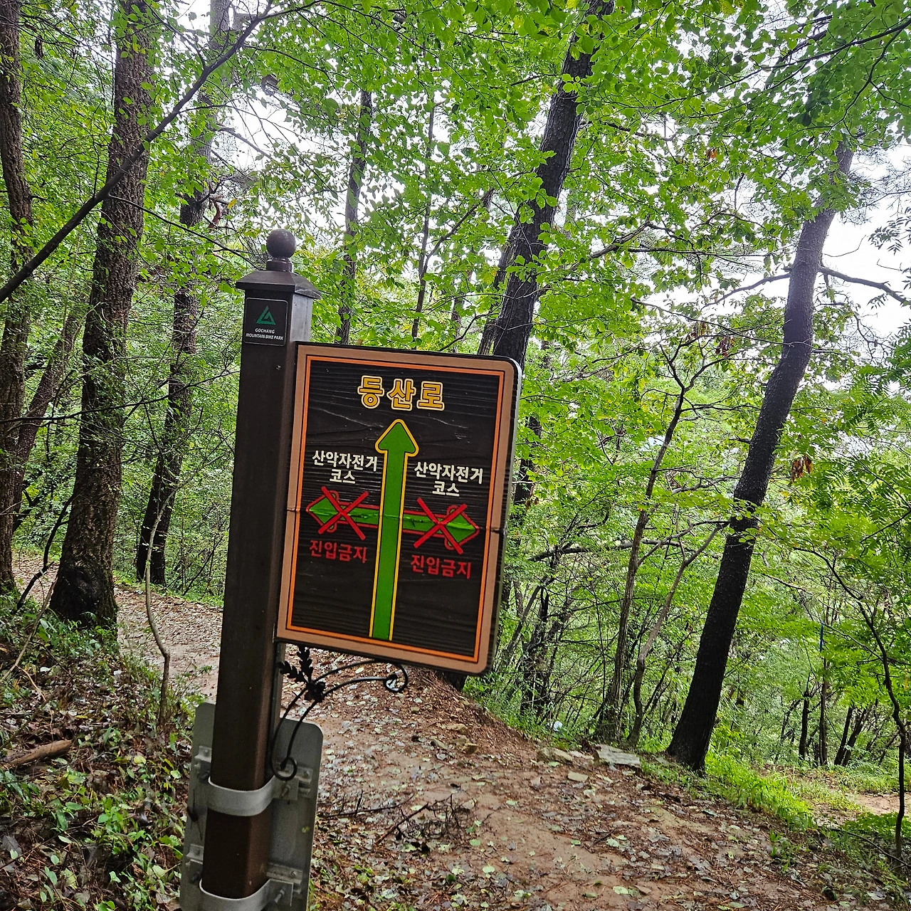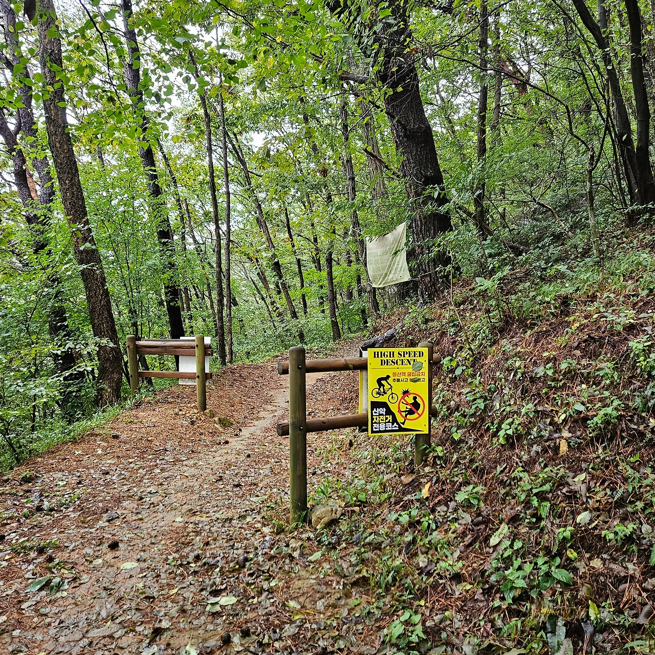 맑은 곰탕에서 진한 곰탕으로 바뀌고 있다. 하늘은 서서히 흐려지고 있다. 이제 다시 하늘에서 빗소리가 들린다. 그 빗소리를 들으면서 우산을 꺼내거나 우의를 다시 꺼낸다. 내려가면서 볼 것은 없지만 넓은 등산로에 중간중간에 MTB길이 교차를 하면서 조심하라고 안내를 한다. 그리고 마지막 10m 정도를 오르고 하산을 한다. 공설운동장 주변에 주차해 둔 자동차가 많다....