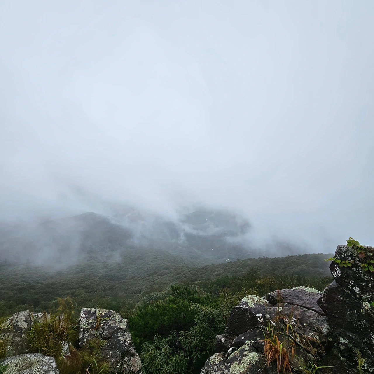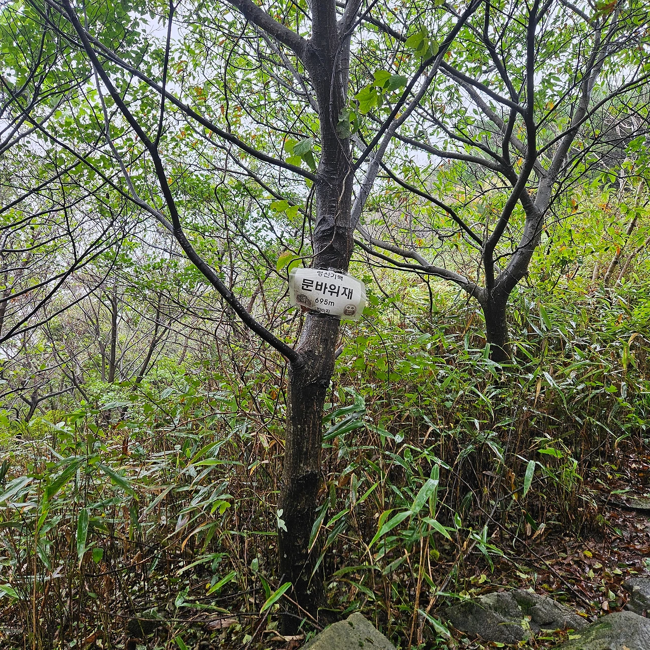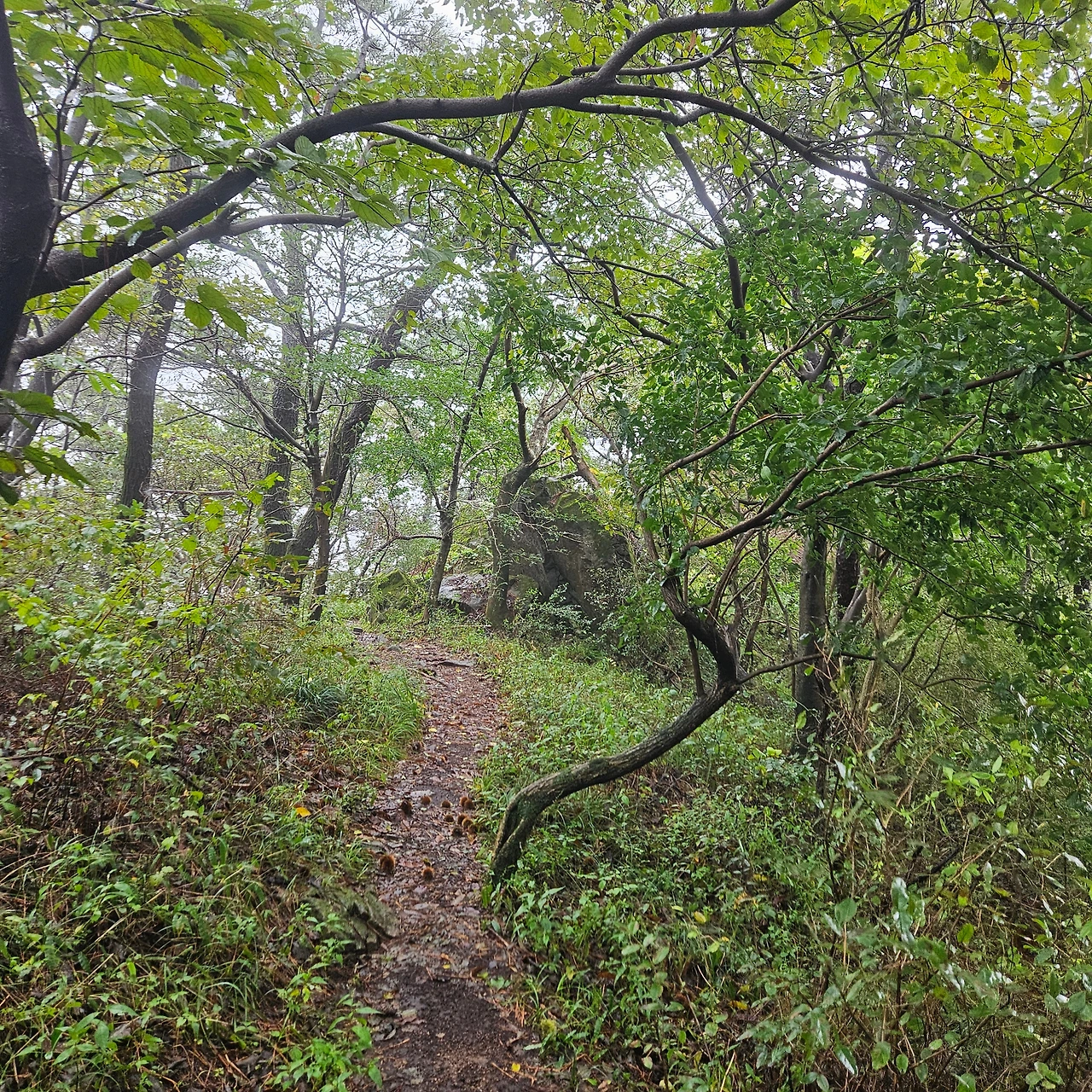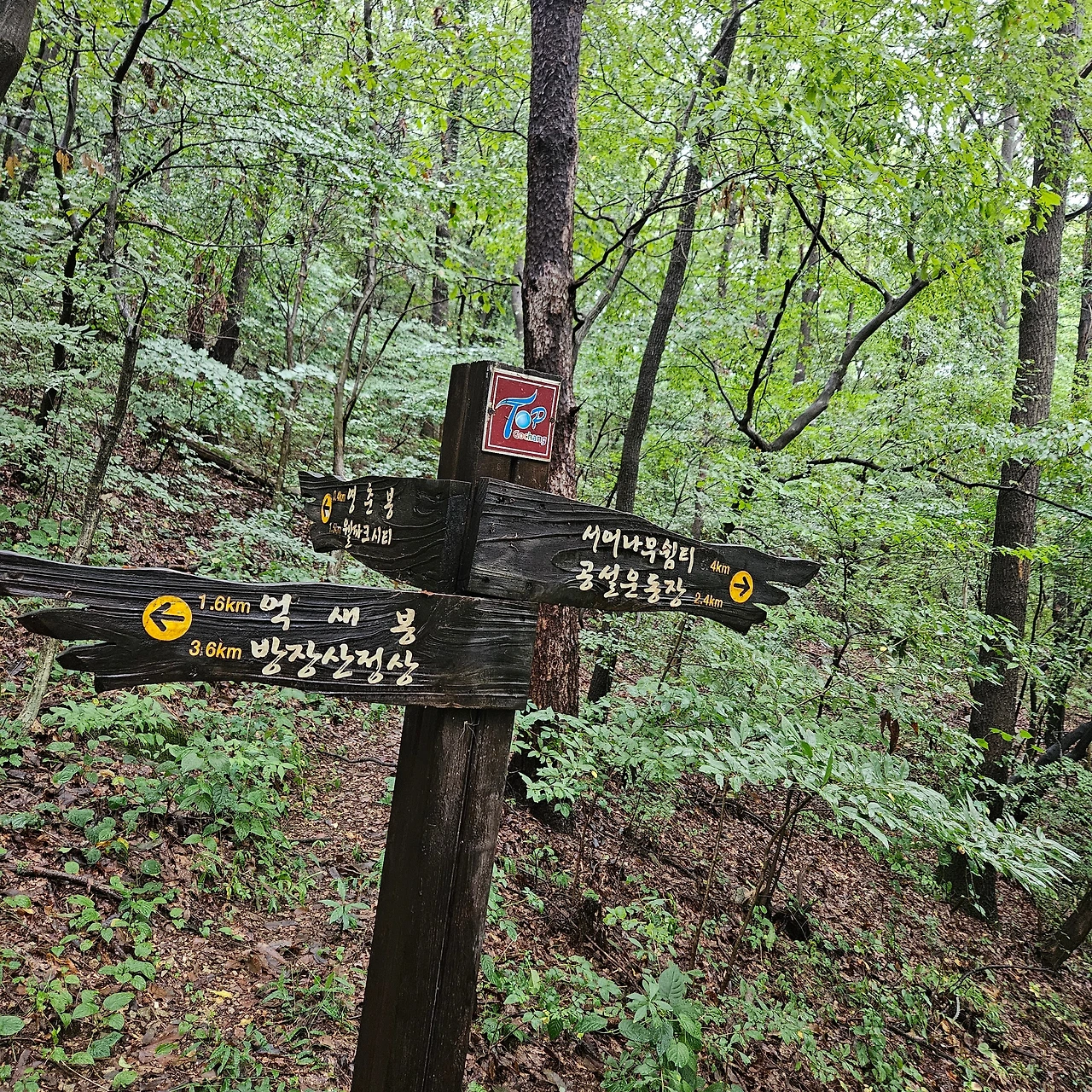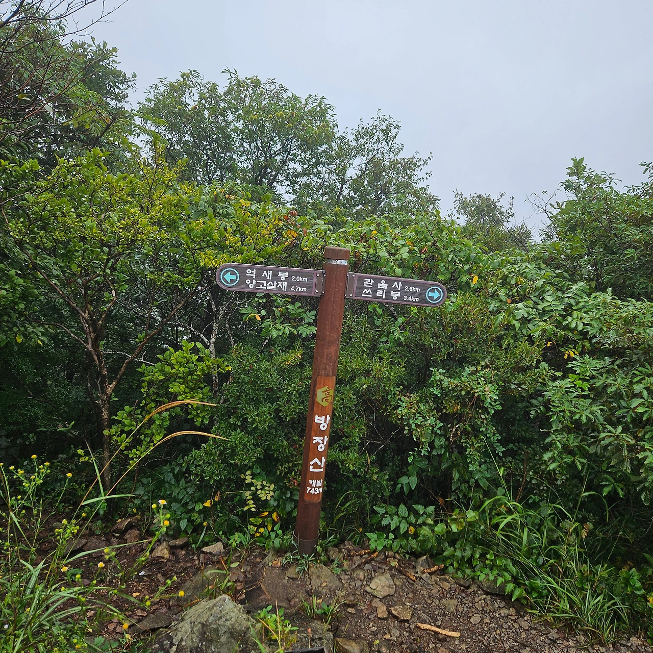 쓰리봉까지 오르고 오른다. 등산로 주변은 조릿대, 산죽이 주변을 장악하고 있다. 그 산죽사이를 가로지르면 쓰리봉까지 오른다. 비는 오고 앞이 잘 보이지 않지만 가파른 오르막이 우리 앞을 가로막고 있고 등산로를 따라 내린 비가 개울을 만들고 있다. 그 개울을 가로질러 산을 오른다고 보아야 할 것이다. 인간이 만들어 놓은 등산로가 이제는 개울이 되어 흐른다. 쓰리봉을 가기 전 전망대가 있지만 스치듯이 지나간다. 예전에는 써리봉이었는데 어느 순간 쓰리봉이 되었다고 한다. 지리산의 써리봉과 같은 의미로 울퉁불퉁한 바위들이 모여 있어 농기구의 써레와 같은 의미였는데 어느 순가 쓰리봉이 되었다고 한다.
