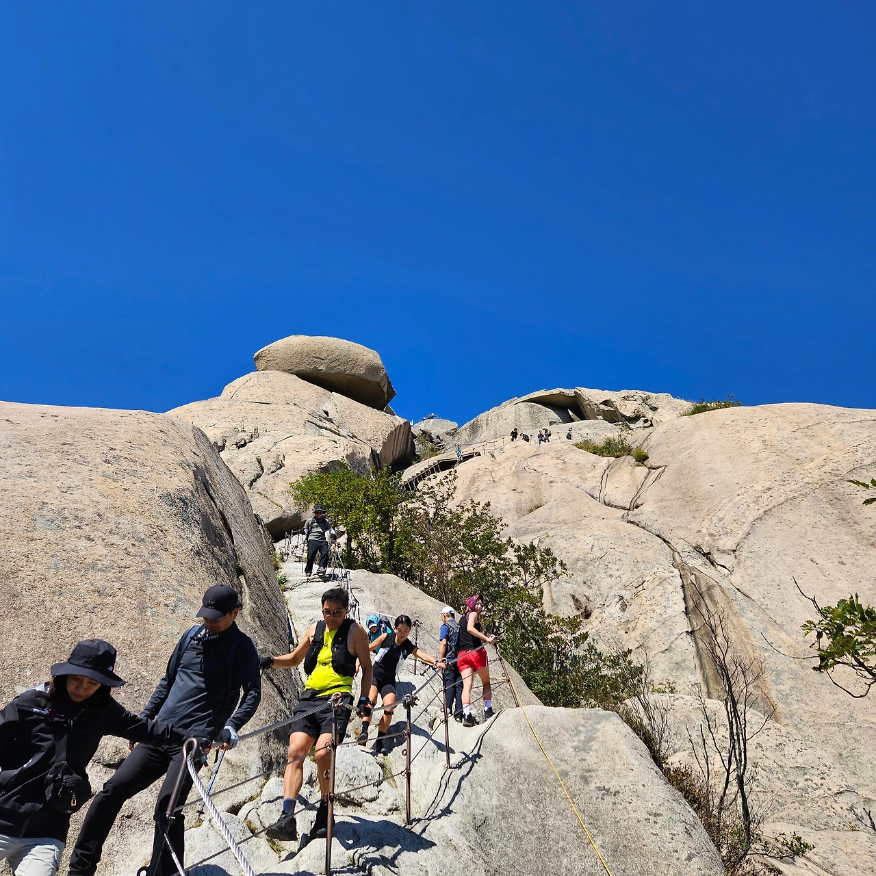 우리도 준비를 한다. 스틱을 접어서 배낭에 넣고 두 손을 안전펜스를 잡고 오를 것이다. 주말에는 오르는 길과 내려오는 길이 복잡하여 한 번씩 호흡을 가다듬어야 하는데 오늘은 그냥 오른다. 내려오는 사람도 드문드문이다. 9월 30일이 지나면 이길도 복잡해질 것이다. 백운대를 오르는 사람들 중 1/3은 외국인이다. 우리가 외국에 나갔을 때 근교 산행을 한 기억이 있는 것처럼 외국인들도 서울을 방문하였다가 근교산행을 하는 것이다. 그리고 근교산행을 하면서 백운대를 오르면 이것처럼 좋은 것이 없을 것이다.